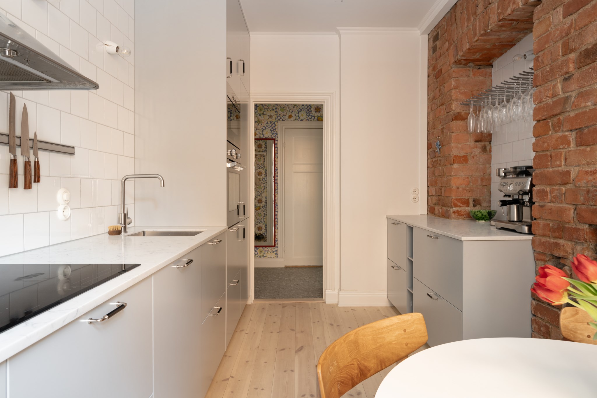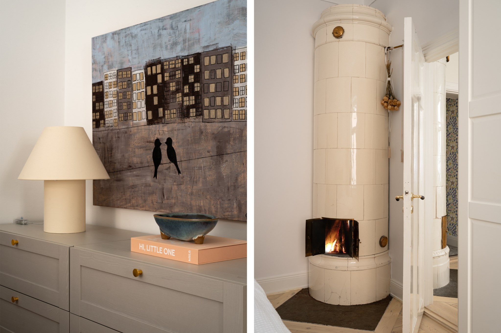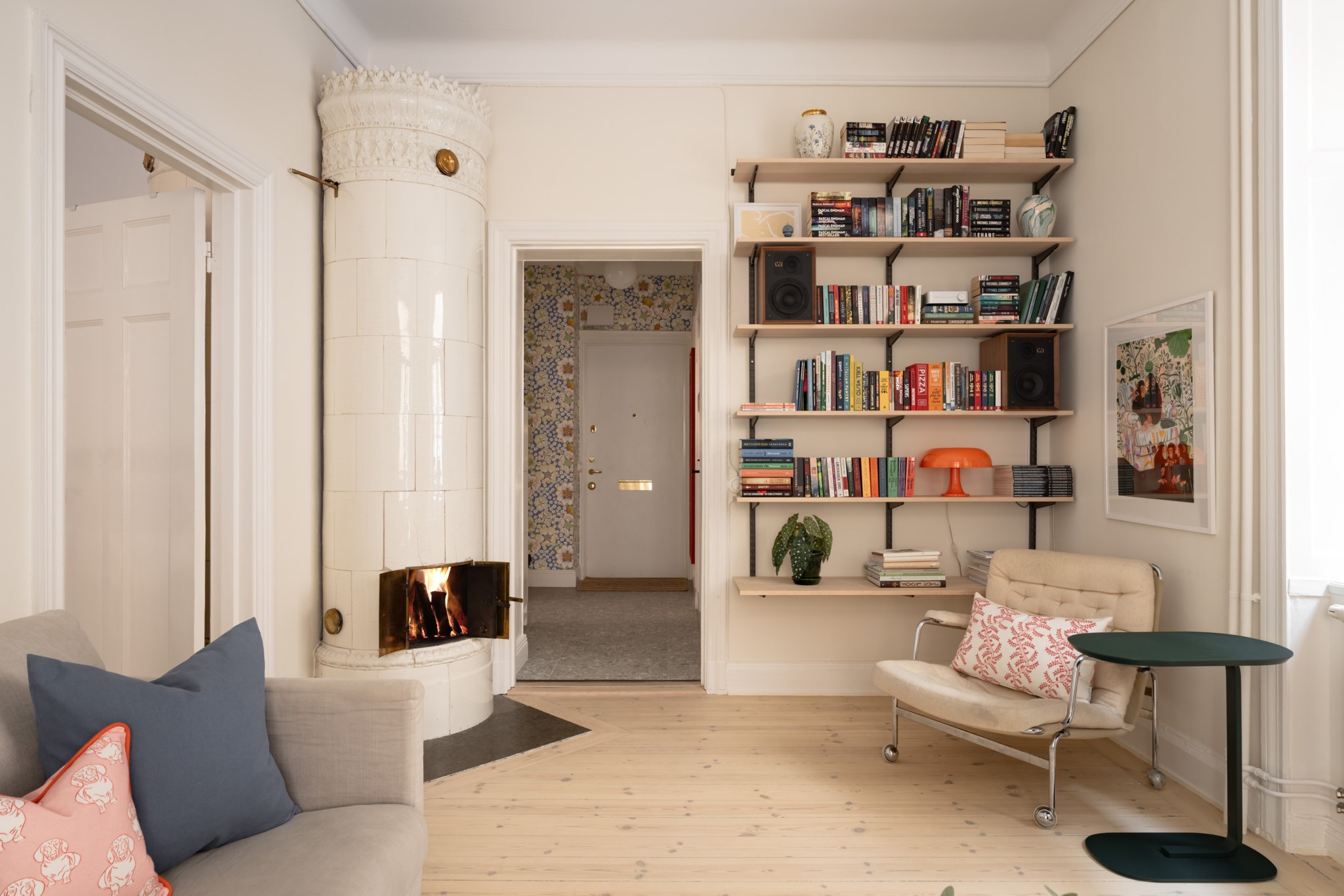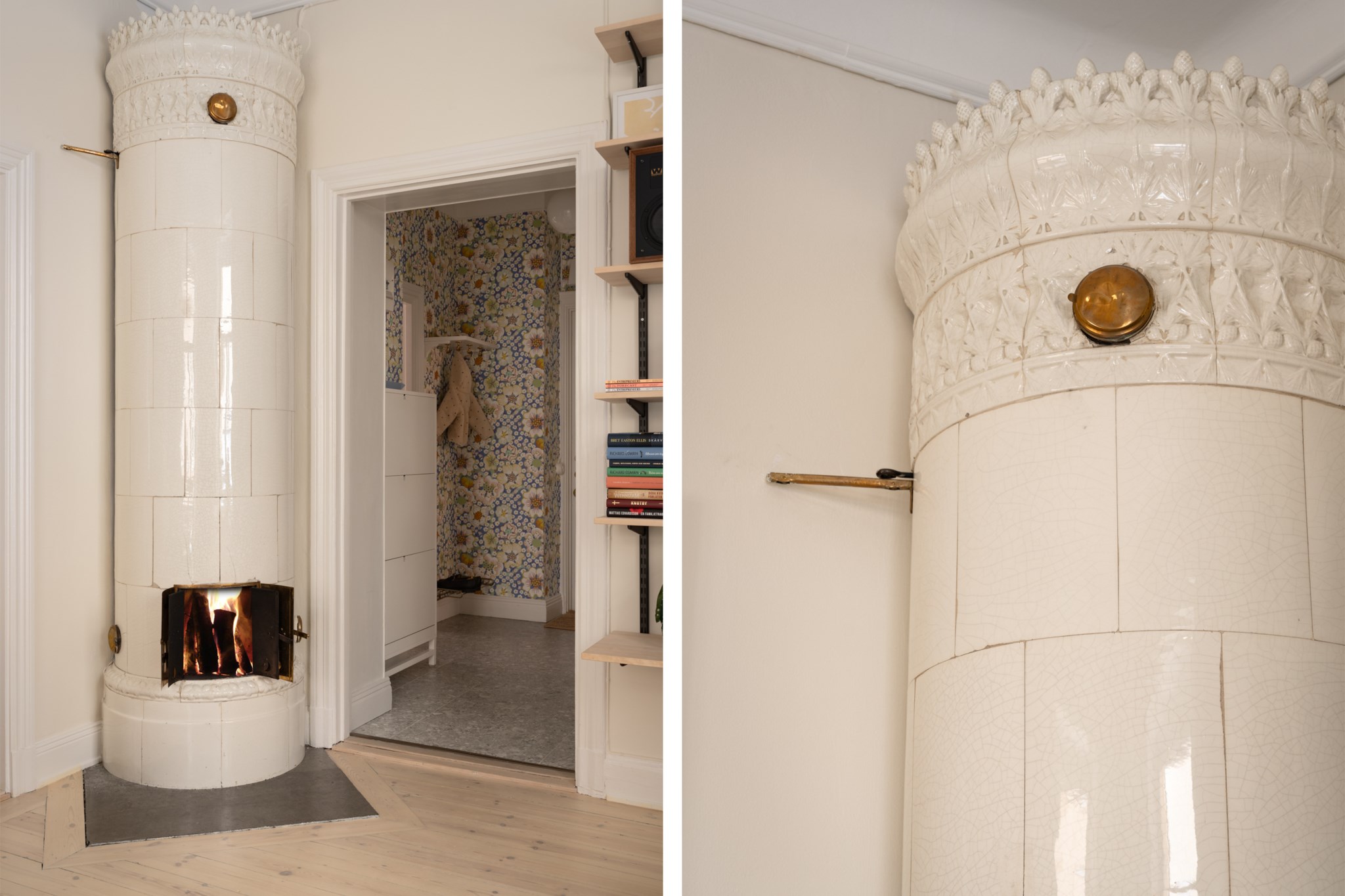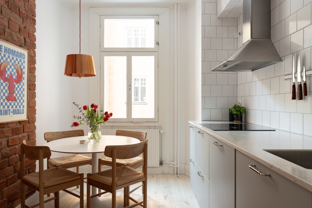 Vardagsrummet ligger i eftertraktat hörnläge och rymmer både soffgrupp och matplats. Här finns en av bostadens två fungerande kakelugnar samt utgång till balkongen i sydvästläge med härlig eftermiddagssol. Ljusa trägolv och harmoniska färgval skapar en varm och inbjudande atmosfär. Hallen välkomnar med eleganta tapeter från Svenskt Tenn som sätter tonen för bostadens tidlösa karaktär. Köket är stilrent med grå skåpsluckor, ljusa arbetsytor och klassiskt kakel. Matplatsen vid fönstret ramas in av en charmig tegelvägg som ger rummet karaktär. Sovrummet är rofyllt och rymligt med plats för dubbelsäng och förvaring samt ytterligare en fungerande kakelugn. Det helkaklade badrummet är utfört i vitt kakel med tidlöst svartvitt chackmönstrat golv. En välplanerad och mycket trivsam sekelskifteslägenhet med balkong, kakelugnar och ett oslagbart läge på Birger Jarlsgatan – ett hem med både själ och stil.