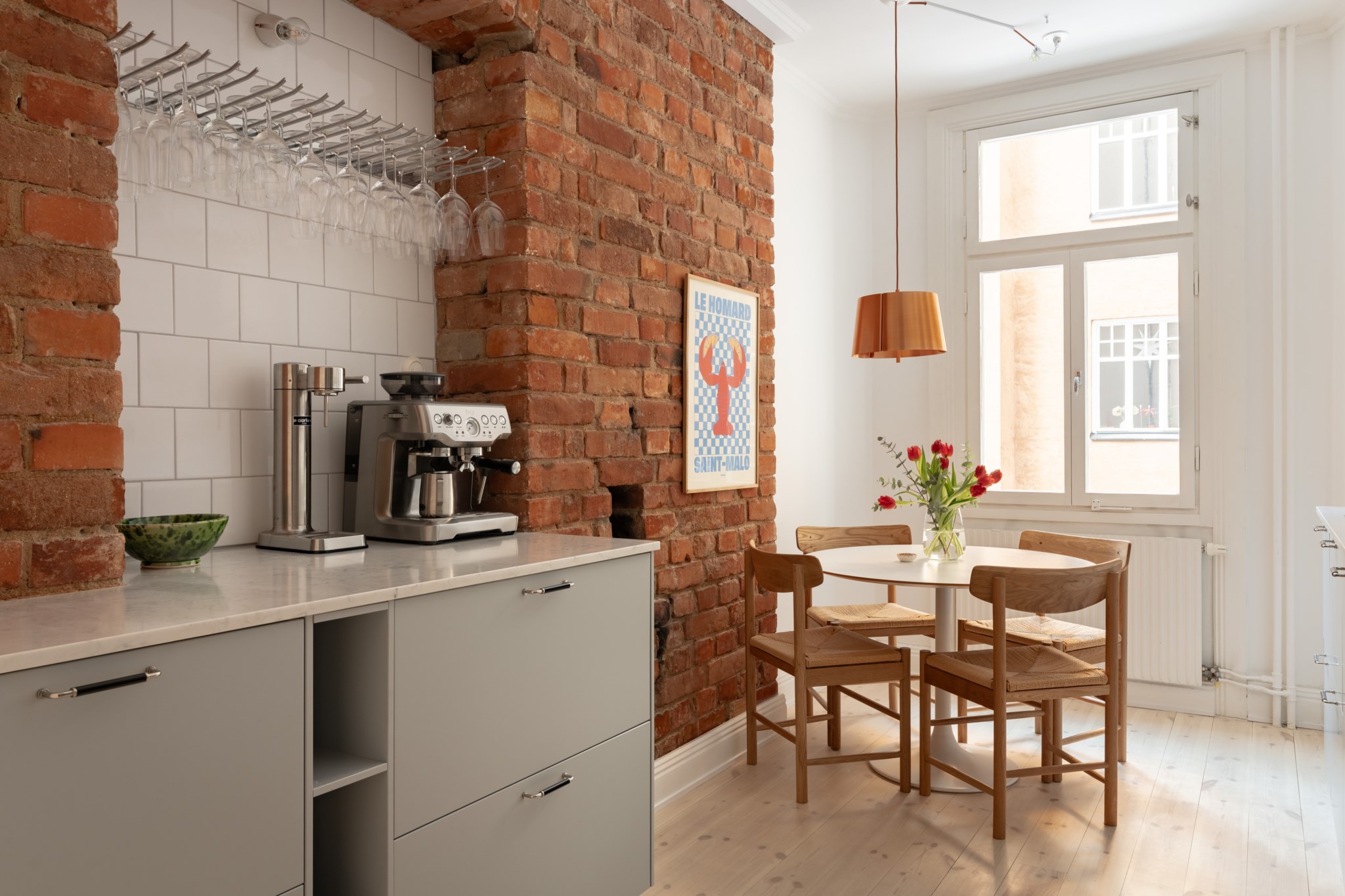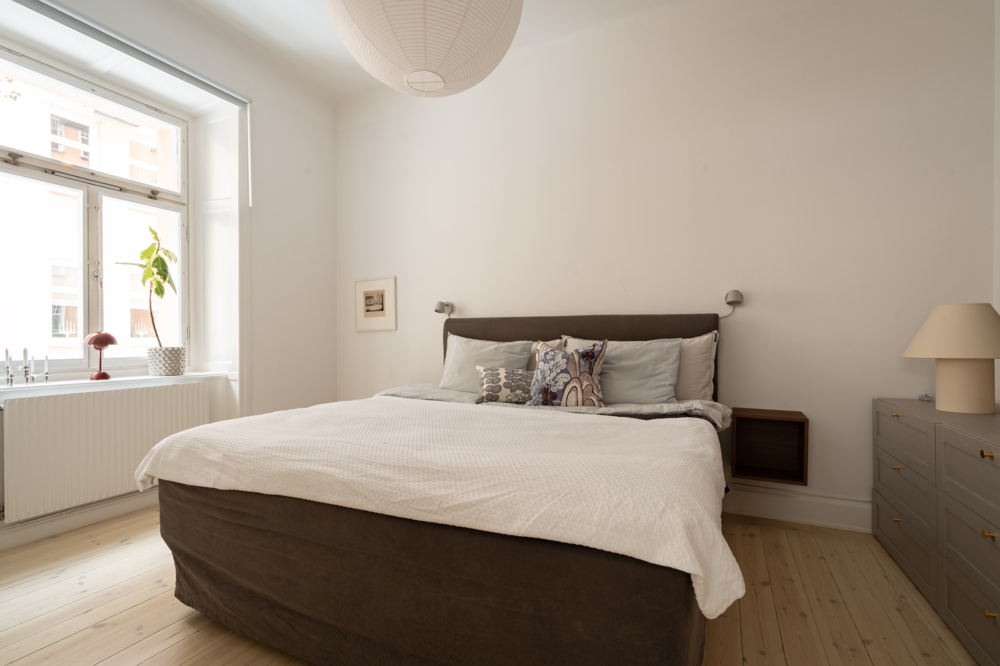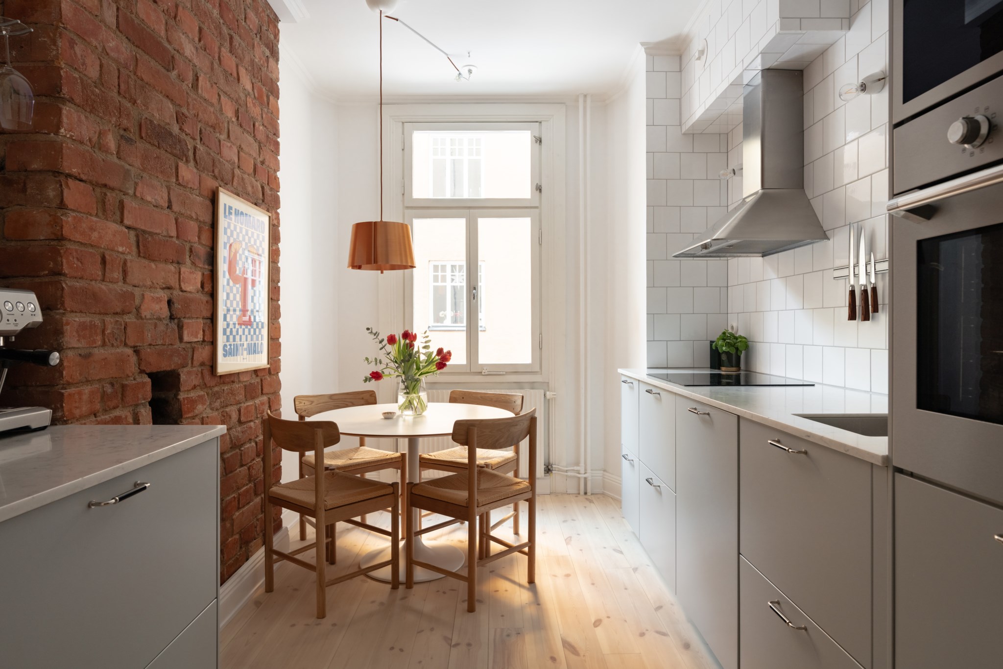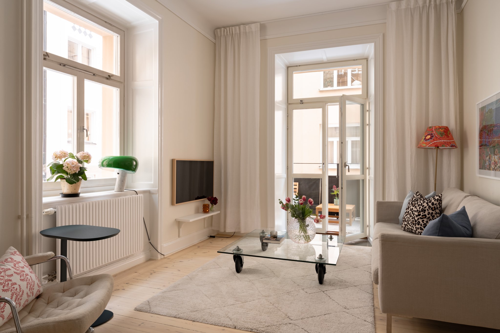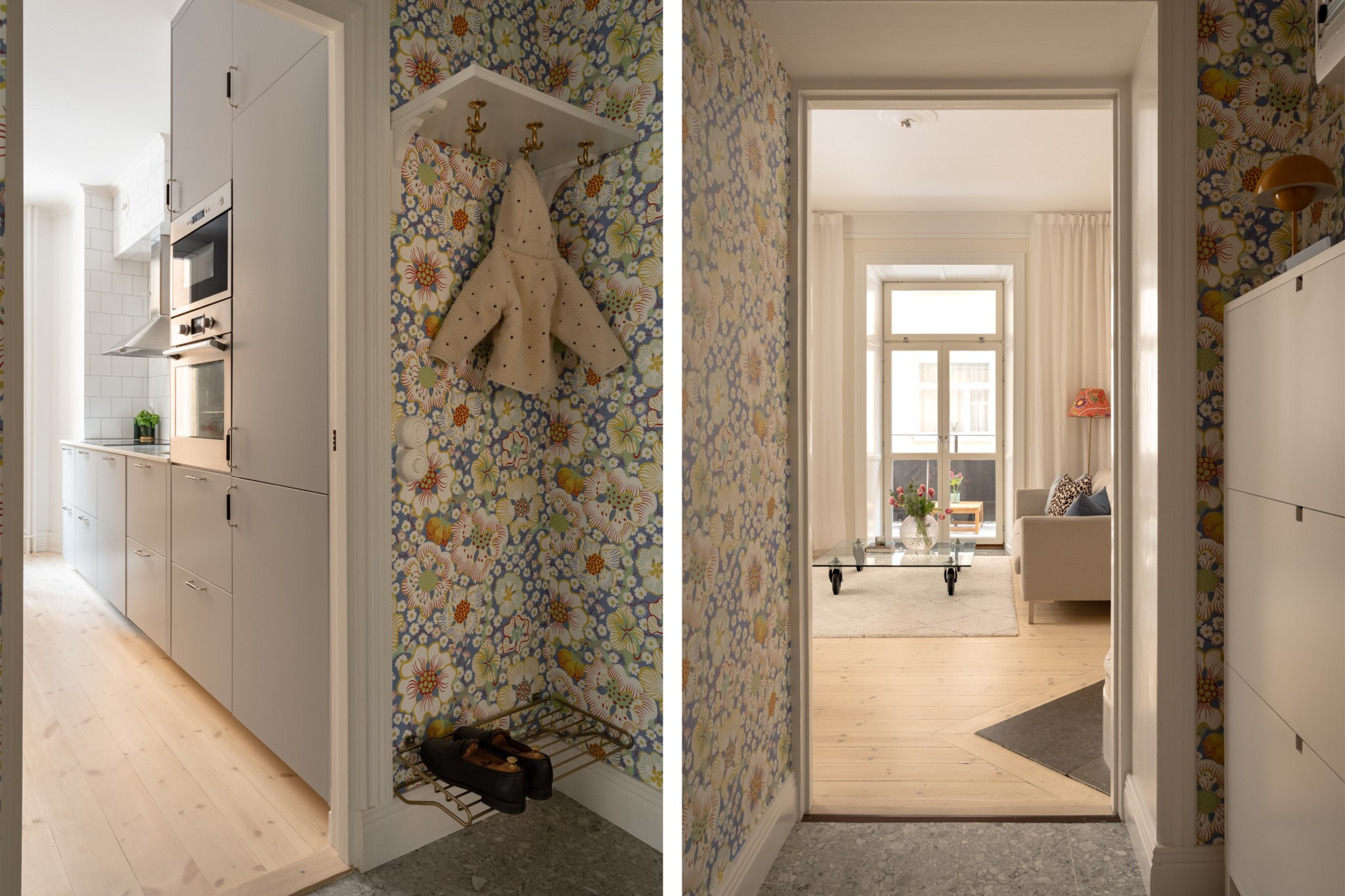 Vardagsrummet ligger i eftertraktat hörnläge och rymmer både soffgrupp och matplats. Här finns en av bostadens två fungerande kakelugnar samt utgång till balkongen i sydvästläge med härlig eftermiddagssol. Ljusa trägolv och harmoniska färgval skapar en varm och inbjudande atmosfär. Hallen välkomnar med eleganta tapeter från Svenskt Tenn som sätter tonen för bostadens tidlösa karaktär. Köket är stilrent med grå skåpsluckor, ljusa arbetsytor och klassiskt kakel. Matplatsen vid fönstret ramas in av en charmig tegelvägg som ger rummet karaktär. Sovrummet är rofyllt och rymligt med plats för dubbelsäng och förvaring samt ytterligare en fungerande kakelugn. Det helkaklade badrummet är utfört i vitt kakel med tidlöst svartvitt chackmönstrat golv. En välplanerad och mycket trivsam sekelskifteslägenhet med balkong, kakelugnar och ett oslagbart läge på Birger Jarlsgatan – ett hem med både själ och stil.