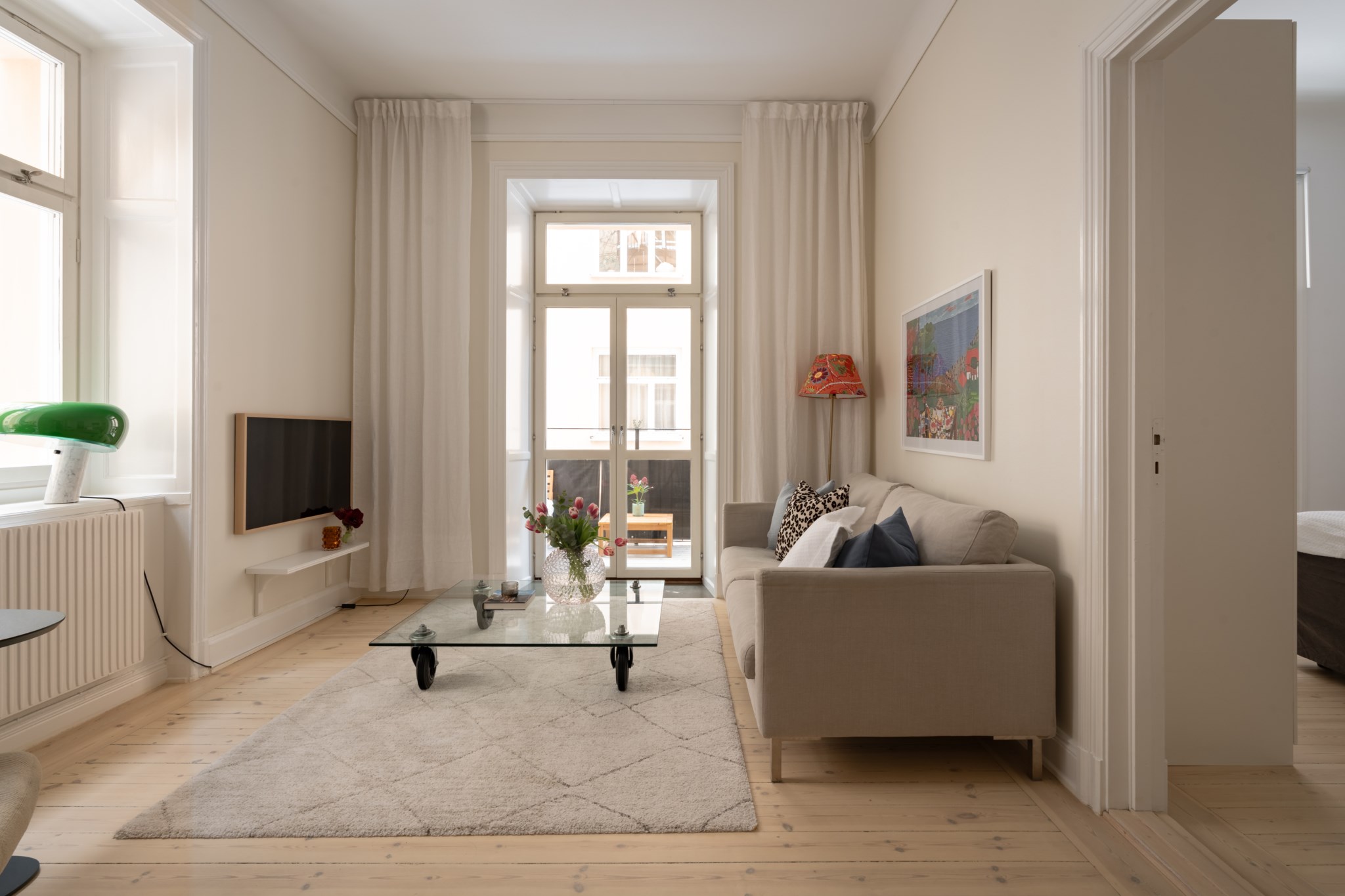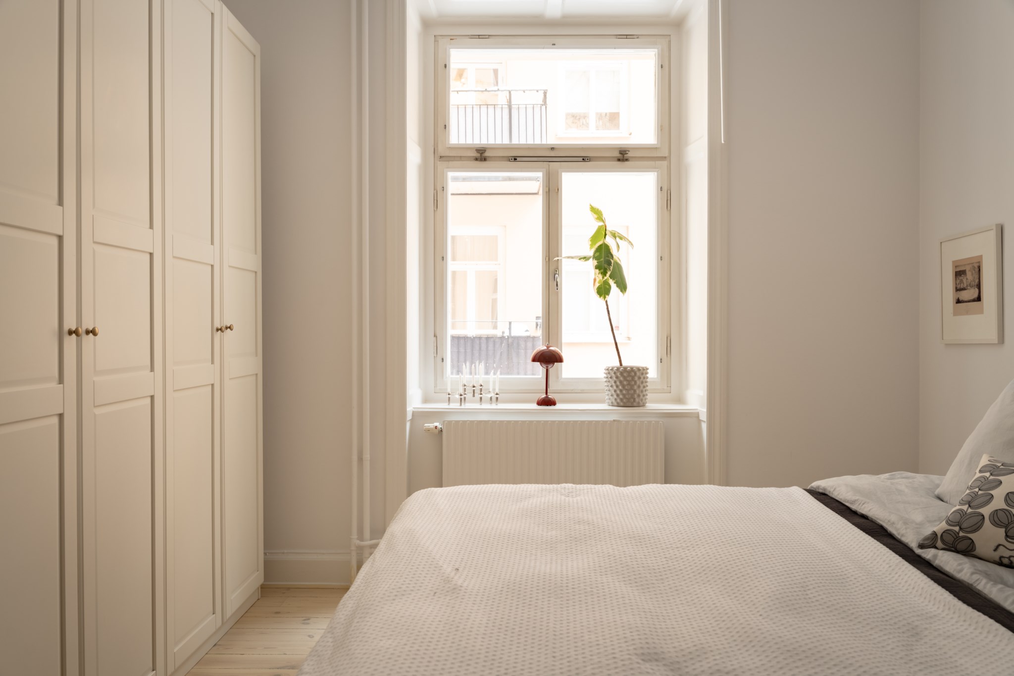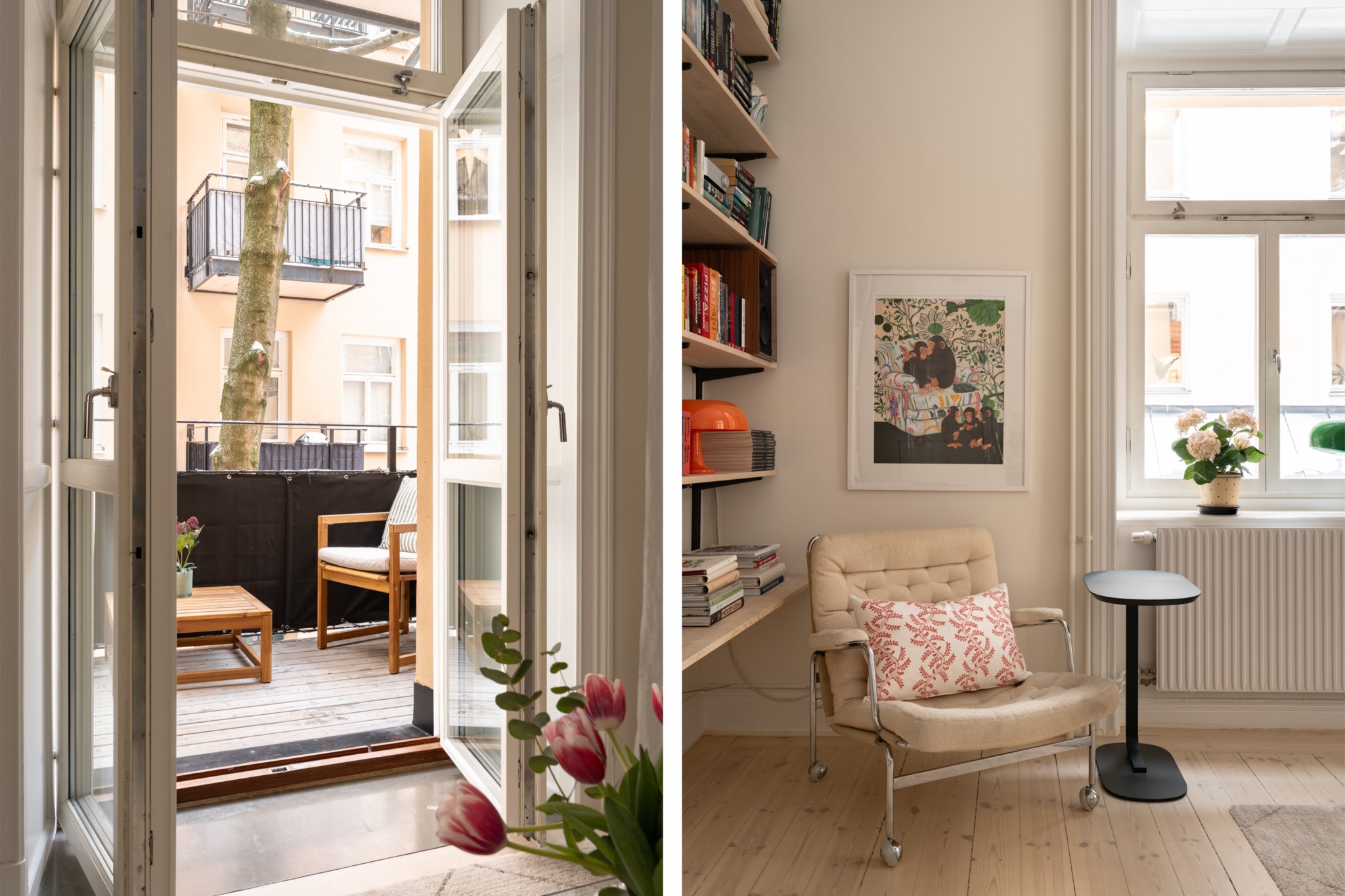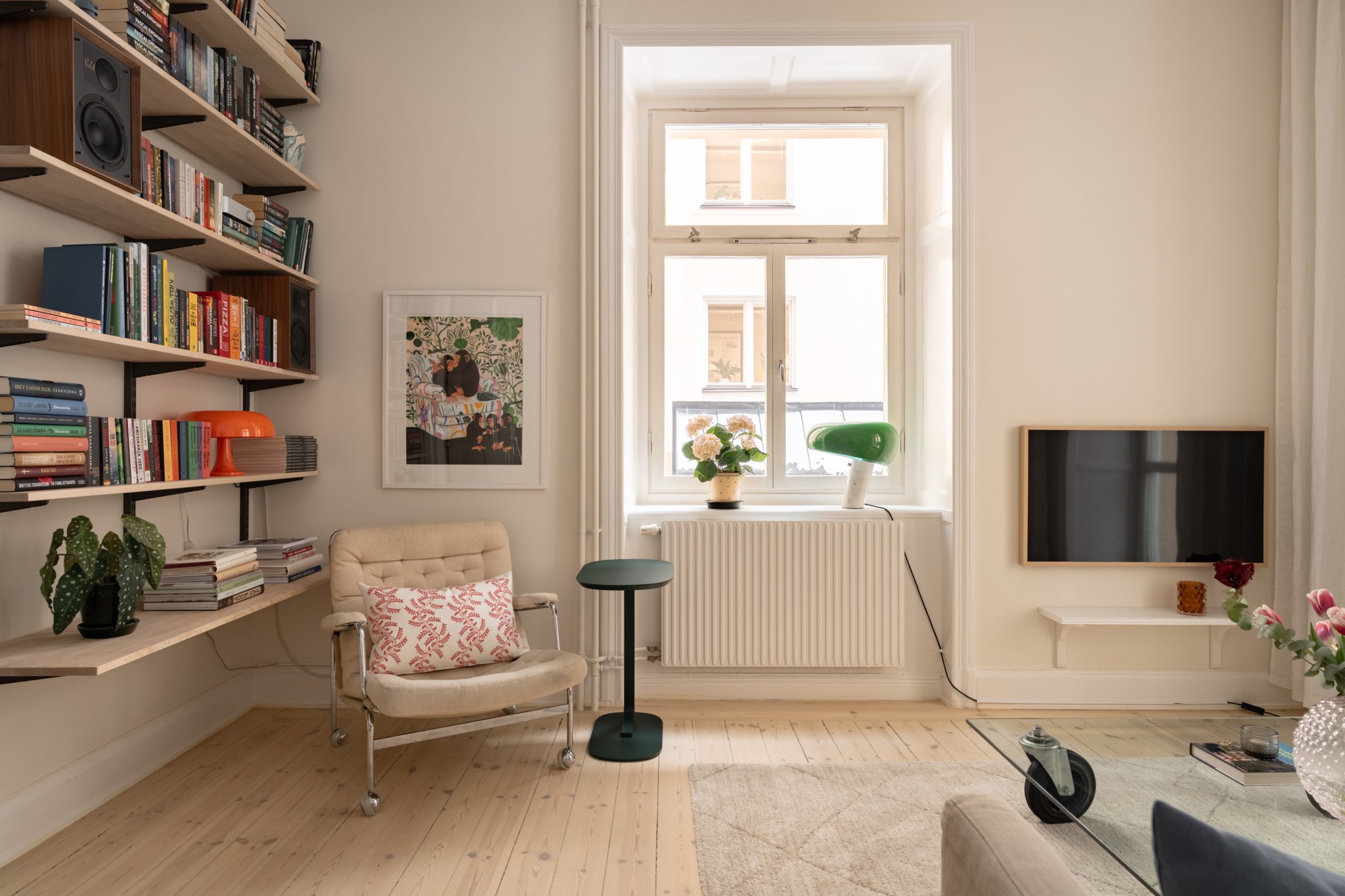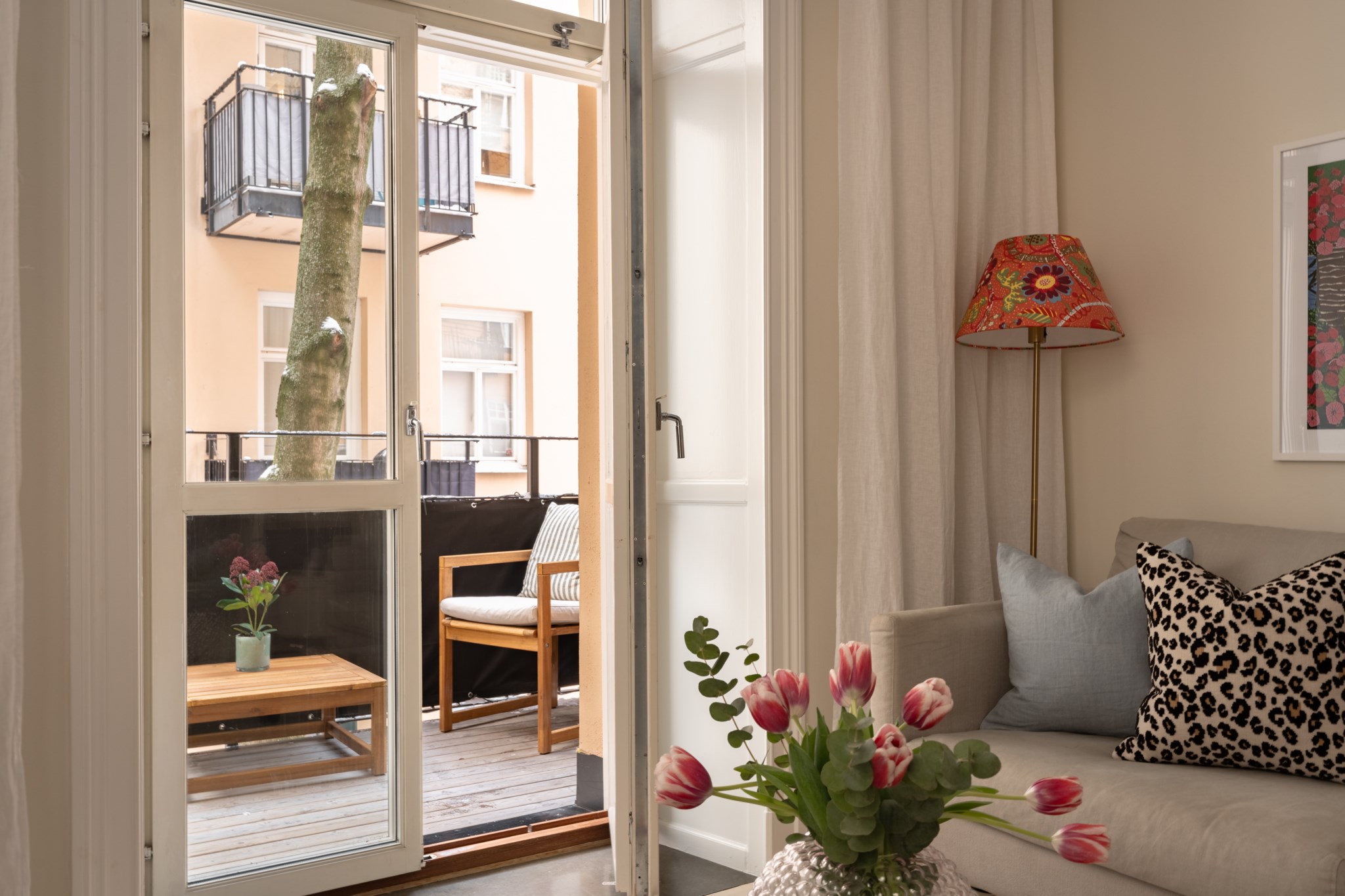 Vardagsrummet ligger i eftertraktat hörnläge och rymmer både soffgrupp och matplats. Här finns en av bostadens två fungerande kakelugnar samt utgång till balkongen i sydvästläge med härlig eftermiddagssol. Ljusa trägolv och harmoniska färgval skapar en varm och inbjudande atmosfär. Hallen välkomnar med eleganta tapeter från Svenskt Tenn som sätter tonen för bostadens tidlösa karaktär. Köket är stilrent med grå skåpsluckor, ljusa arbetsytor och klassiskt kakel. Matplatsen vid fönstret ramas in av en charmig tegelvägg som ger rummet karaktär. Sovrummet är rofyllt och rymligt med plats för dubbelsäng och förvaring samt ytterligare en fungerande kakelugn. Det helkaklade badrummet är utfört i vitt kakel med tidlöst svartvitt chackmönstrat golv. En välplanerad och mycket trivsam sekelskifteslägenhet med balkong, kakelugnar och ett oslagbart läge på Birger Jarlsgatan – ett hem med både själ och stil.