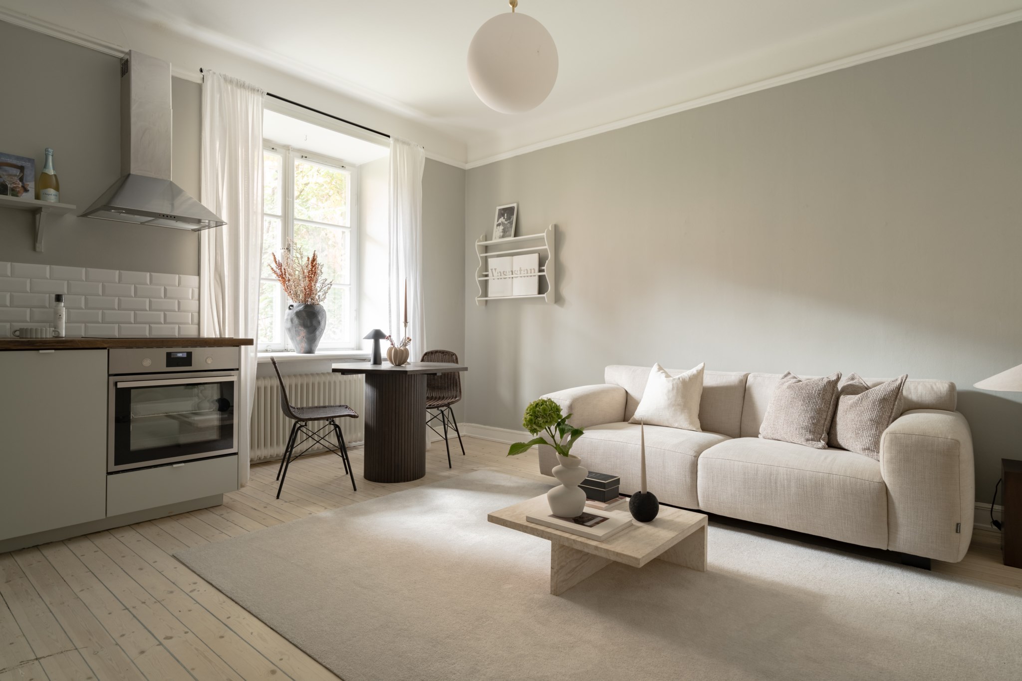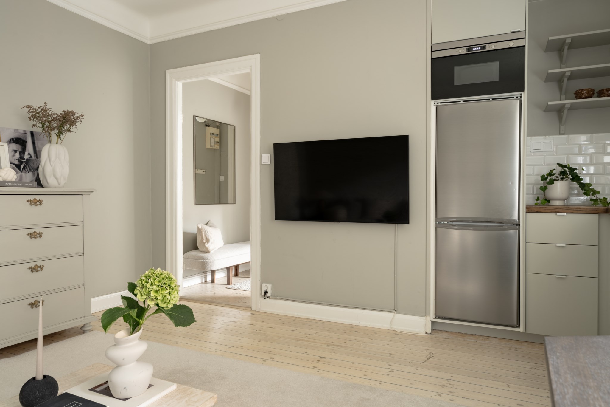 Denna väldisponerade minitvåa erbjuder allt ni kan önska – ett stilrent kök med diskmaskin och öppen planlösning mot vardagsrummet. Här finns gott om plats för både matlagning och umgänge i en harmonisk miljö. Det generösa sovrummet rymmer både dubbelsäng och förvaring, och badrummet är nyrenoverat med golvvärme och moderna ytskikt.