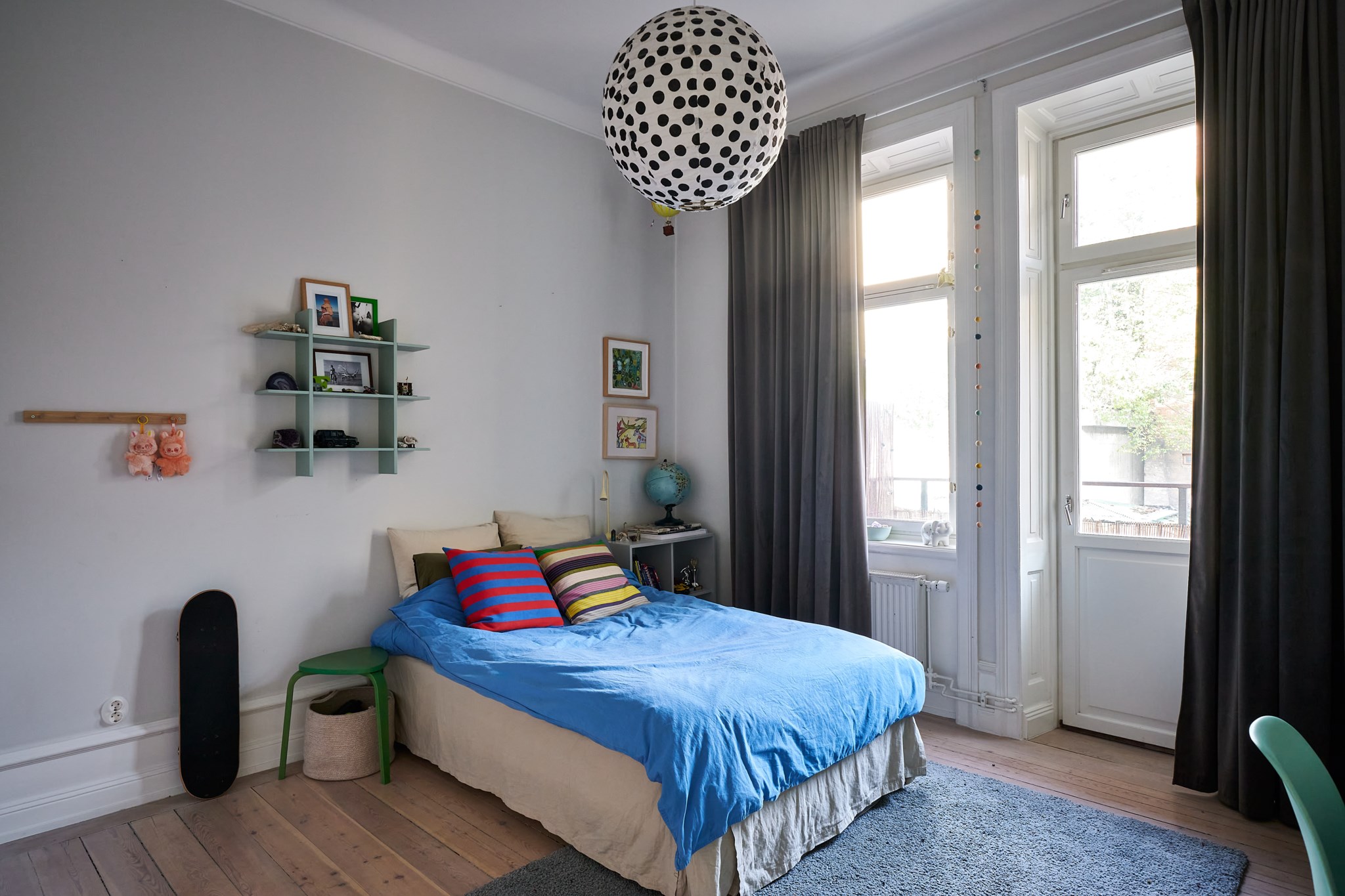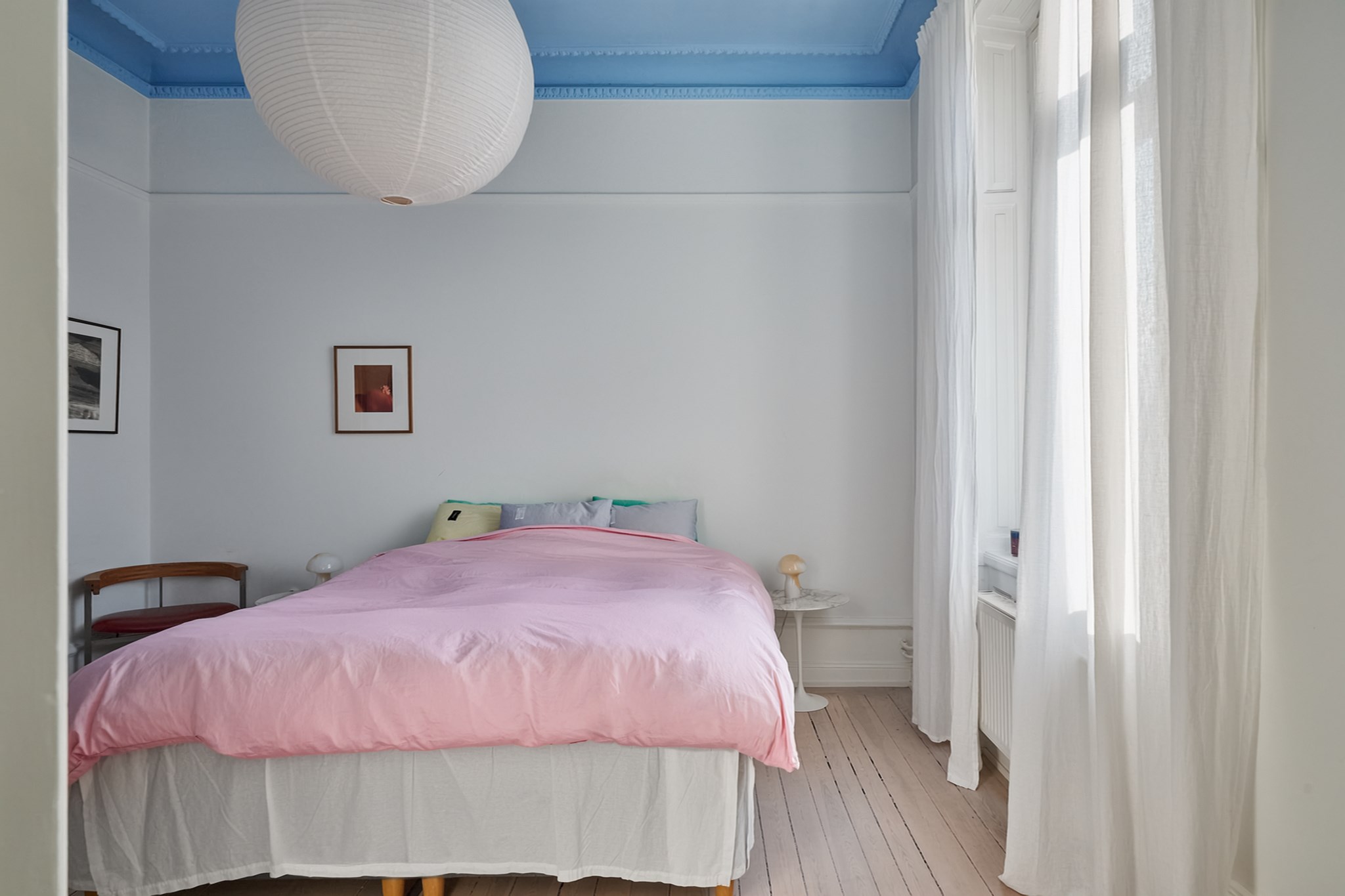 Välproportionerat sovrum med högt fönster som ger ett fint och jämnt ljusinsläpp över rummet. Fönstrets placering gör rummet lättmöblerat och skapar en lugn känsla utan direkt insyn. Rummet har inbyggd garderob som erbjuder praktisk förvaring och bidrar till en ordnad helhet. Ljusa väggar i samspel med trägolv och den generösa takhöjden ger rummet karaktär och rymd. Utgång till balkong från detta rum.
