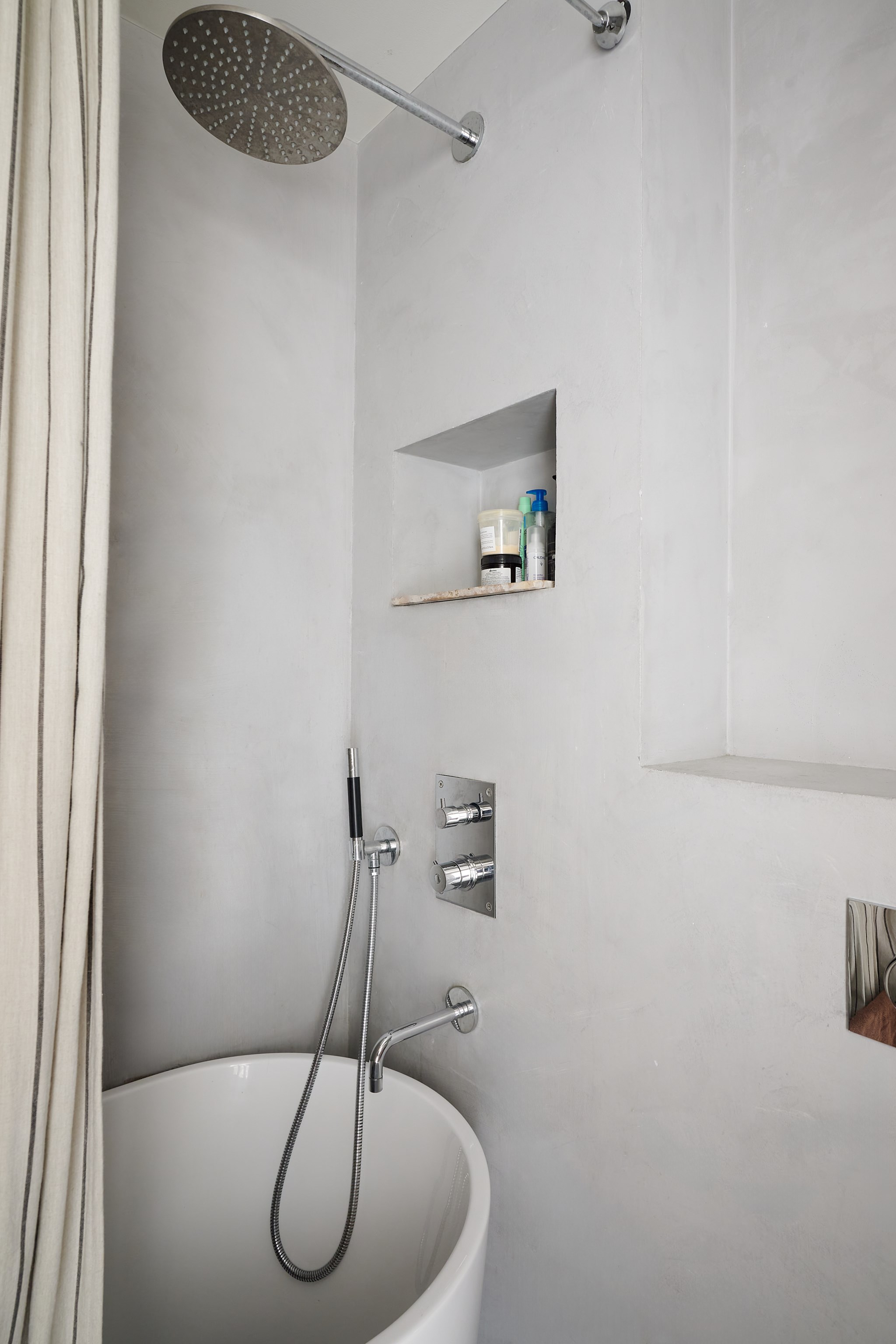 Stilrent badrum från 2020 med enhetliga ytskikt i ljus microcement som ger ett modernt och sobert uttryck. Utrustat med badkar med takdusch och duschvägg samt infällda hyllor för praktisk förvaring. Handfat med kommod i trä. Tvättmaskin och torktumlare är praktiskt placerade i garderob. Ett funktionellt och välplanerat badrum med god komfort.