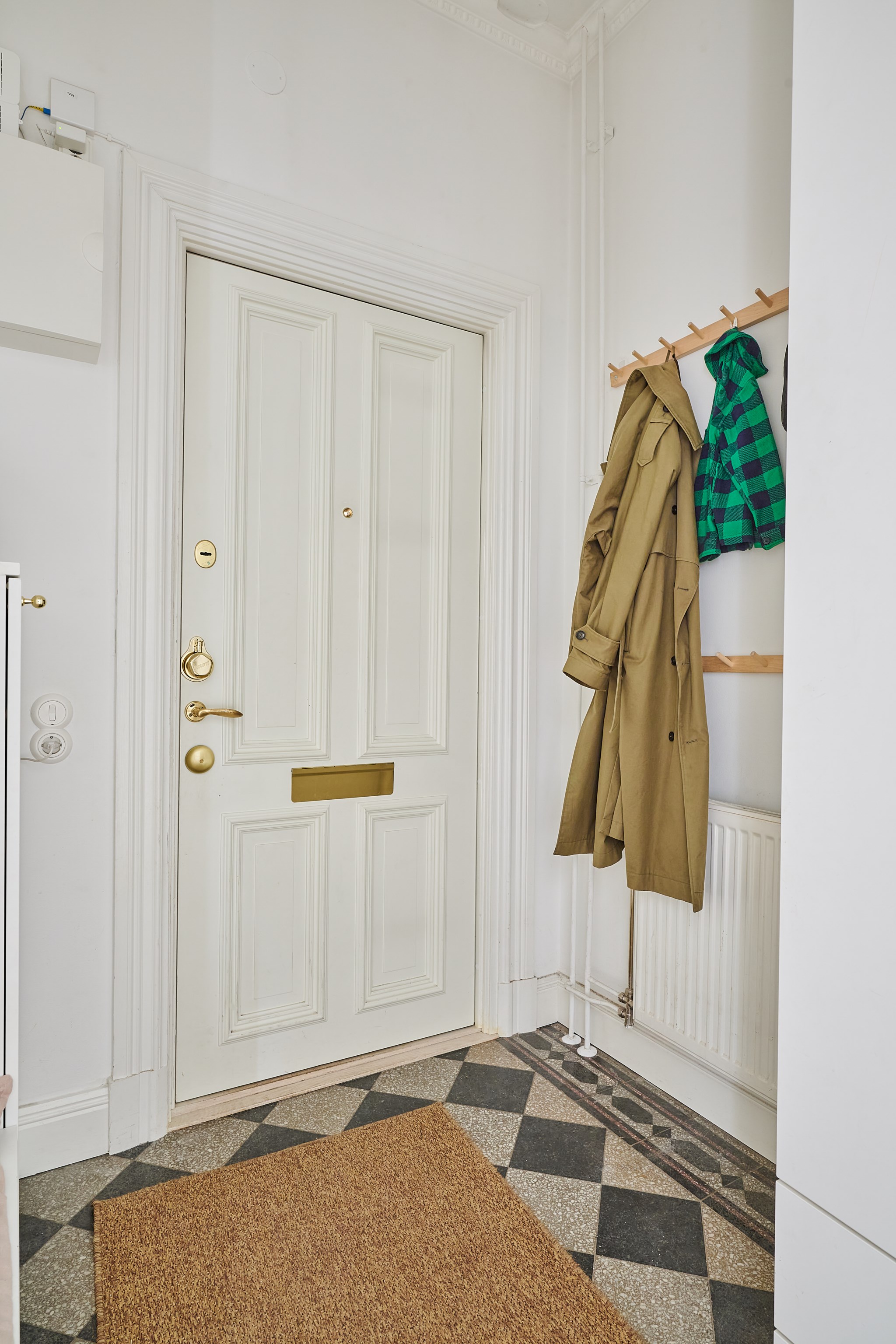 Välkomnande hall med ljusa väggar och vackert golv som direkt ger ett gott första intryck. Här finns plats för avhängning samt förvaring i garderober. Hallen är centralt placerad och binder samman bostadens olika rum på ett naturligt och funktionellt sätt.