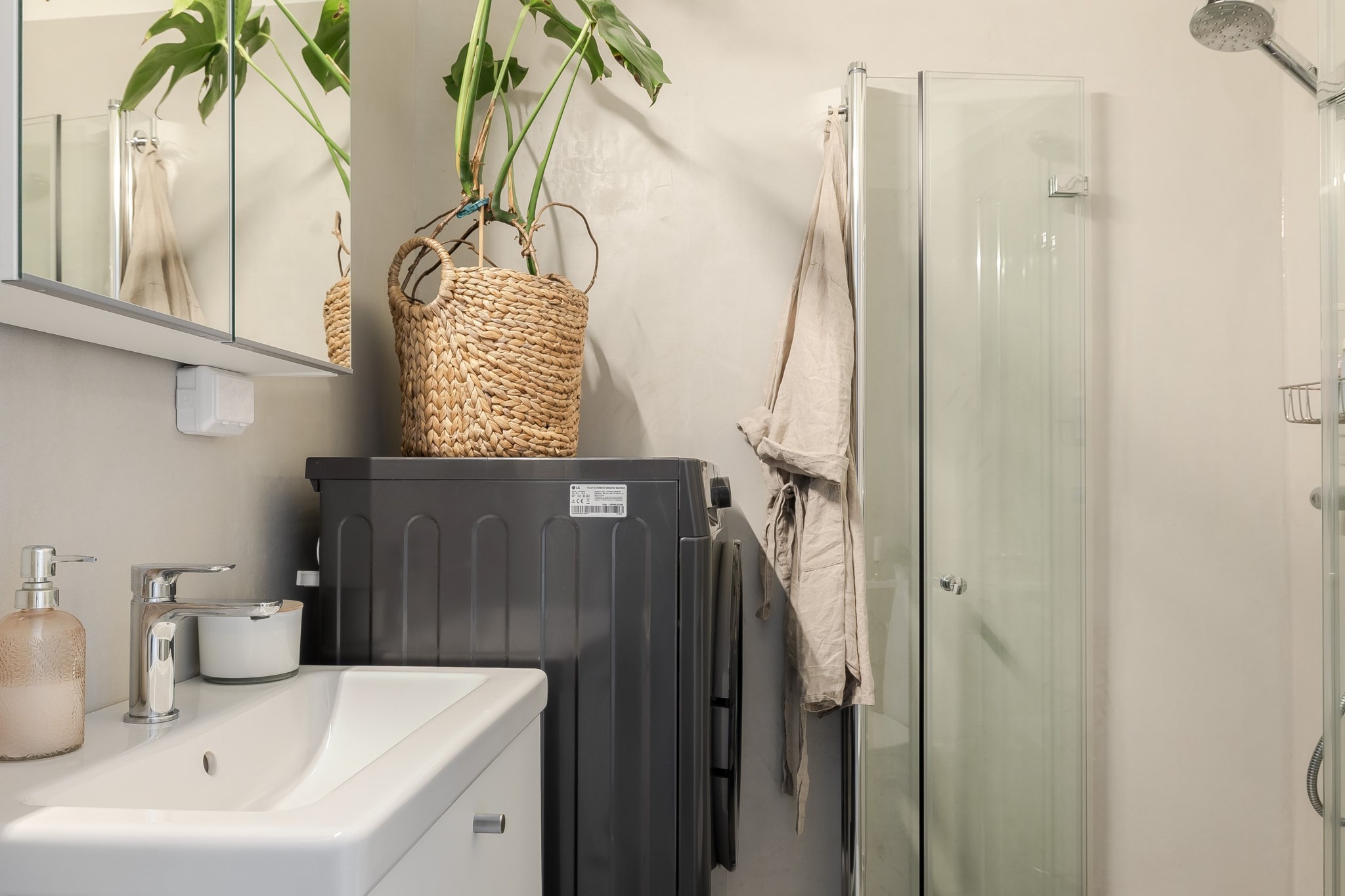 Kök och vardagsrum har en optimal planlösning som är social för middagsbjudningar med nära och kära. Köket är i absoluta toppklass med exklusiva materialval såsom keramisk bänkskiva och vackra luckor i valnöt. Köket är fullt utrustat med integrerade vitvaror (ink. diskmaskin) samt har en social köksö. Badrummet är smakfullt renoverat i microcement och utrustat med kombimaskin för extra bekvämlighet. Samtlig el i bostaden är omdragen och styrs enkelt genom Plejd.