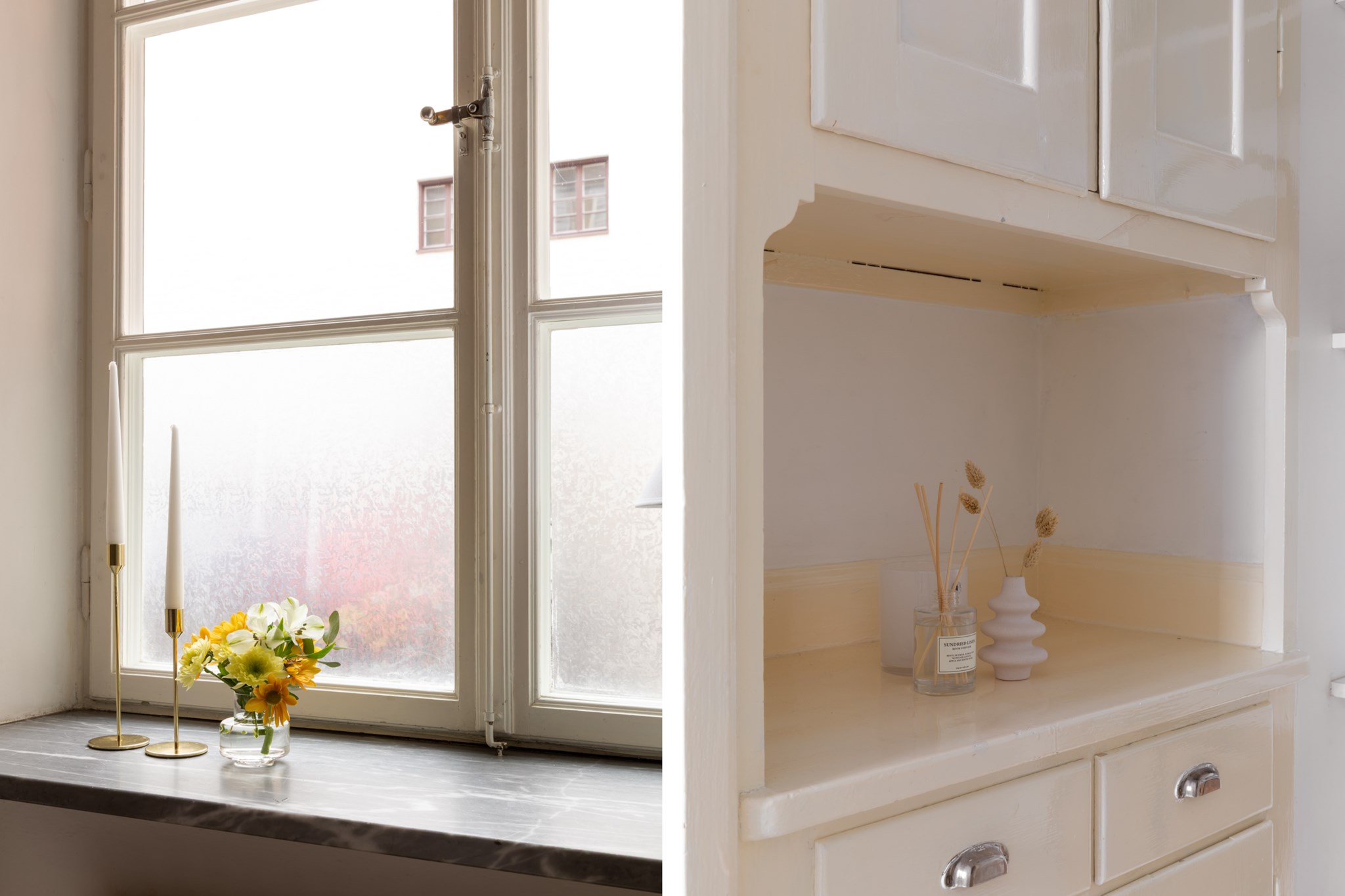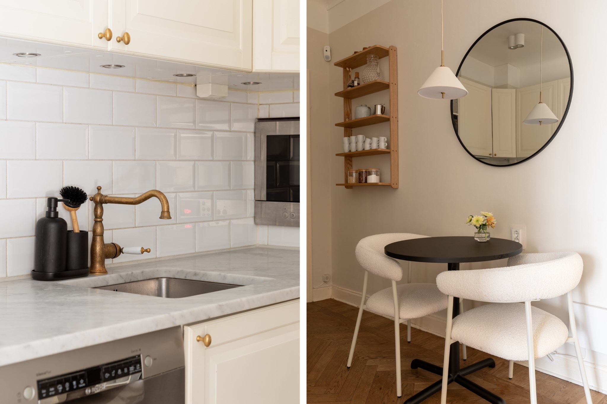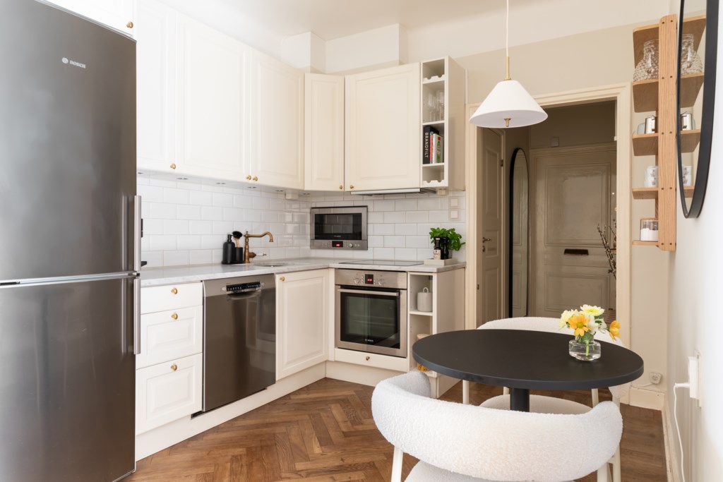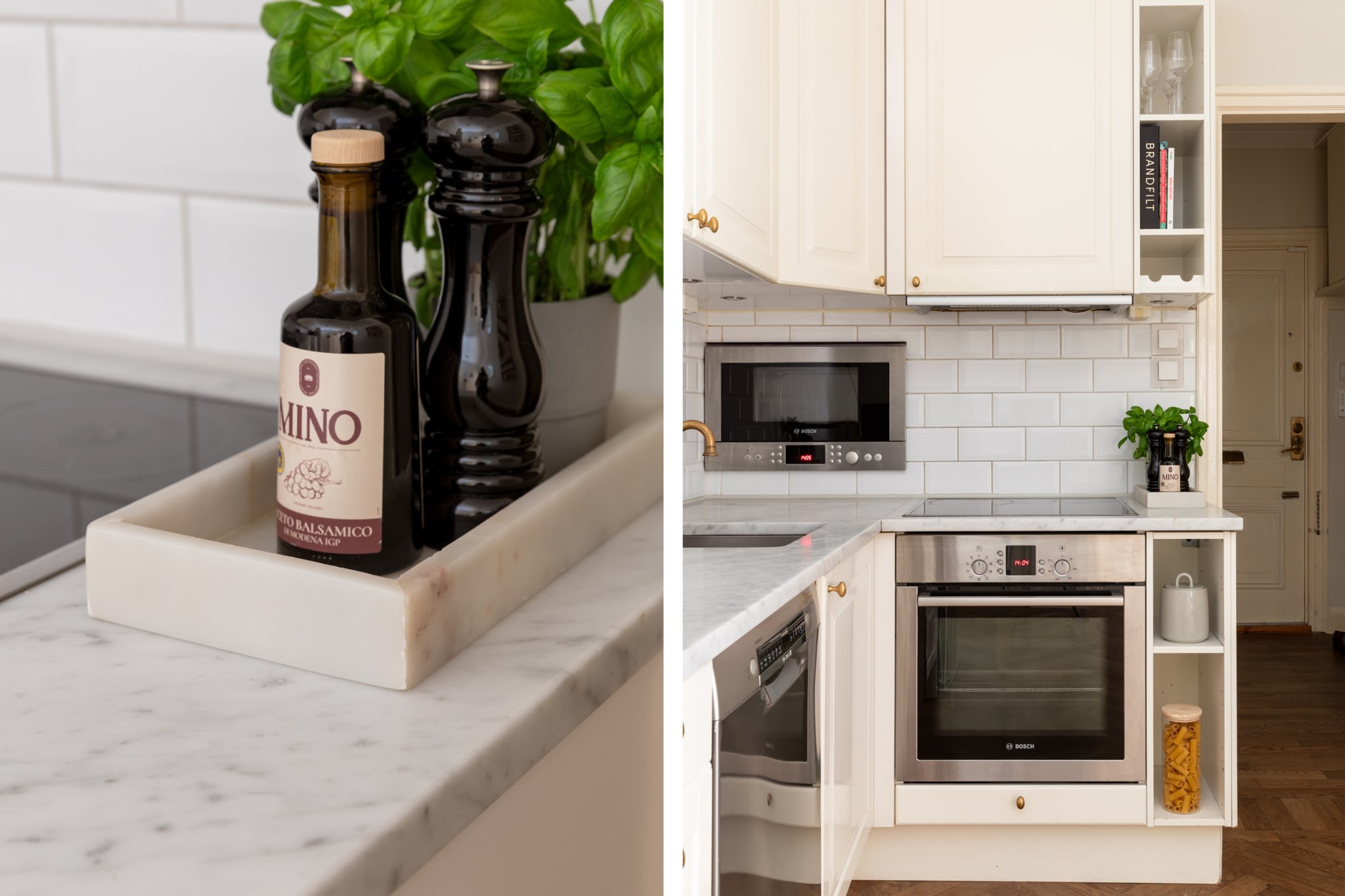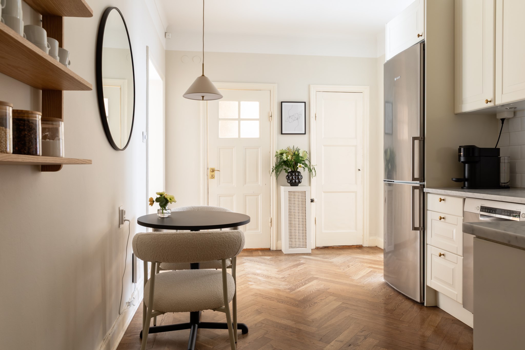 Trevlig kök med smakfulla materialval i form av ljusa köksluckor, ljus bänkskiva och mässingdetaljer. Ytskikten består av väggar i beige nyans och mörk fiskbensparkett. Köket är utrustat med diskho, keramik spis, köksfläkt, varmluftsugn, integrerad mikro, diskmaskin samt kyl och frys. I köket inryms även mindre matgrupp.