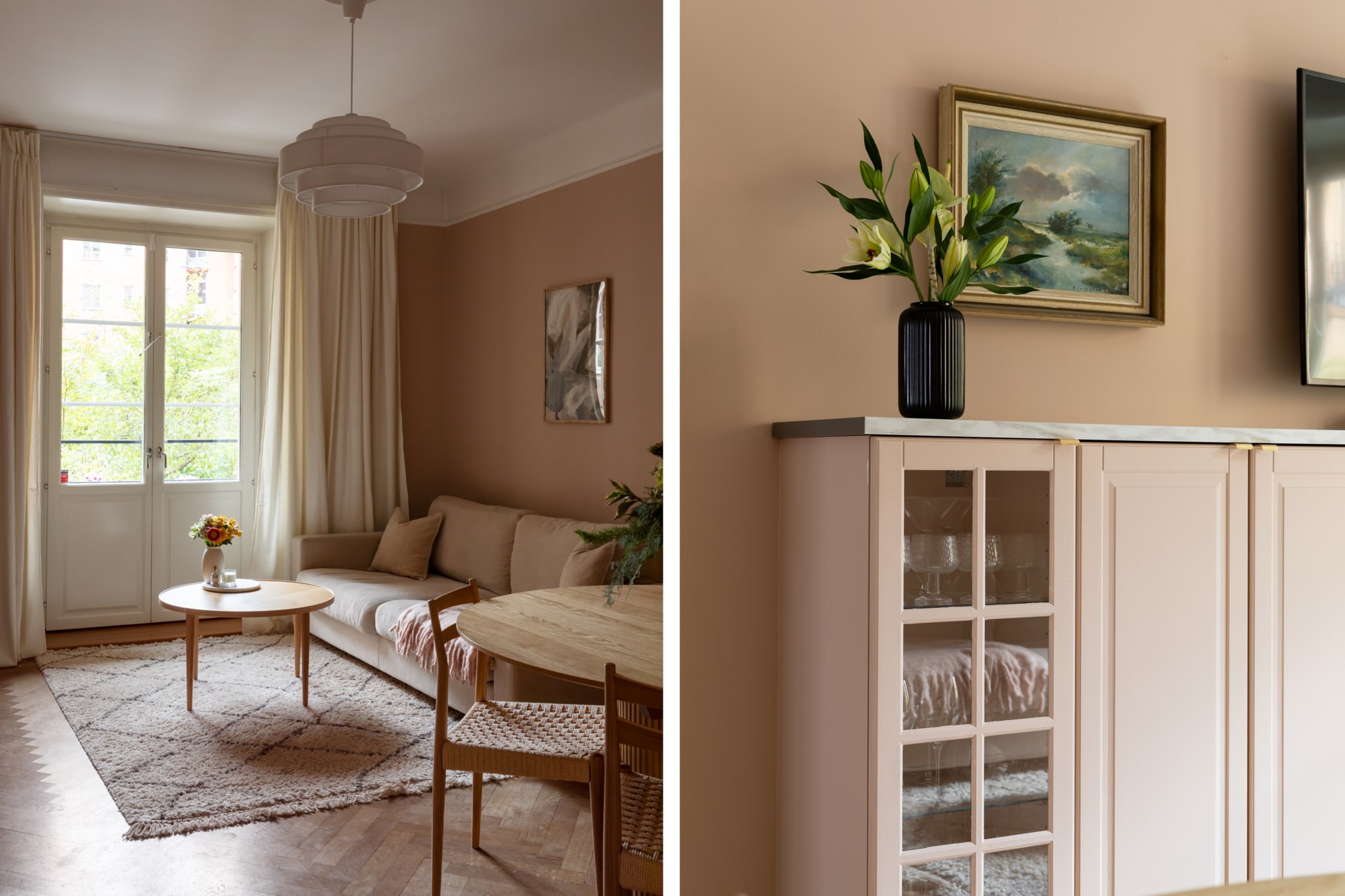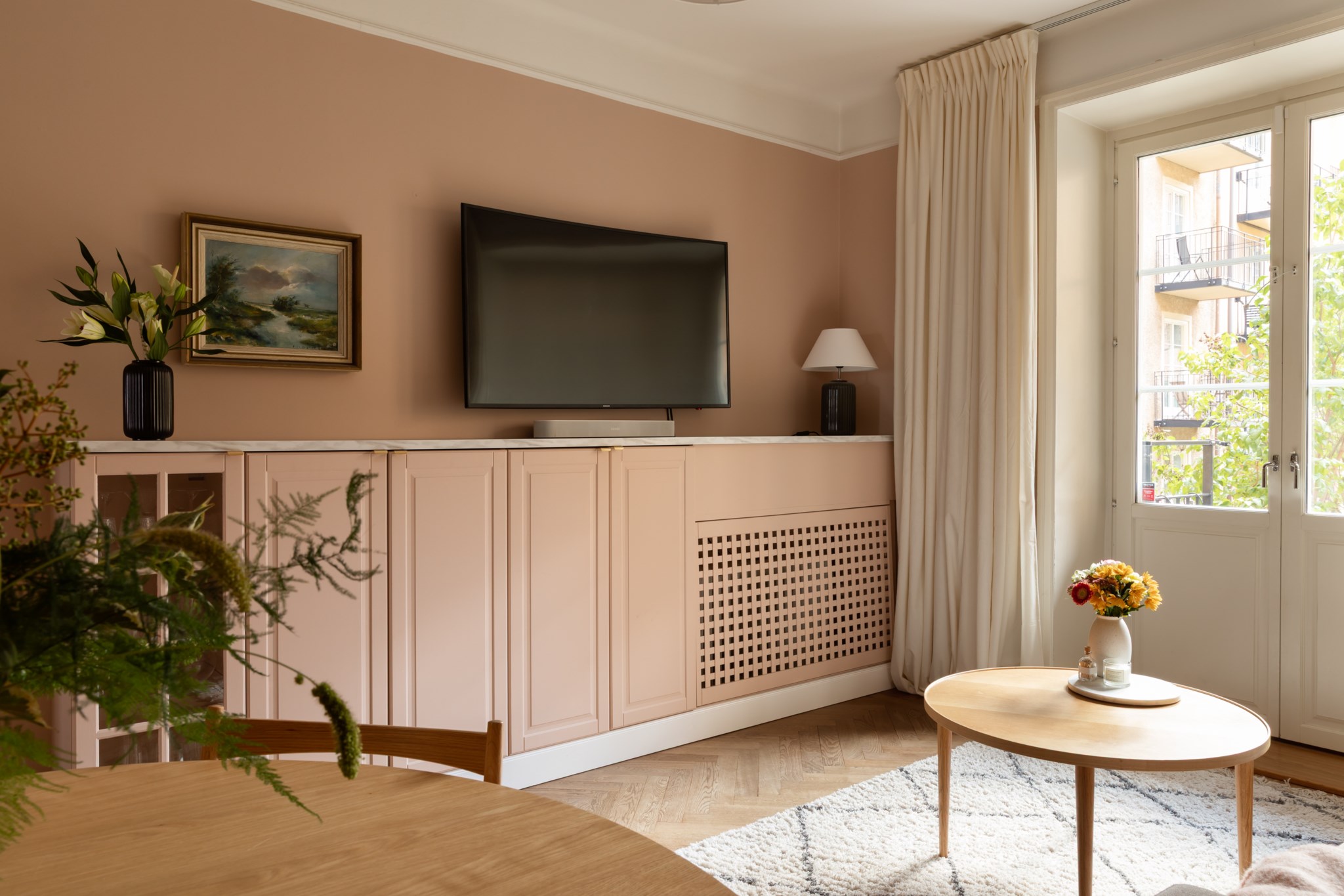 Luftigt vardagsrum med smakfulla ytskikt bestående av väggar i en dov kulör samt mörk fiskbensparkett. I vardagsrummet inryms soffa, soffbord, TV-möbel, matgrupp och annat möblemang efter smak och behov. Härifrån nås även den mysiga uteplatsen via dubbeldörrar vilket bidrar till ett härligt ljusinsläpp.