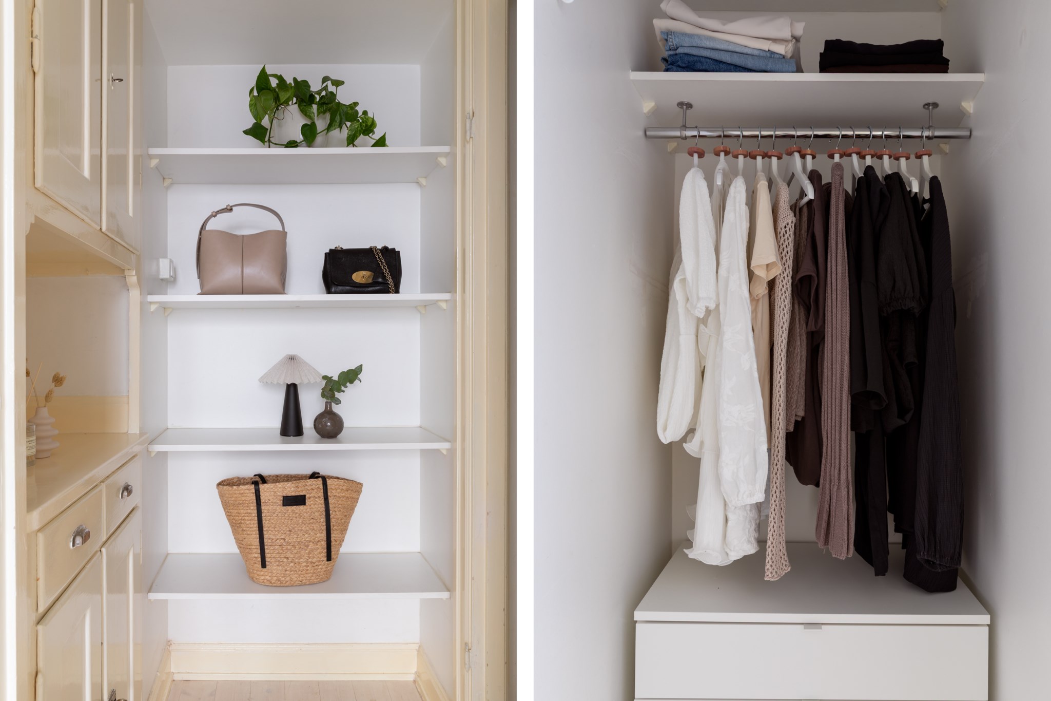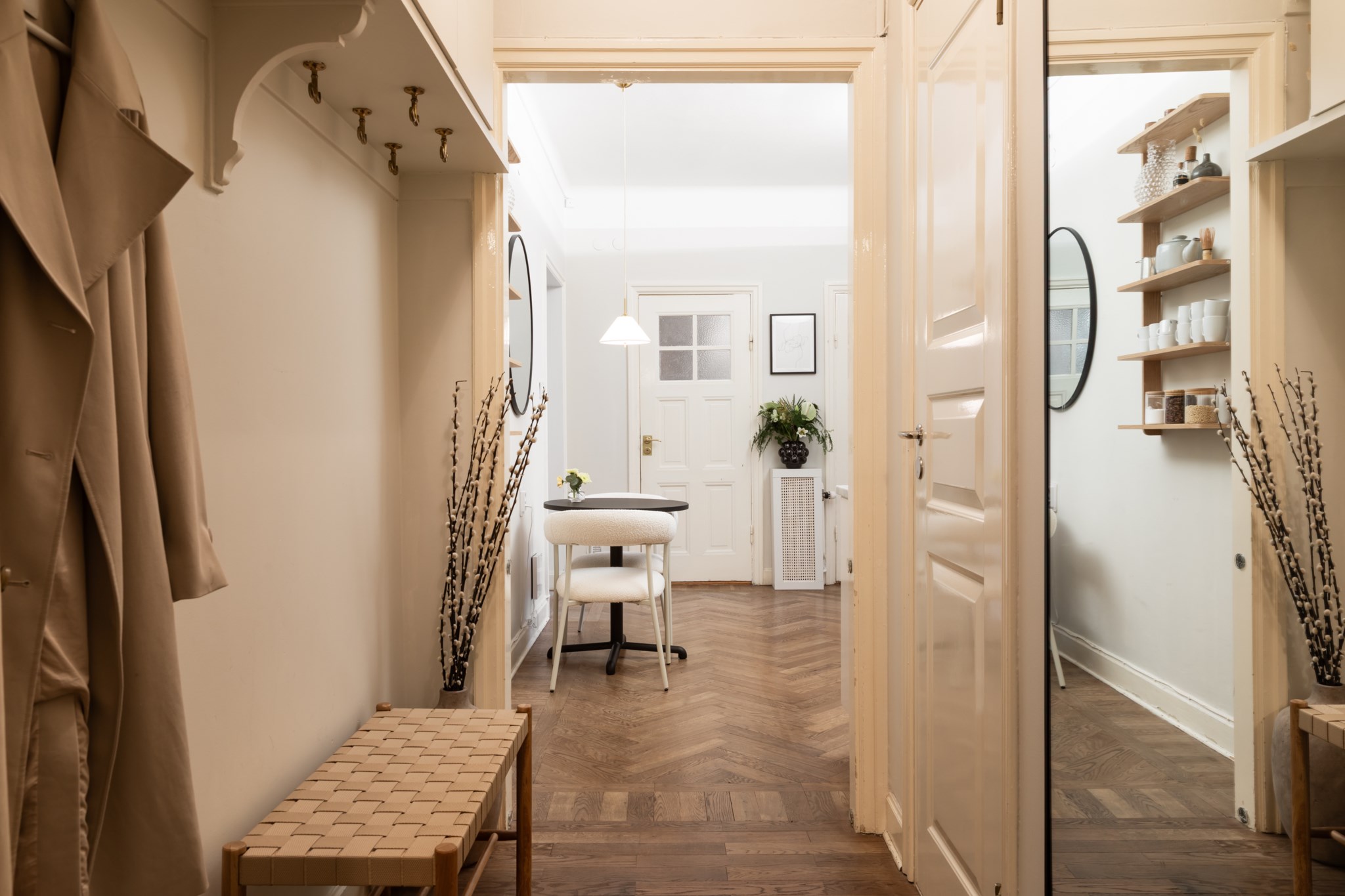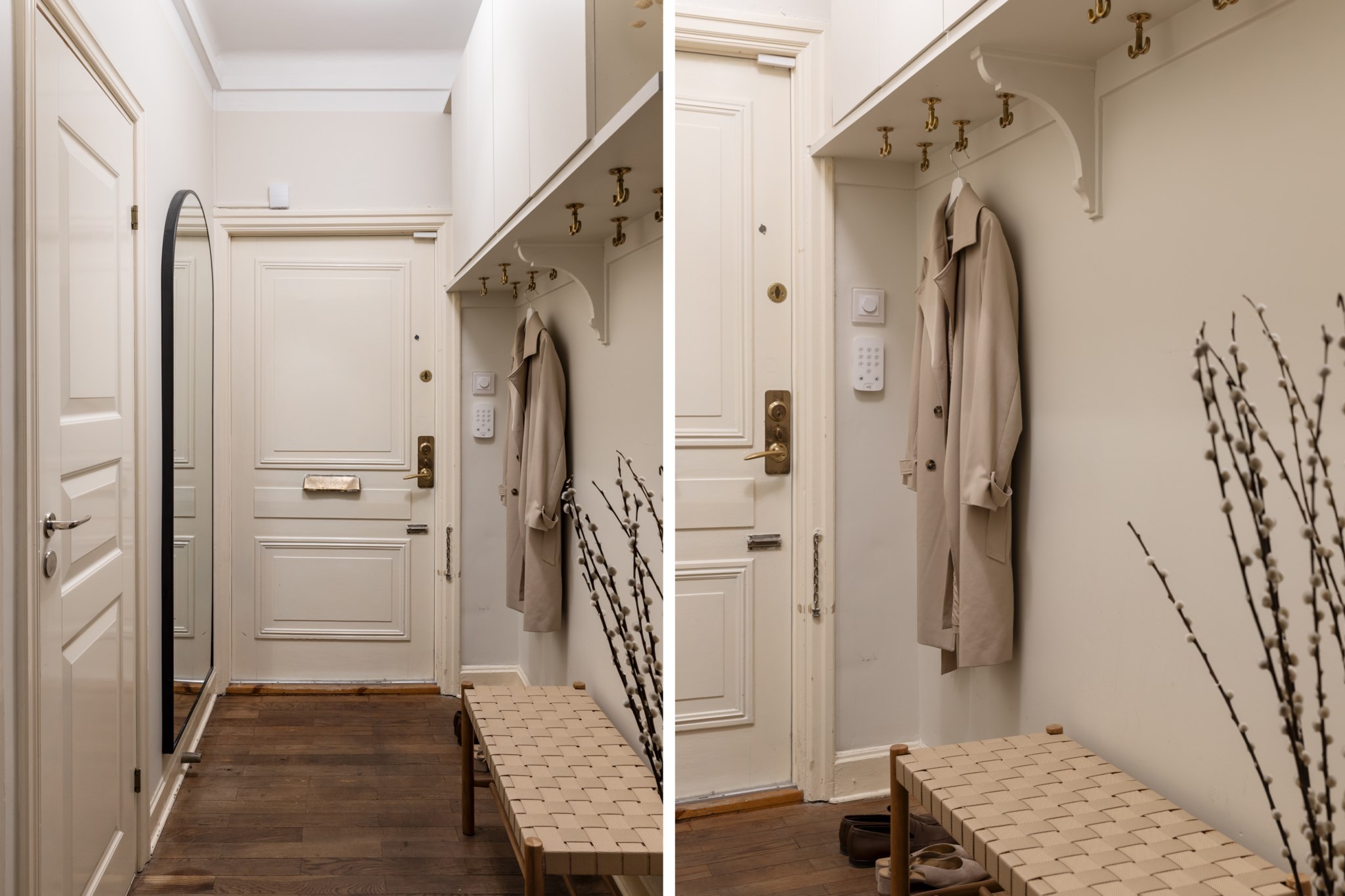 Välkomnande hall med gott om plats för avhängning, skoställ och mindre avlastningsmöblemang efter önskemål. Ytskikten består av ljusa väggar och mörkt parkettgolv. I anslutning till hallen finns en klädkammare som erbjuder gott om förvaringsmöjligheter.
