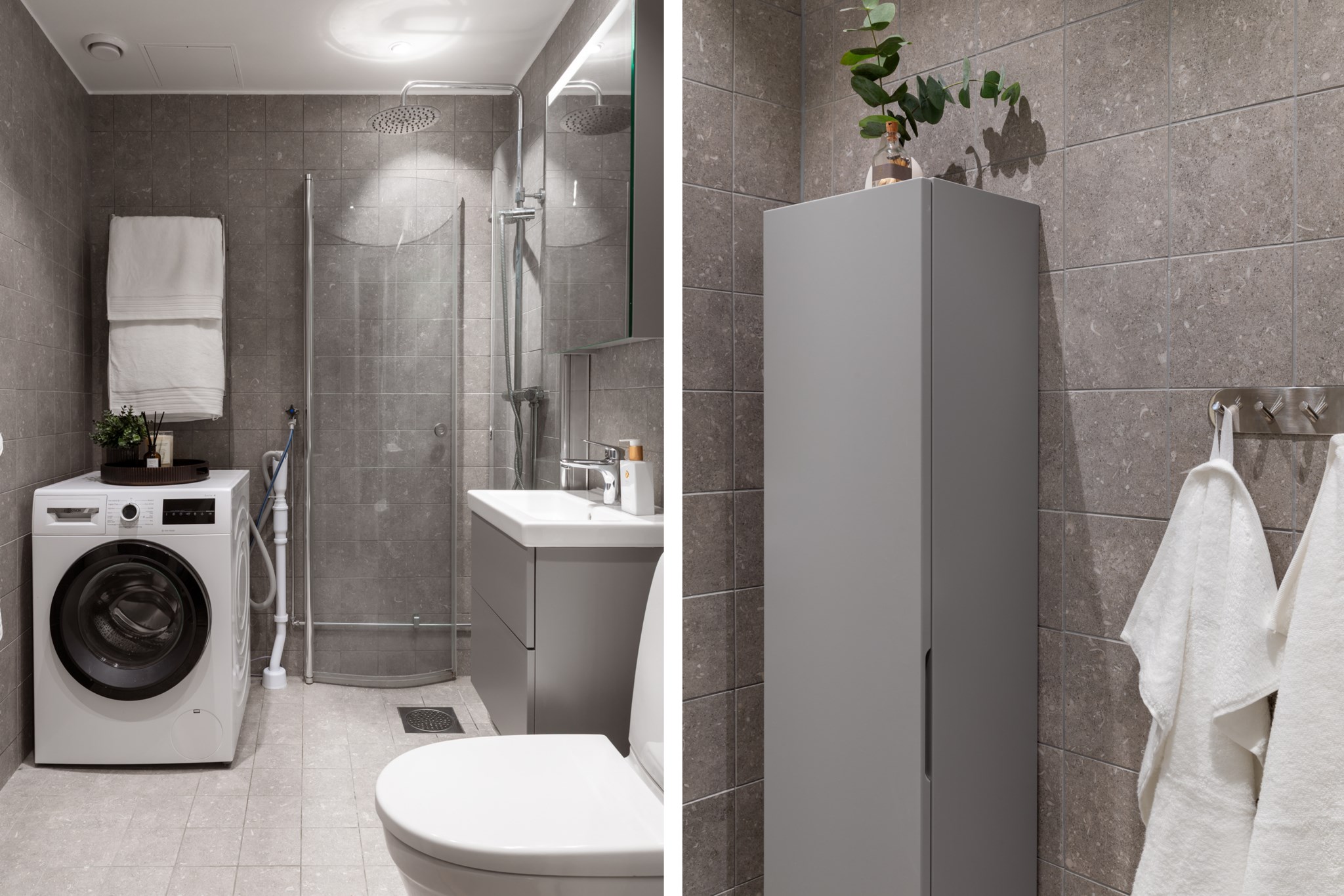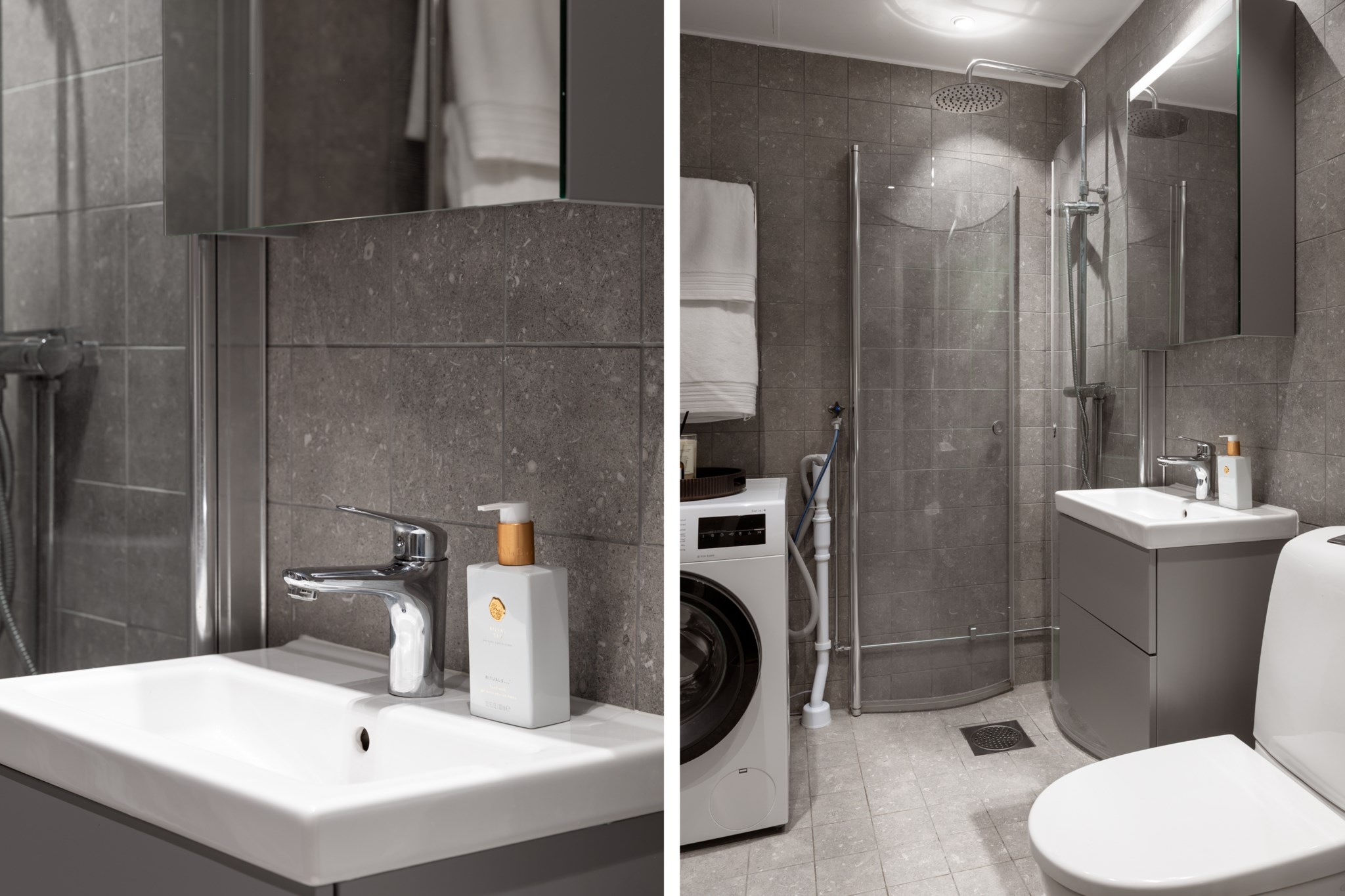Stort badrum med tidlösa materialval bestånde av kakel och klinker i grå nyans. Badrummet är utrustat med golvvärme, WC, handfat med kommod, spegelskåp med belysning, dusch med glasväggar, handdukstork samt bekvämligheter som tvättmaskin.