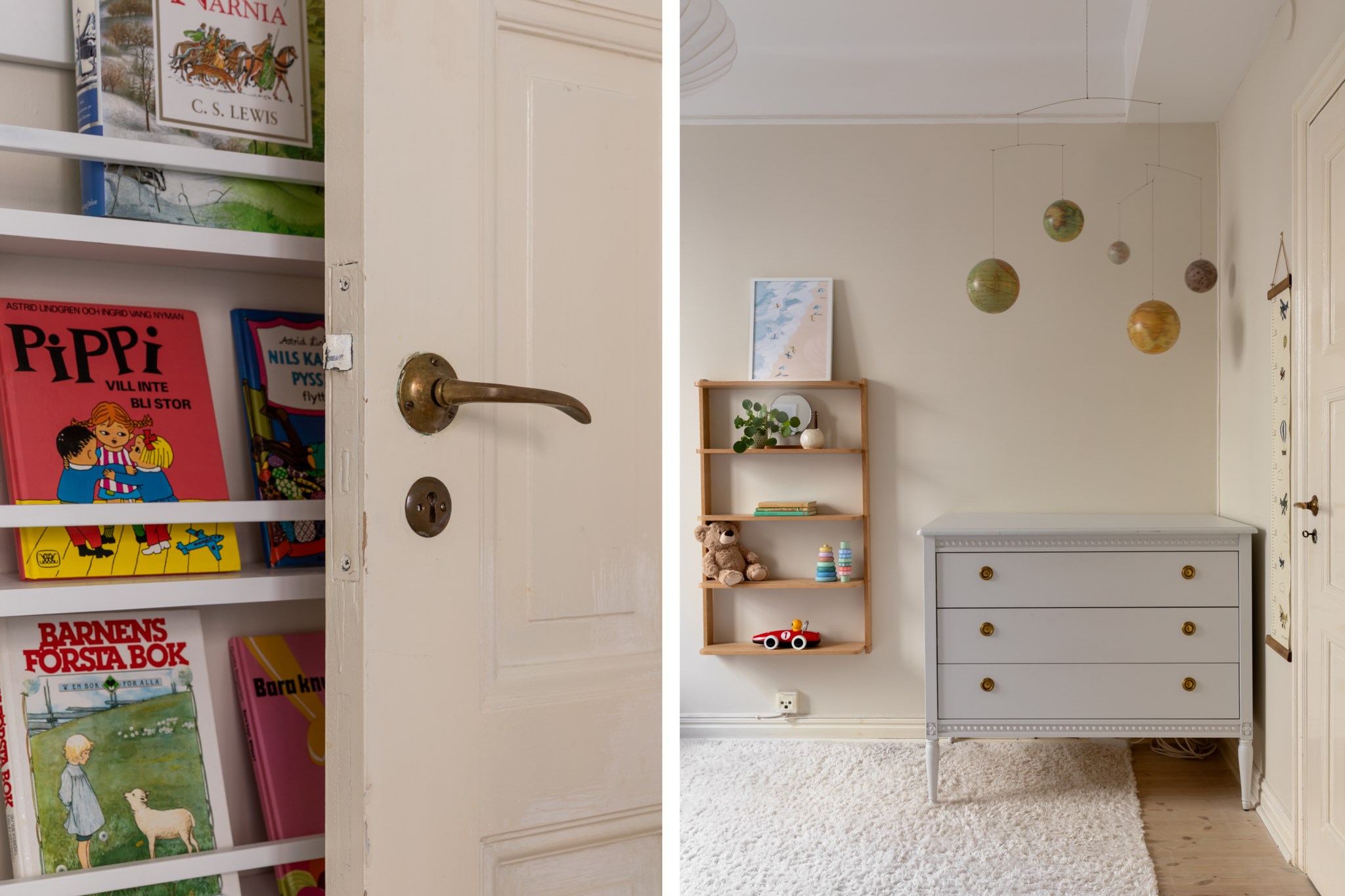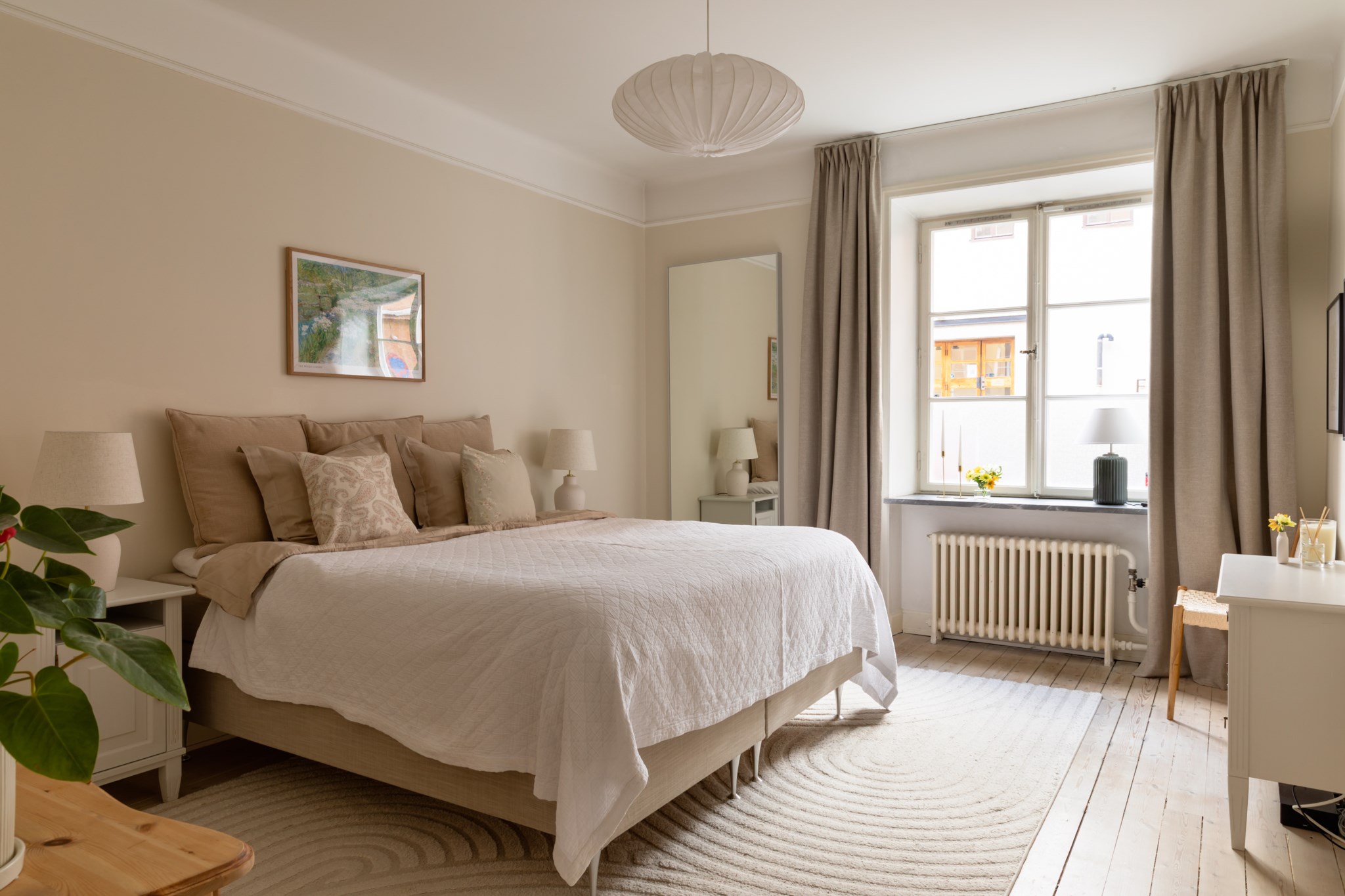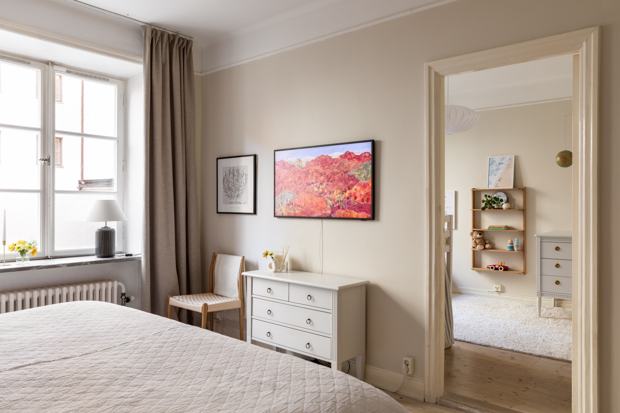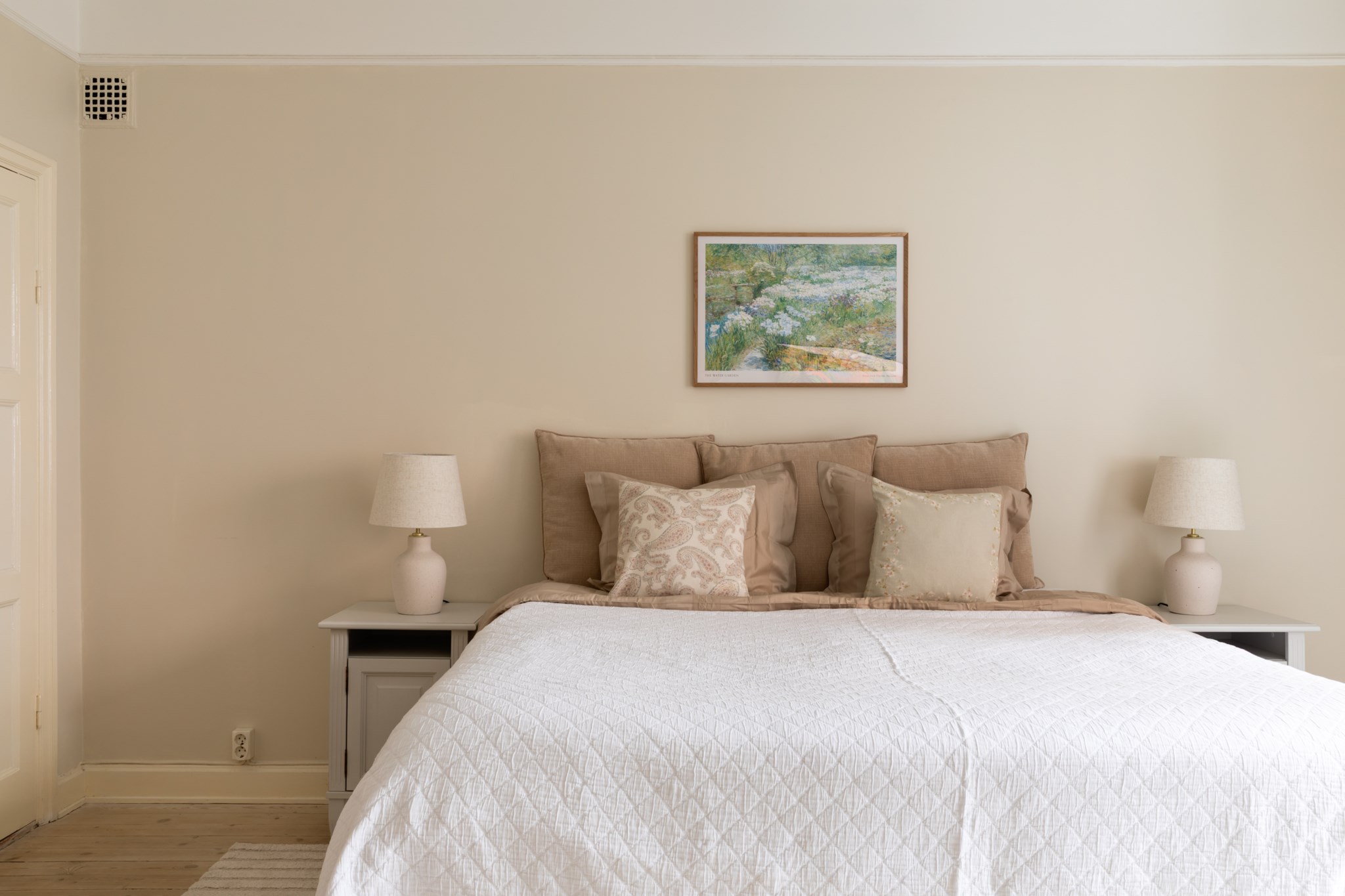 Stort sovrum med plats för fullstor säng, sängbord och annat möblemang efter önskemål. Ytskikten består av väggar i ljusbeige nyans samt ljust trägolv. Ett härligt ljusinsläpp tar sig in via stort fönster med spröjs. Från sovrummet nås även en klädkammare med gott om förvaringsmöjligheter via hyllplan, avhängning och ett bevarat serveringsskåp.