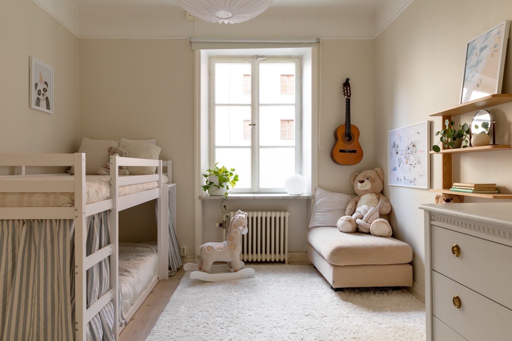 Rymligt sovrum med gott om plats för större säng, sängbord och annat efter önskemål. Perfekt att nyttja som barnrum, gästrum eller kontor. Ytskikten består av väggar i ljusbeige nyans samt ljust trägolv. Härligt ljusinsläpp via stort fönster med spröjs.