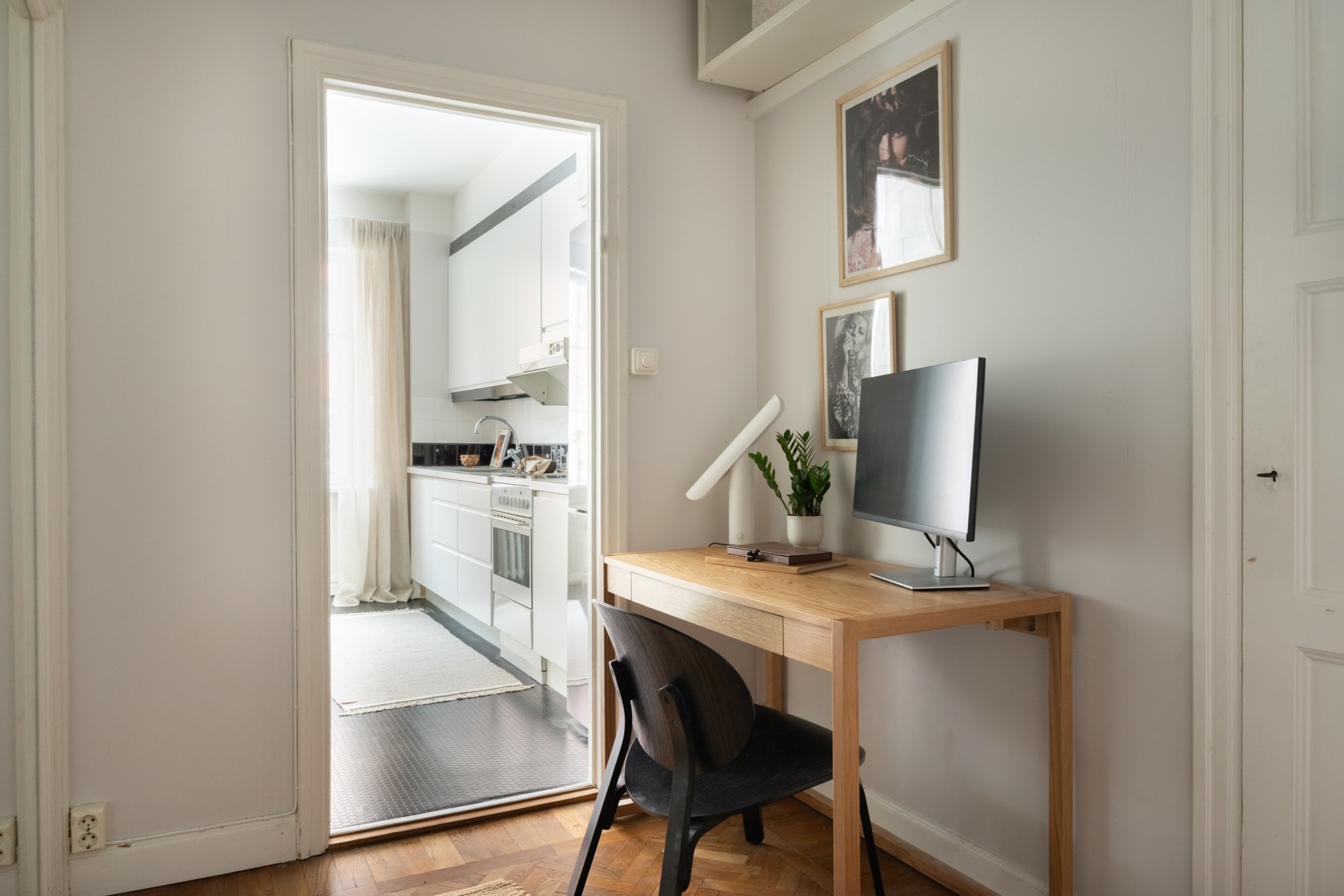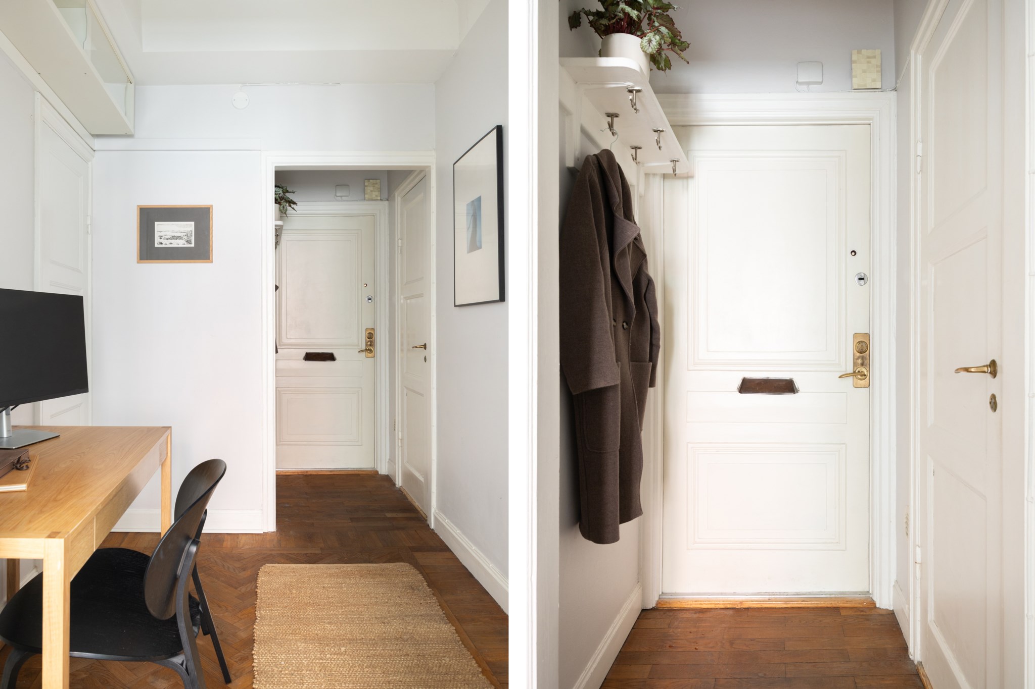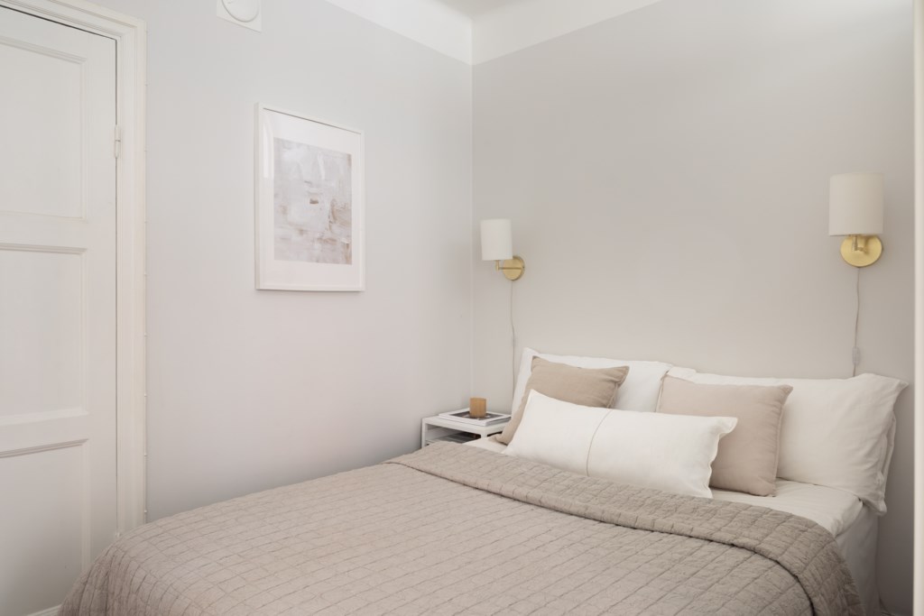 Den mysiga sovalkoven rymmer enkelt en större säng och erbjuder utmärkt förvaring i form av garderobsvägg samt klädkammare. I hallen finns dessutom plats för skrivbord – perfekt för hemmakontor eller studier. Vackra detaljer såsom fiskbensparkett, originaldetaljer och genomtänkt planlösning ger bostaden karaktär och själ.