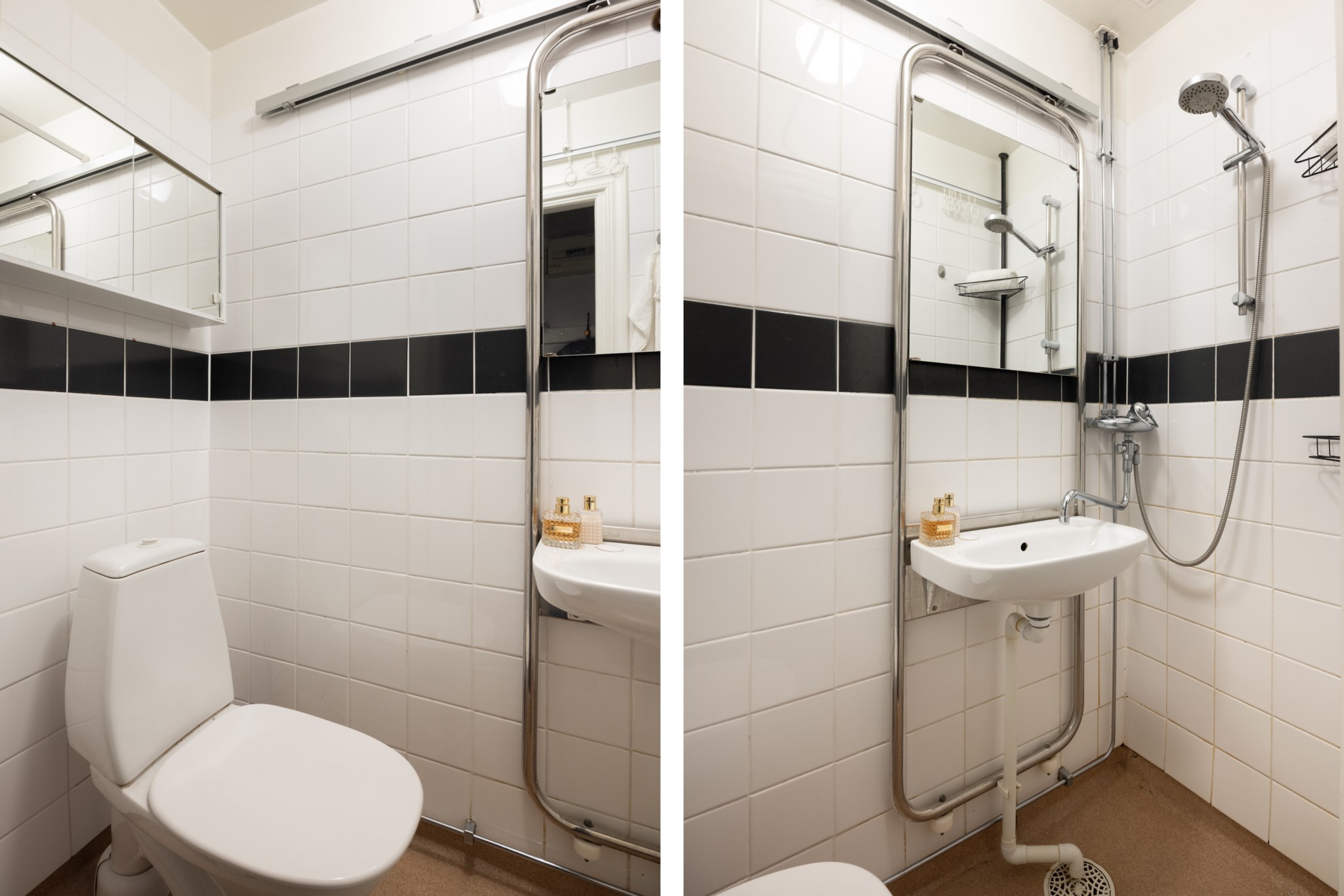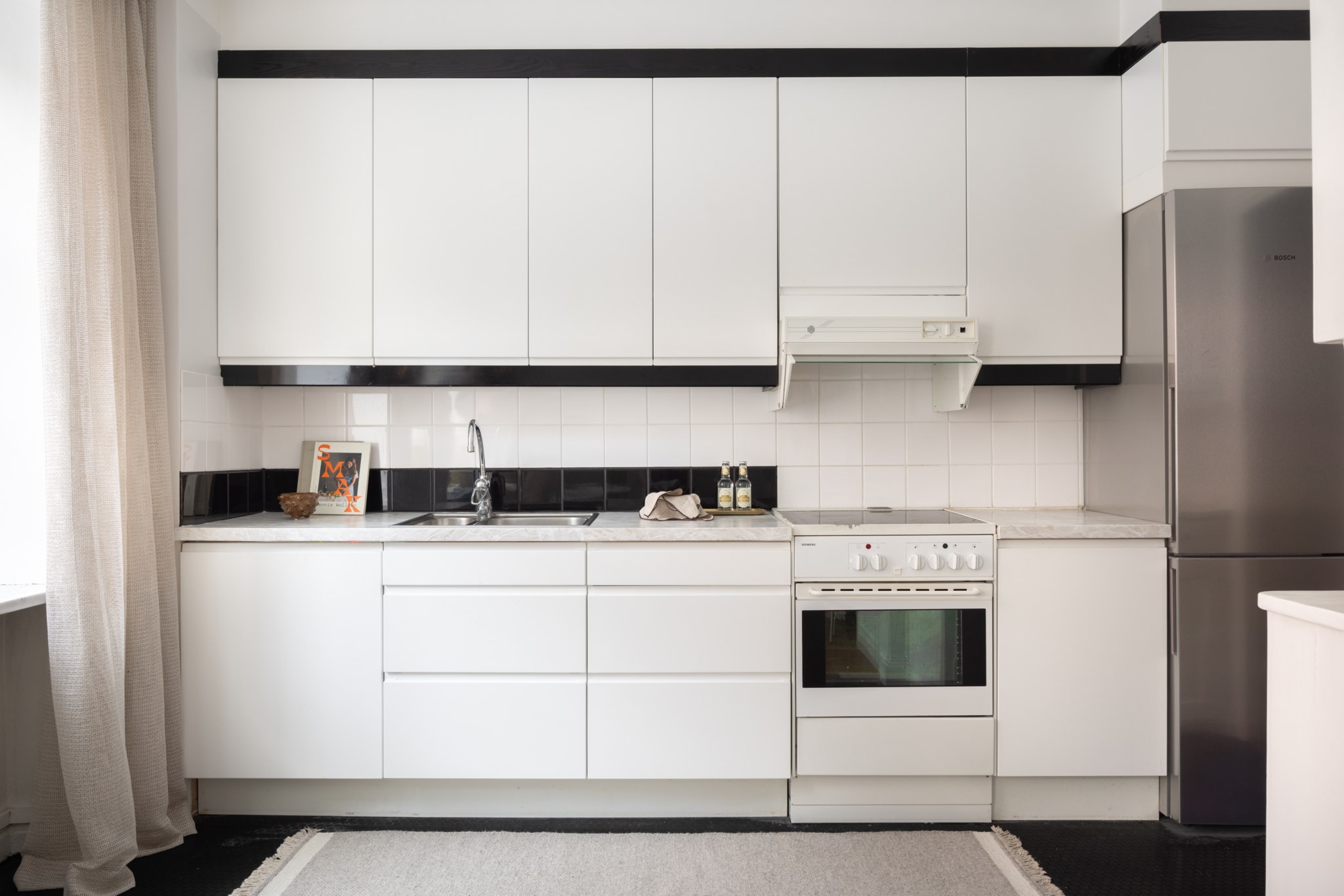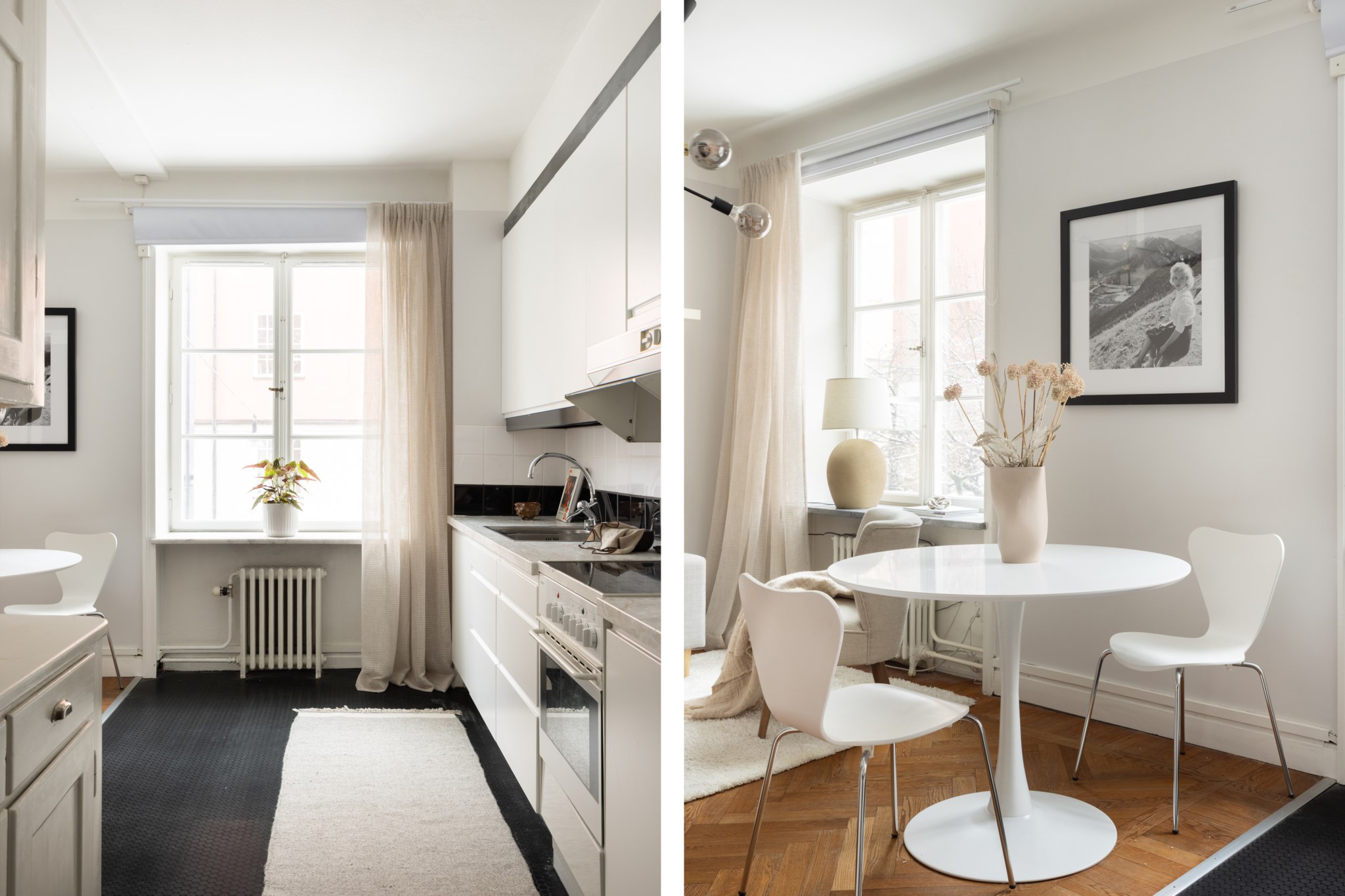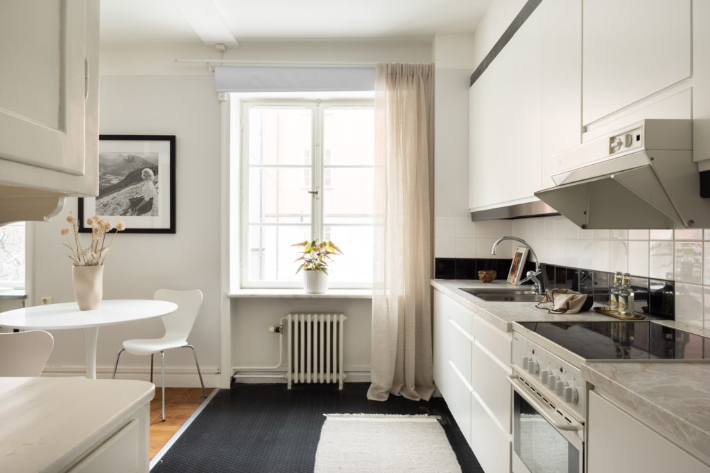 Bostadens hjärta är det generösa sällskapsrummet i öppen planlösning mot köket. Här finns gott om utrymme för såväl soffgrupp som matbord, vilket gör hemmet optimalt för middagar, umgänge med vänner och familj. Köket är praktiskt och stilrent med rikligt av bänkyta och smart förvaring bakom skåp, och kompletteras av ett välbevarat serveringsskåp som adderar tidstypisk charm.