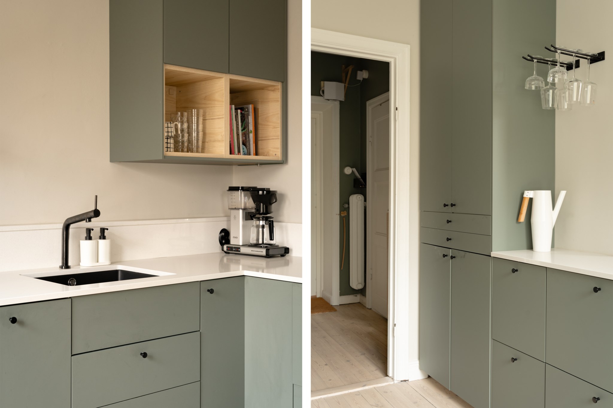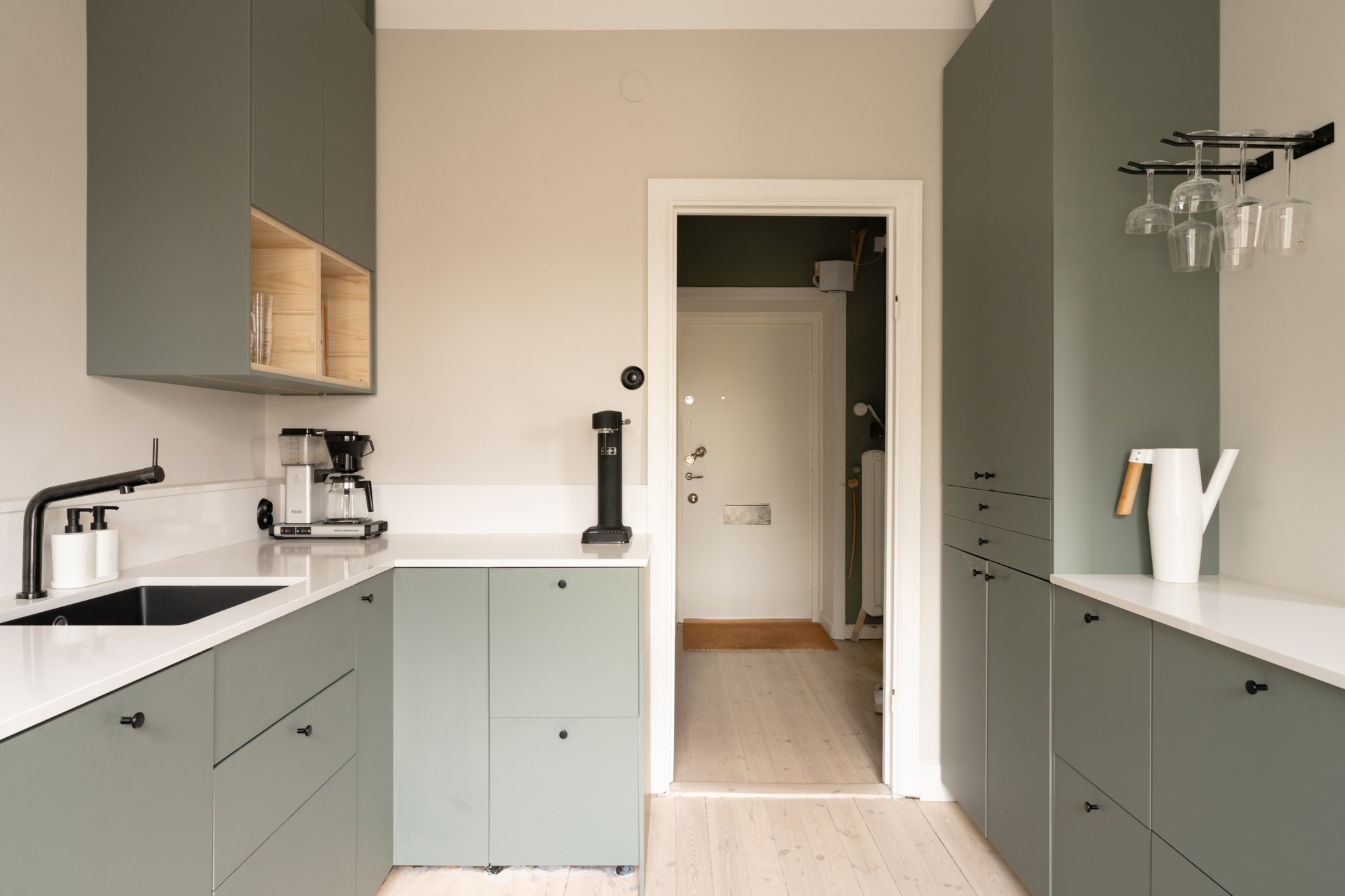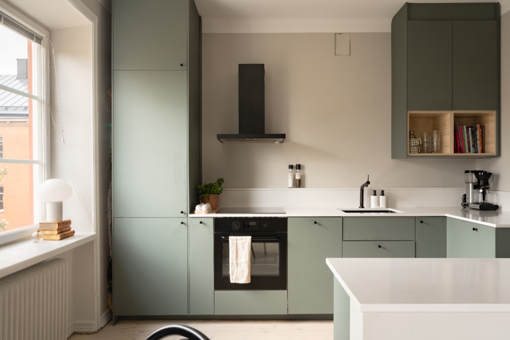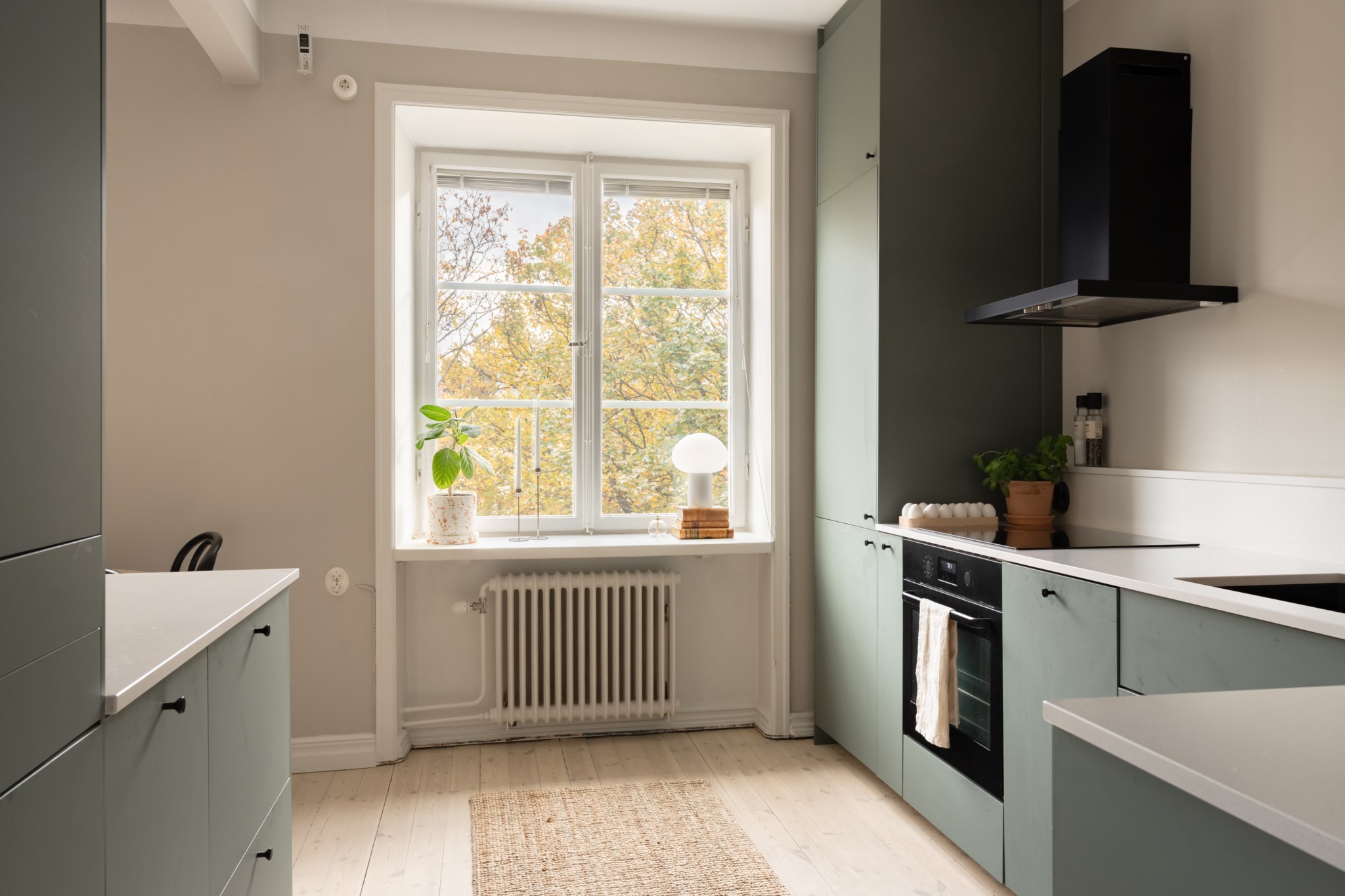 Modernt kök med genomtänkta material- och kulörval, där släta gröna köksluckor kombineras med en ljus bänkskiva som löper upp på väggpanelen. Det stora fönsterpartiet med spröjs släpper in ett generöst ljus och den öppna planlösningen mot vardagsrummet kompletteras av en köksö som på ett naturligt och stilfullt sätt avgränsar köksdelen. Kökets maskinella utrustning består av kyl/frys, spishäll, fläkt, ugn och diskmaskin. Neutralt målade ytskikt och vackert, vitlaserat trägolv.