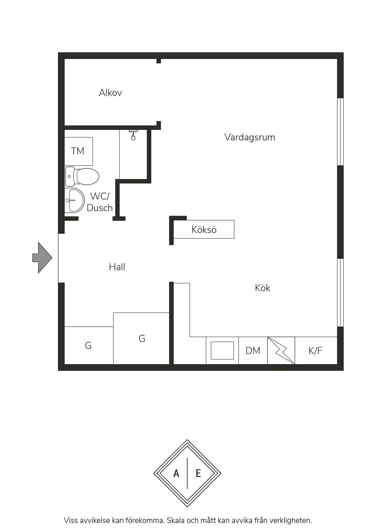 Det moderna köket är en riktig pärla med smakfulla gröna luckor, integrerade vitvaror och dessutom en social köksö. Bostaden erbjuder en öppen planlösning till vardagsrummet med plats för soffmöblemang, tv och matbord. Utöver detta finns en mysig sovalkov som skiljer sängen från vardagsrummet. Badrummet är fräscht med ljust kakel och även utrustat med tvättmaskin. Rymlig hall med inbyggda garderober för extra bra förvaring.