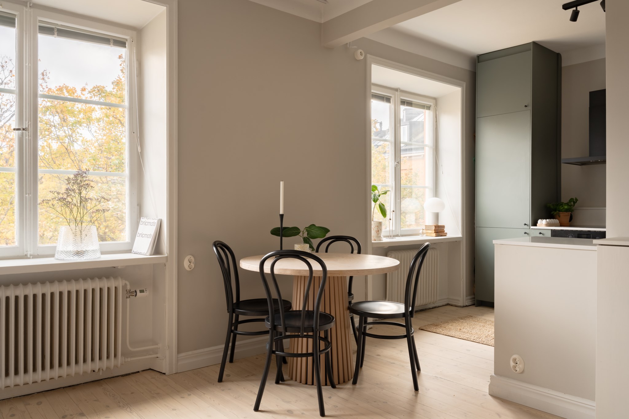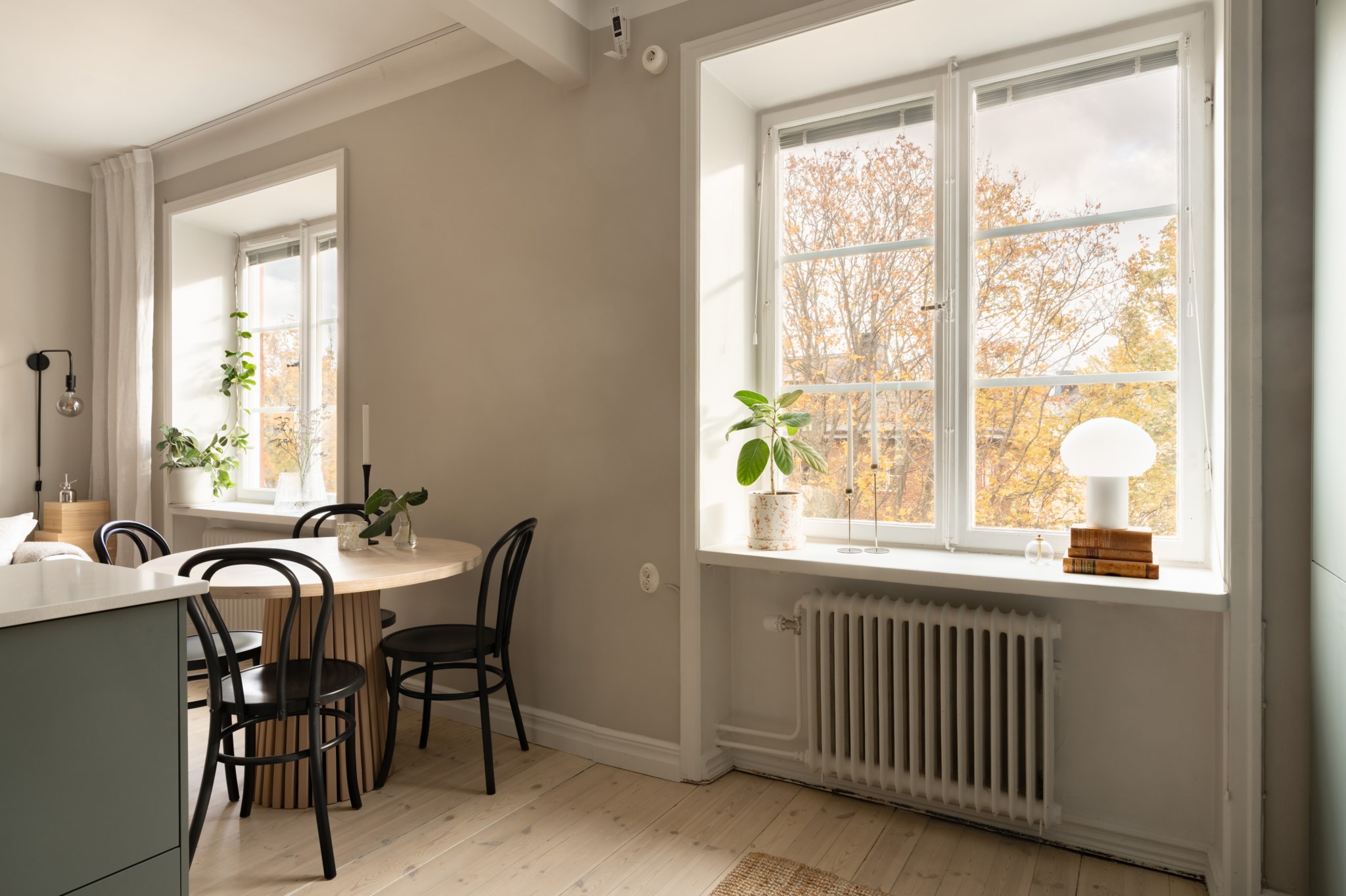 Trivsamt vardagsrum med neutralt målade ytskikt och vackert, vitlaserat trägolv som är genomgående i bostaden. Fönsterpartiet med spröjs och djupa fönsternischer släpper in rikligt med ljus och erbjuder naturlig plats för dekorativa föremål. Vardagsrummet erbjuder gott om plats för soffa, matbord och övrigt möblemang efter behov och smak.