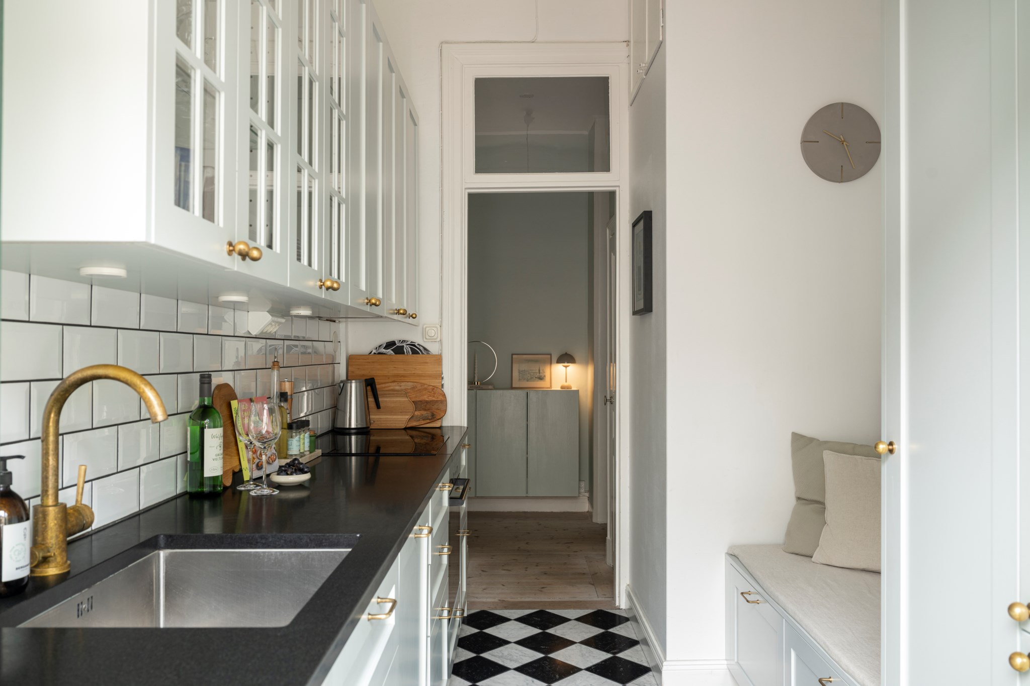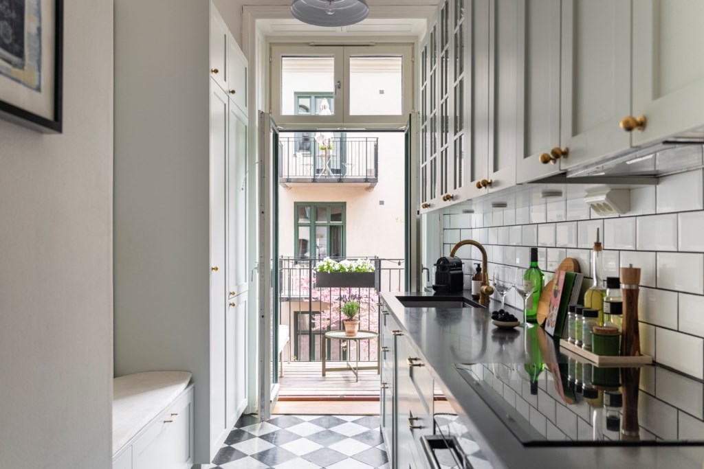 Modernt kök med smakfulla materialval bestående av ljusa köksluckor och ljus bänkskiva med stänkskydd ovan i vitt. Den maskinella utrustningen består av diskho, spis, ugn, köksfläkt, diskmaskin samt kyl och frys. Tidlösa ytskikt bestående av ljusa väggar och schackrutigt klinker. Ett härligt ljusinsläpp tar sig in via fönster och från köket nås även lägenhetens härliga balkong.