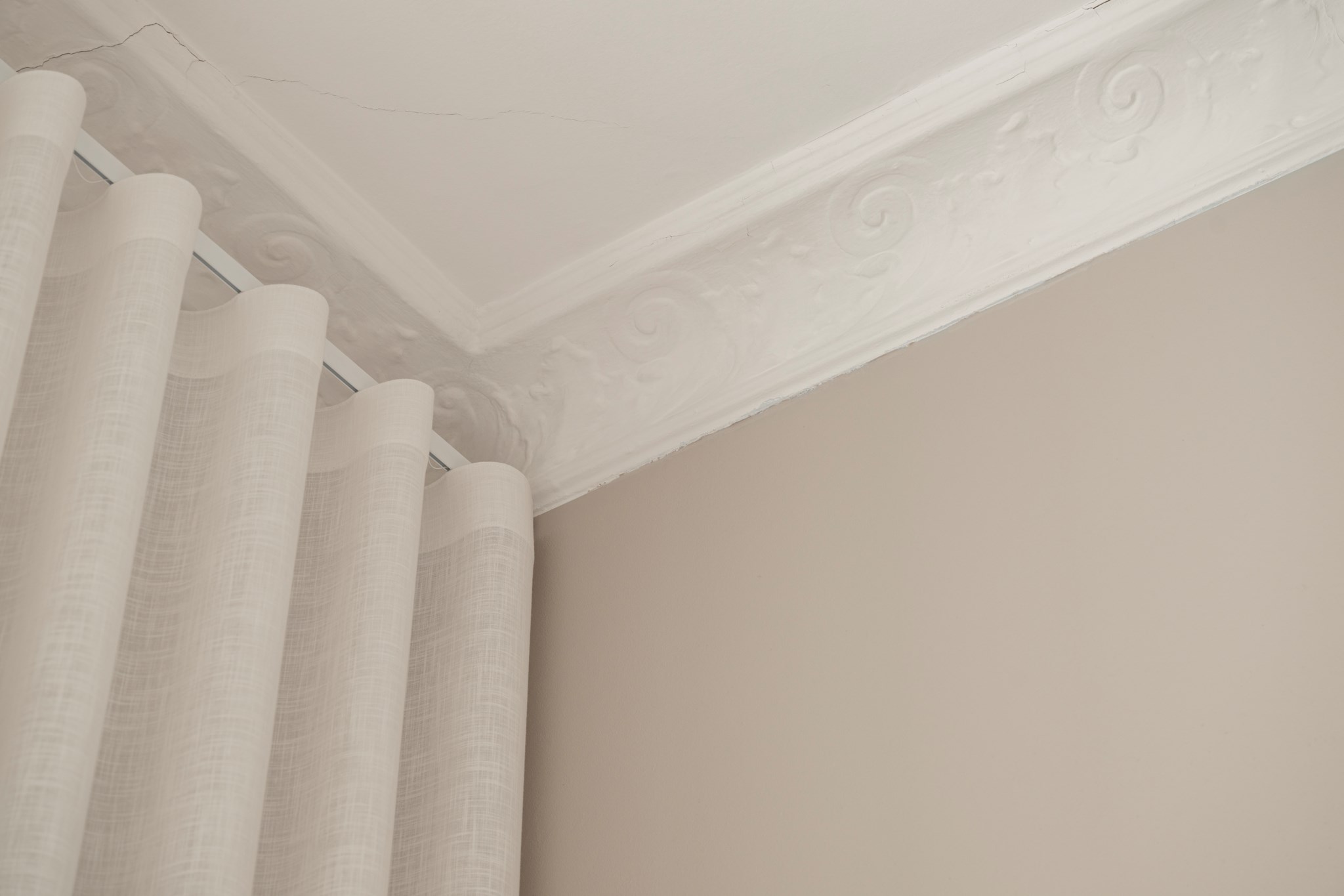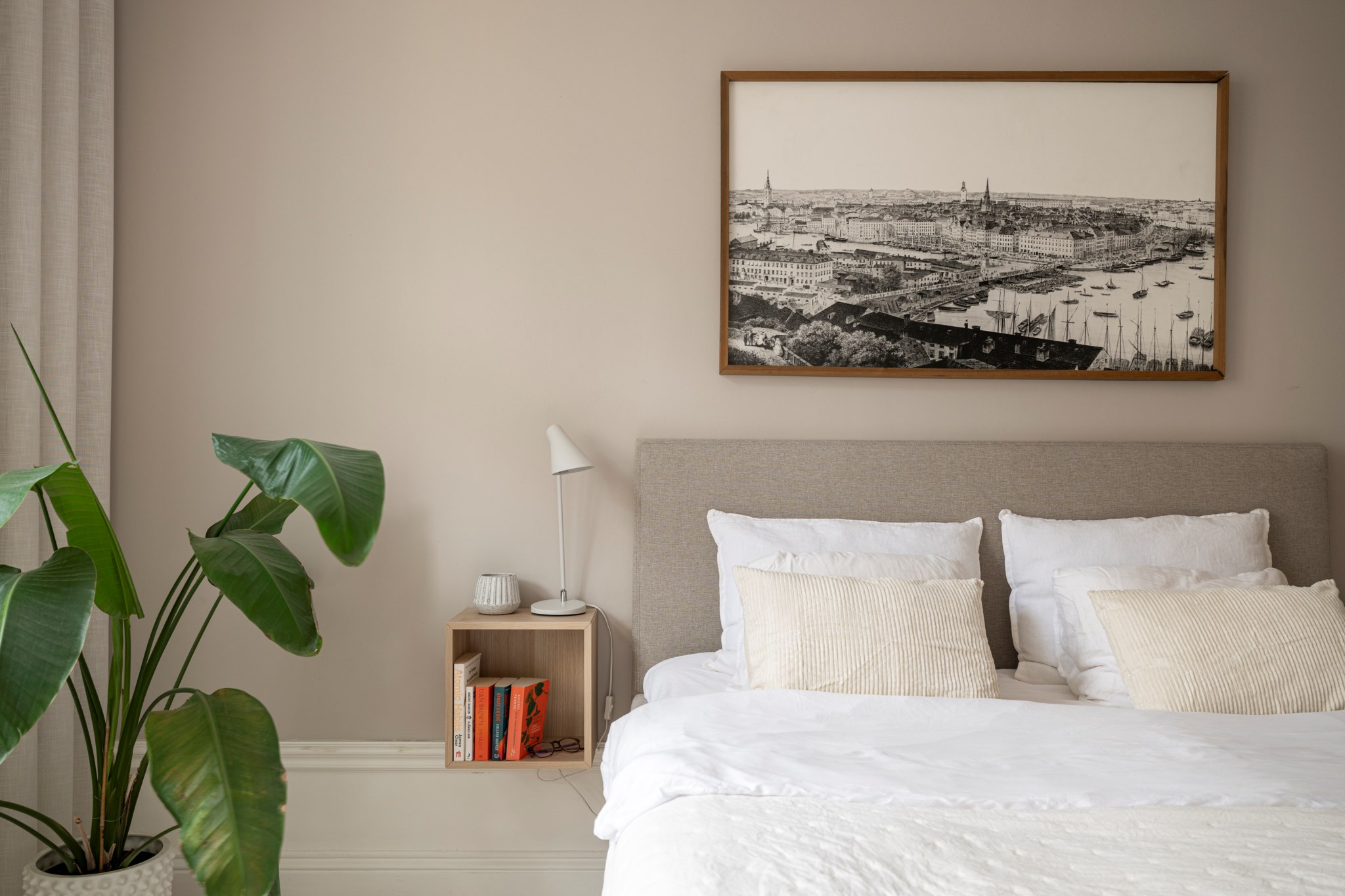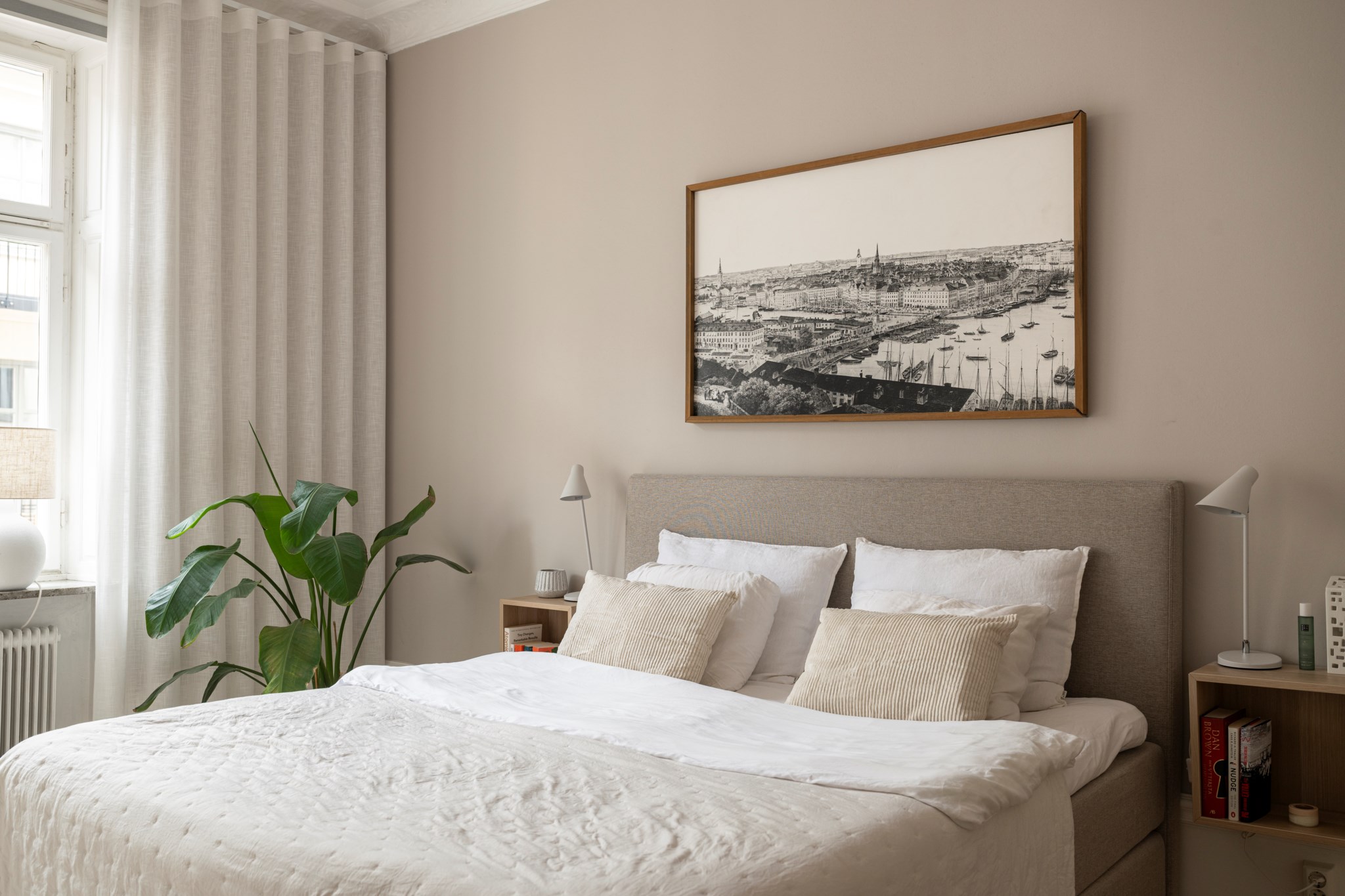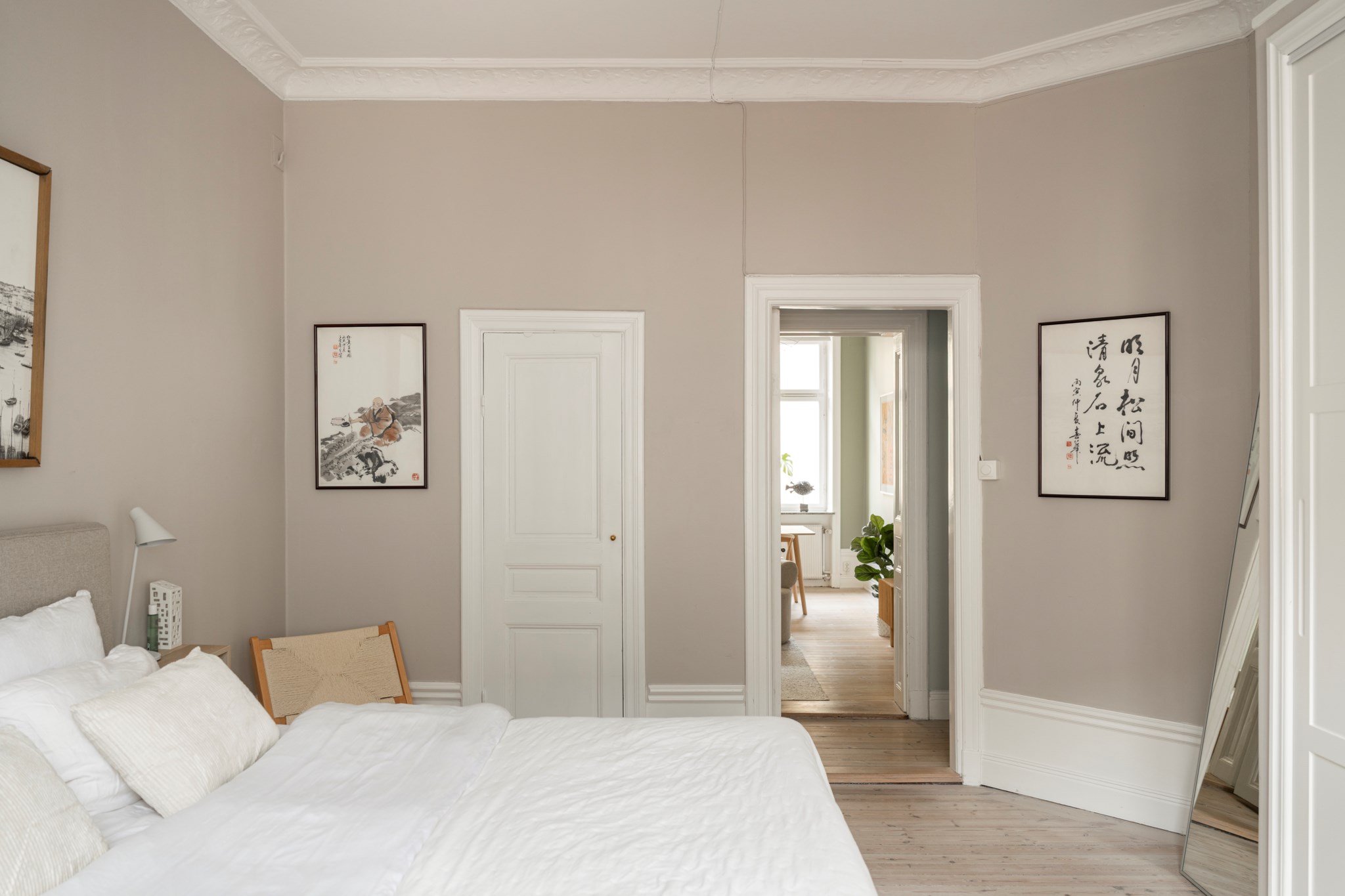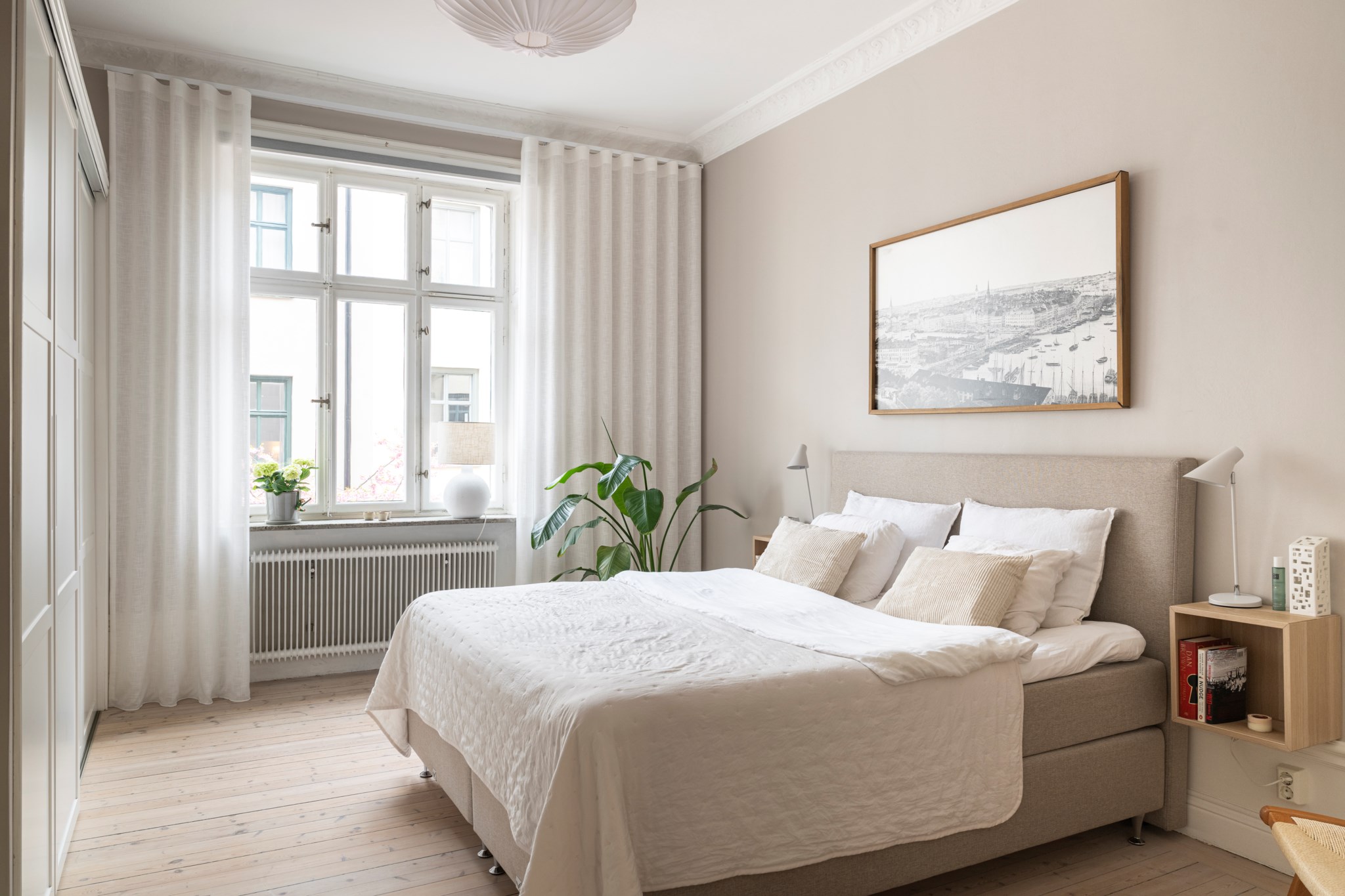 Stort sovrum med plats för dubbelsäng och annat möblemang efter smak och behov. Ett härligt ljusinsläpp tar sig in via ett stort spröjsat fönster. Tidlösa ytskikt bestående av ljusa väggar, bröstpanel och ljust trägolv. Taket pryds av vackra stuckaturer.