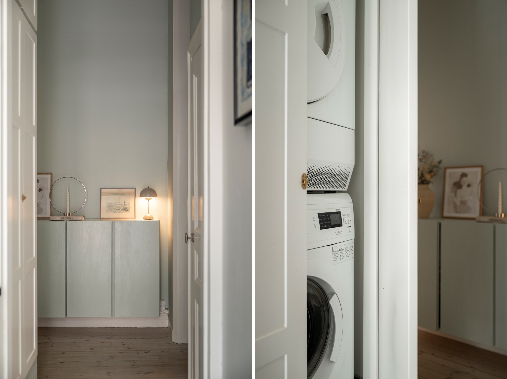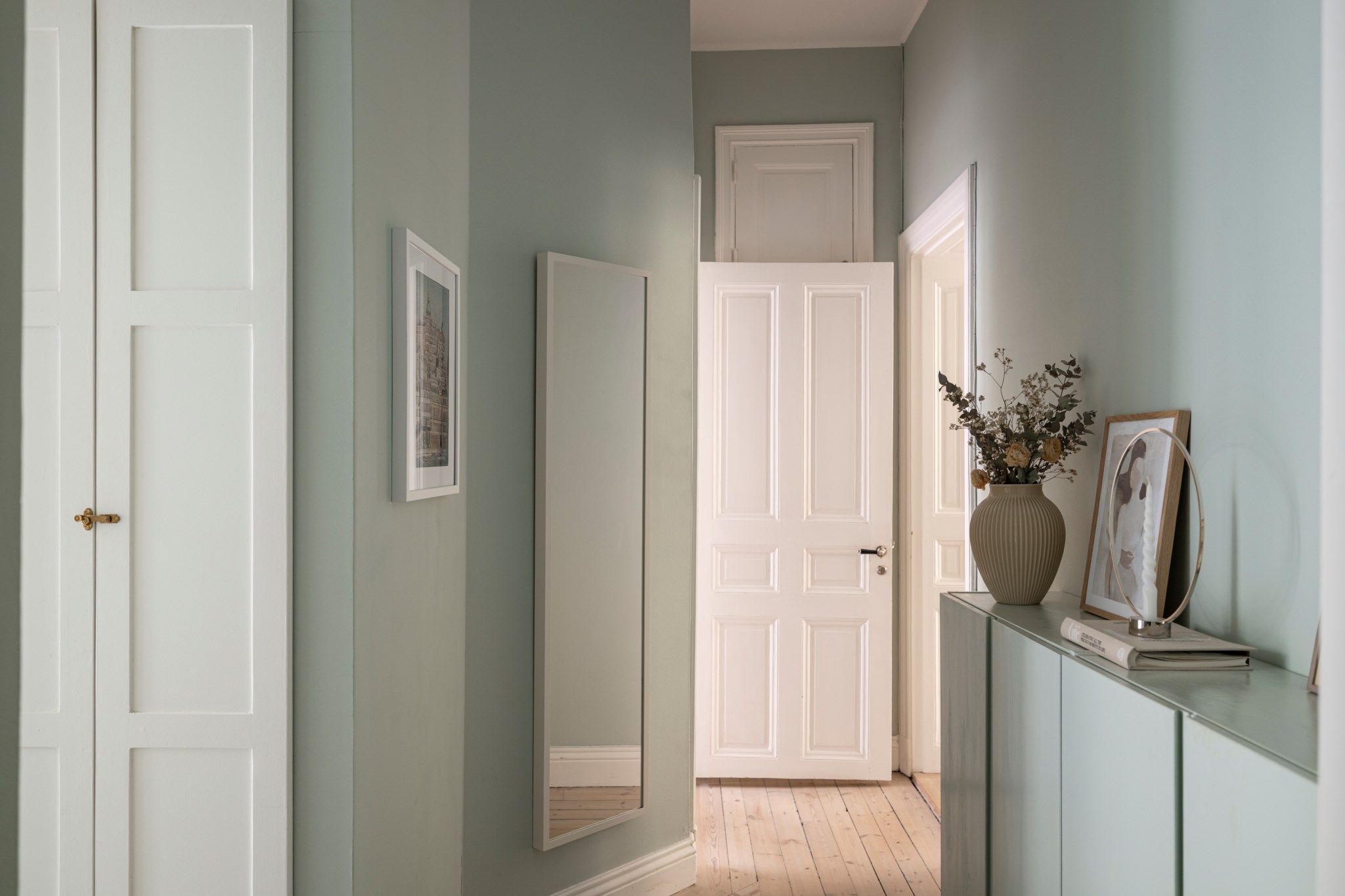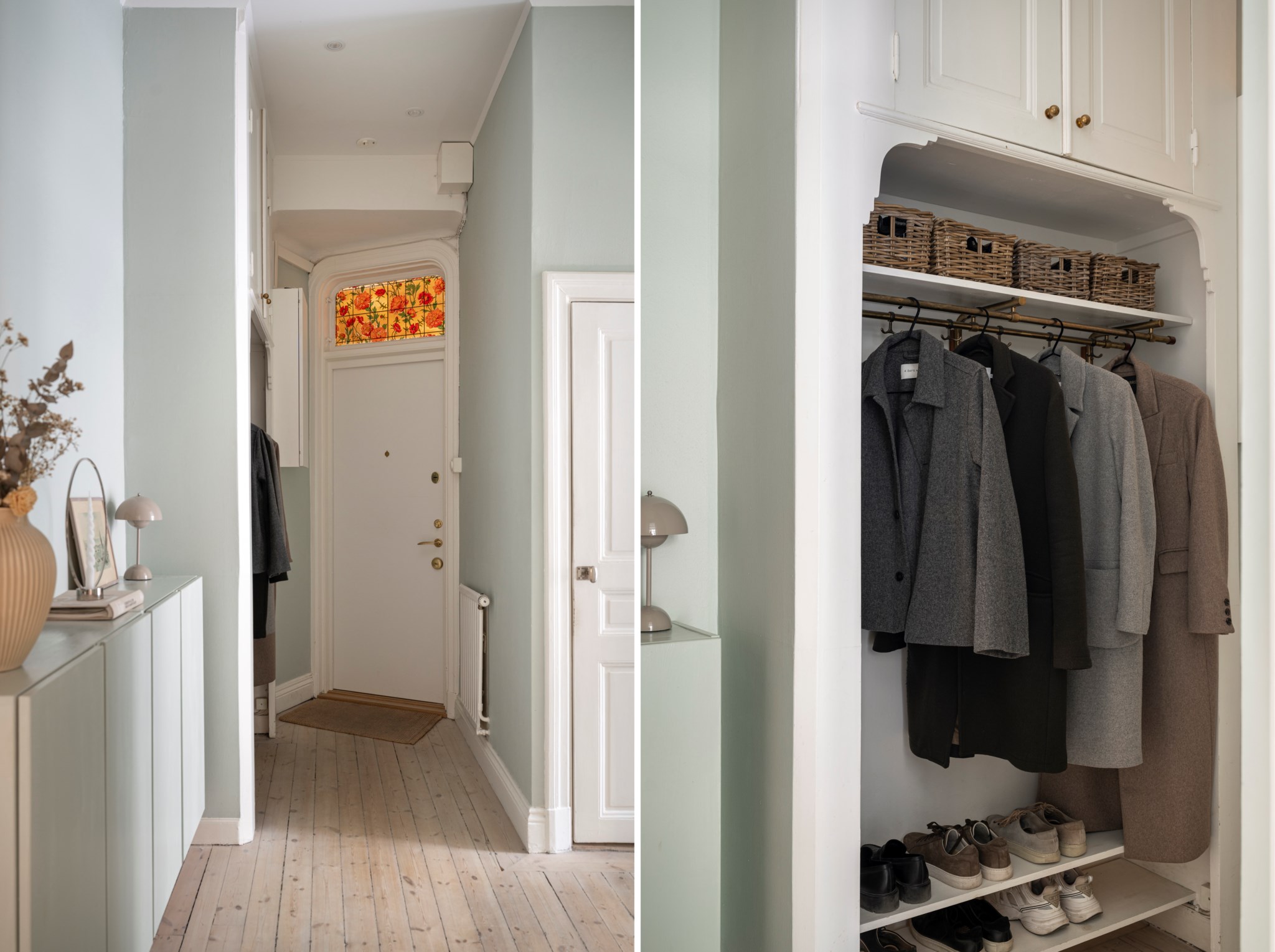 Välkomnande hall med plats för avhängning, skoställ samt mindre avlastningsmöblemang efter smak och behov. Gott om plats för förvaring via intilliggande garderob. Tidlösa ytskikt bestående av ljusa väggar och ljust trägolv.