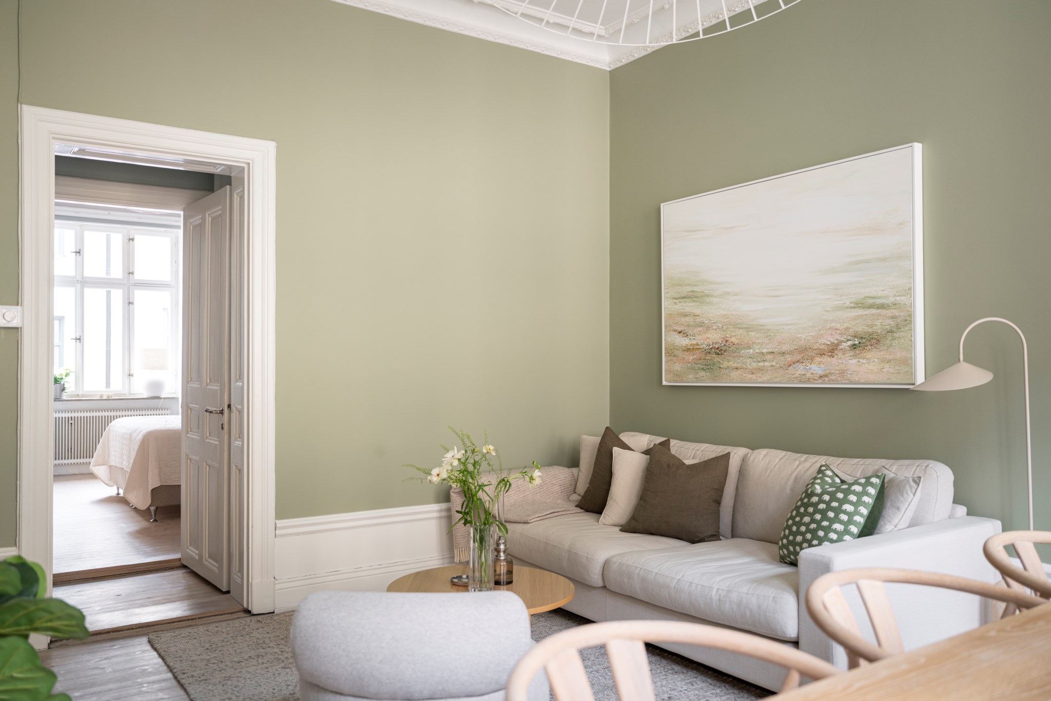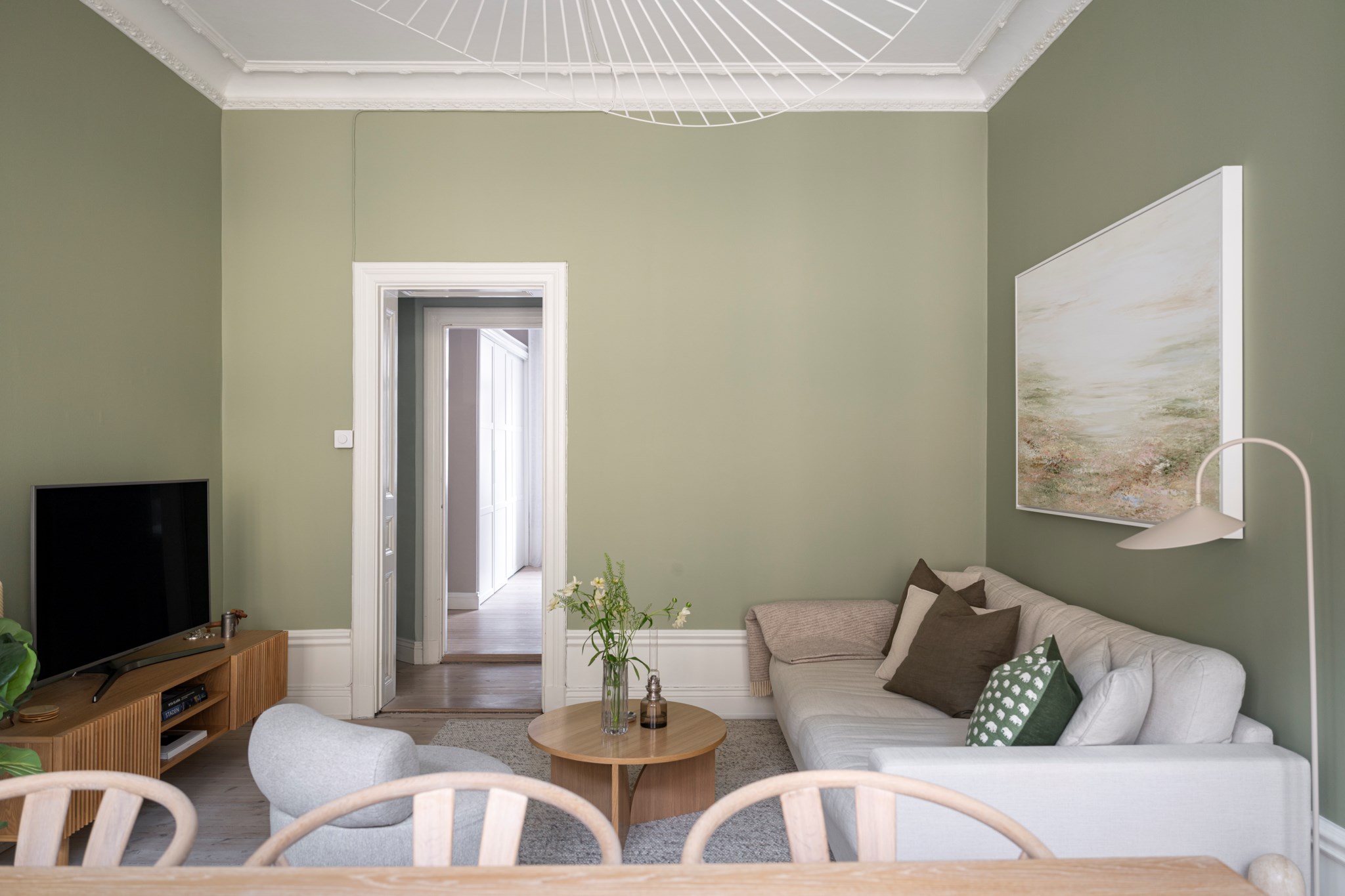 Luftigt vardagsrum med tidlösa ytskikt bestående av mörka väggar, bröstpanel och ljust trägolv. I vardagsrummet inryms matgrupp, soffa, soffbord, TV-möbel samt annat möblemang efter smak och behov. Här möts du av ett härligt ljusinsläpp via stora spröjsade fönster. Taket pryds av vackra stuckaturer.
