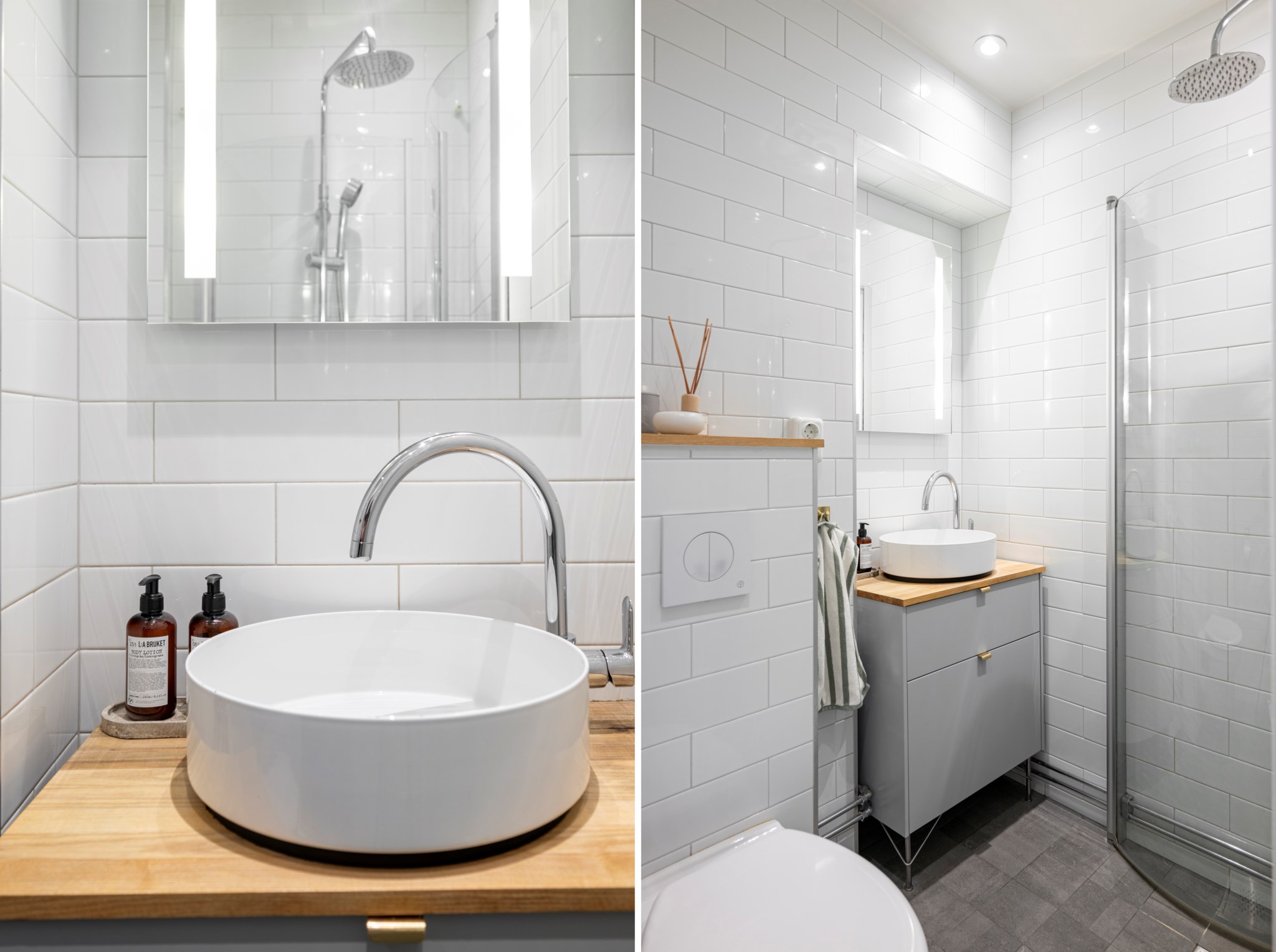 Rymligt badrum med moderna detaljer och väggar och golv i neutrala nyanser. Badrummet är utrustat med WC, skålformat handfat ovan kommod, spegel med belysning samt dusch med glasväggar.