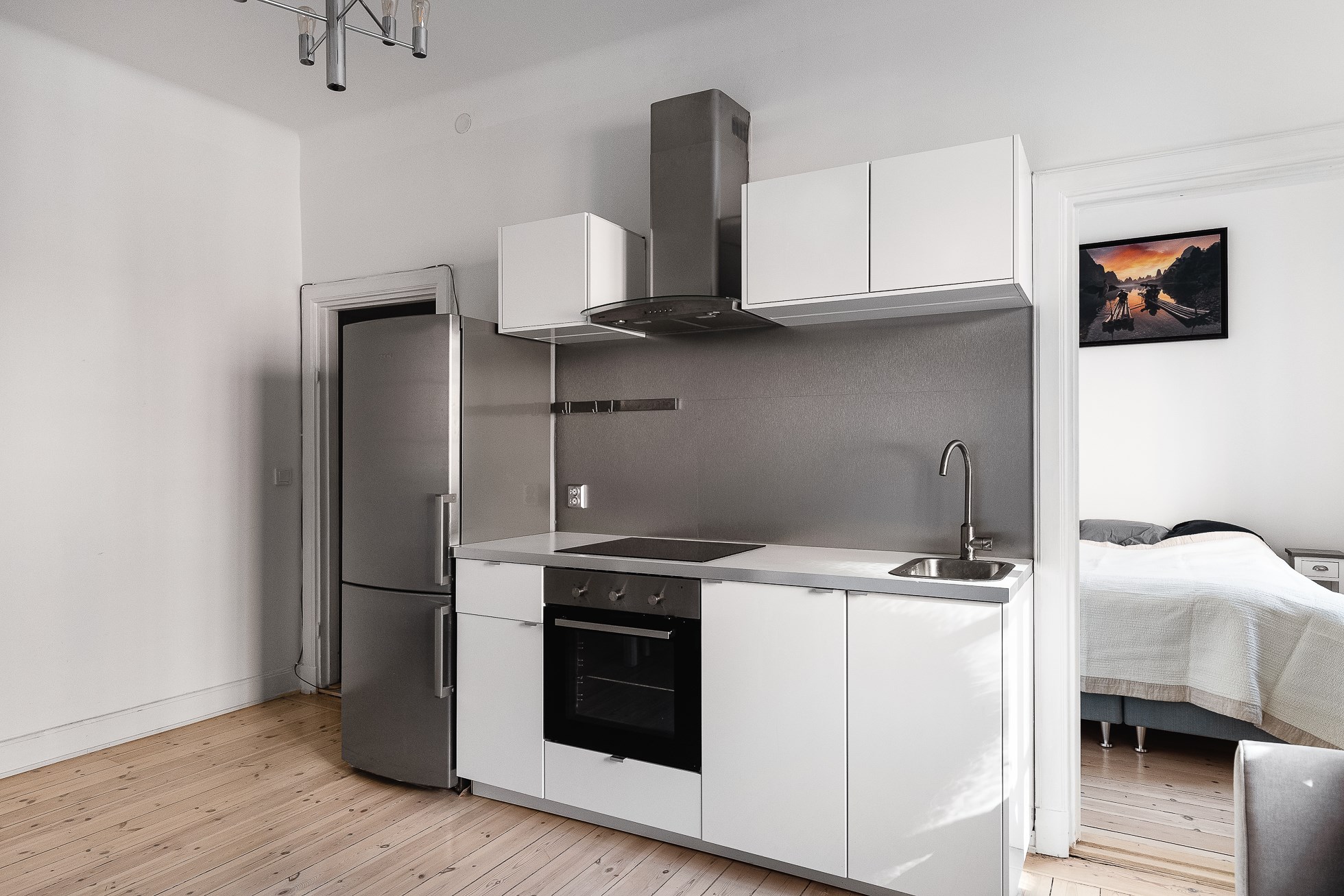 Harmoniskt sovrum med trägolv och ljusa väggar. Plats för en rymlig säng och sängbord.