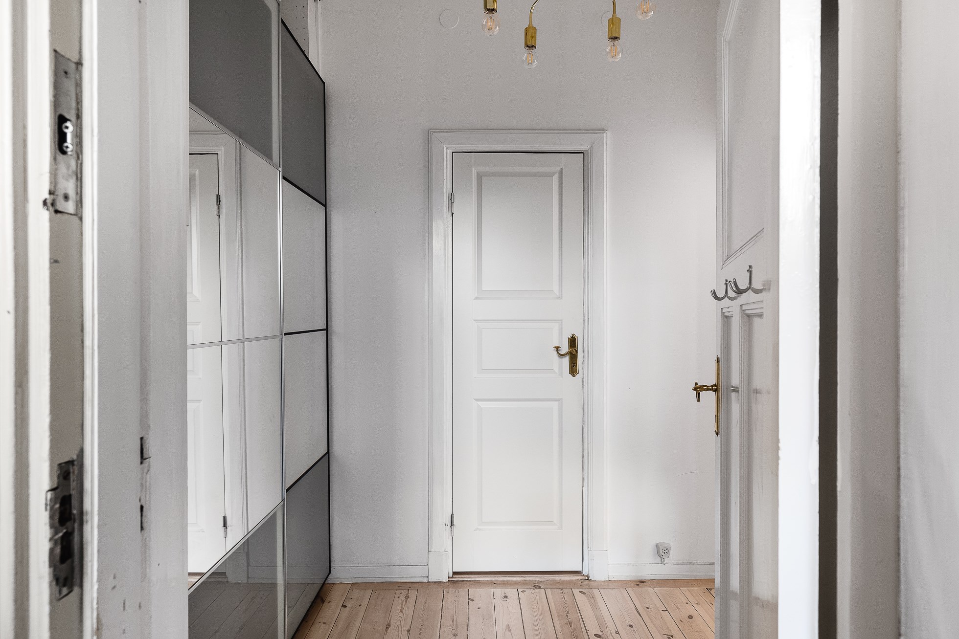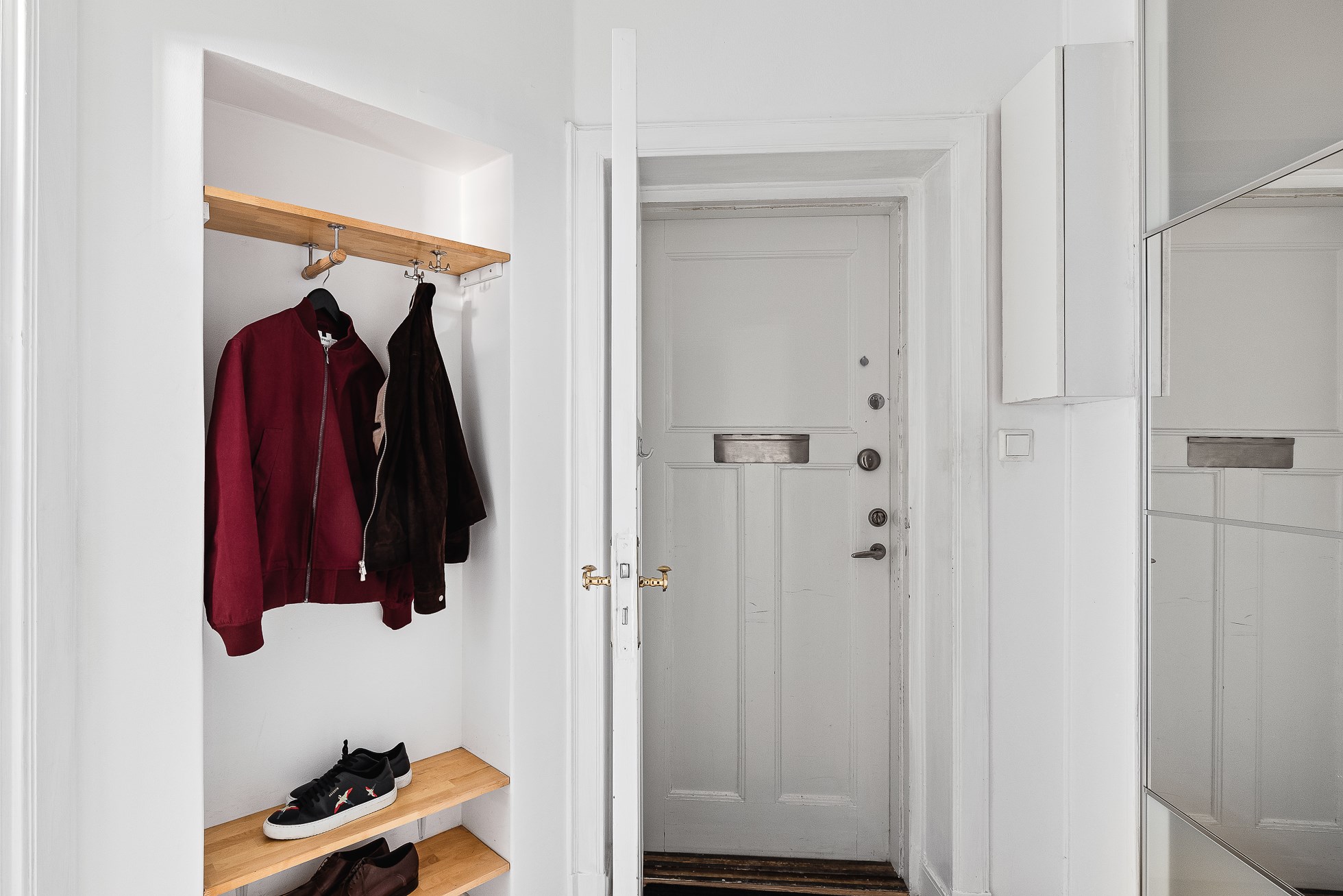 Välkomnande hall med trägolv och ljust målade väggar. Avhängningsmöjligheter invid entré samt gott om förvaring i garderobsparti med skjutdörrar.
