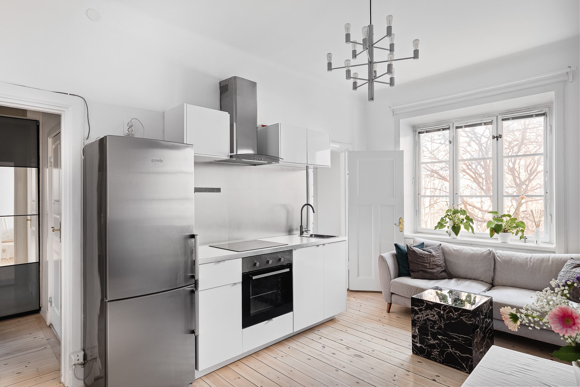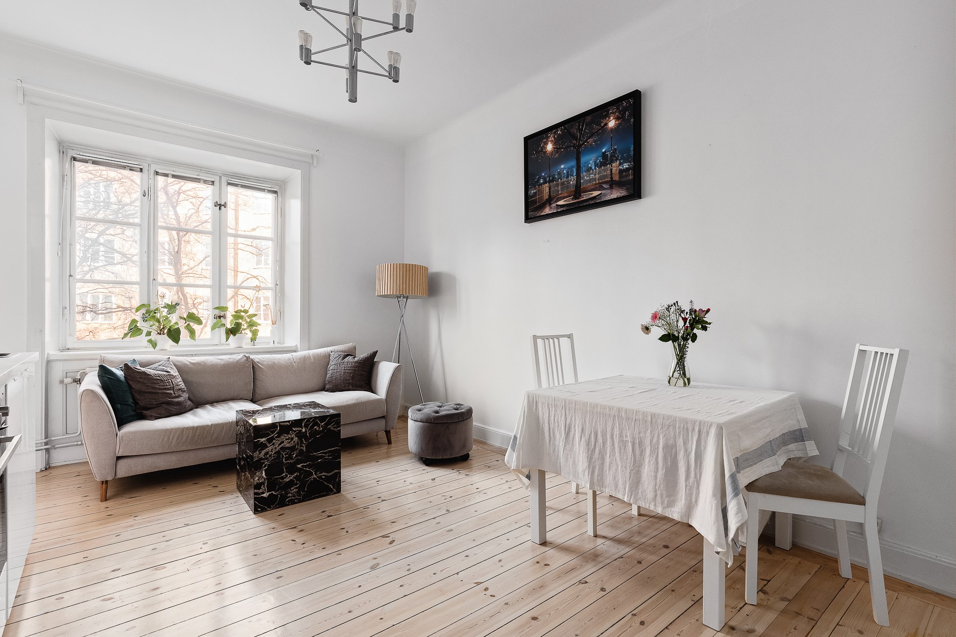 Stilfullt vardagsrum med trägolv och ljusa väggar. Fantastiskt ljusinsläpp från stort fönsterparti. Plats för soffmöblemang, matplats och övrig önskad inredning.