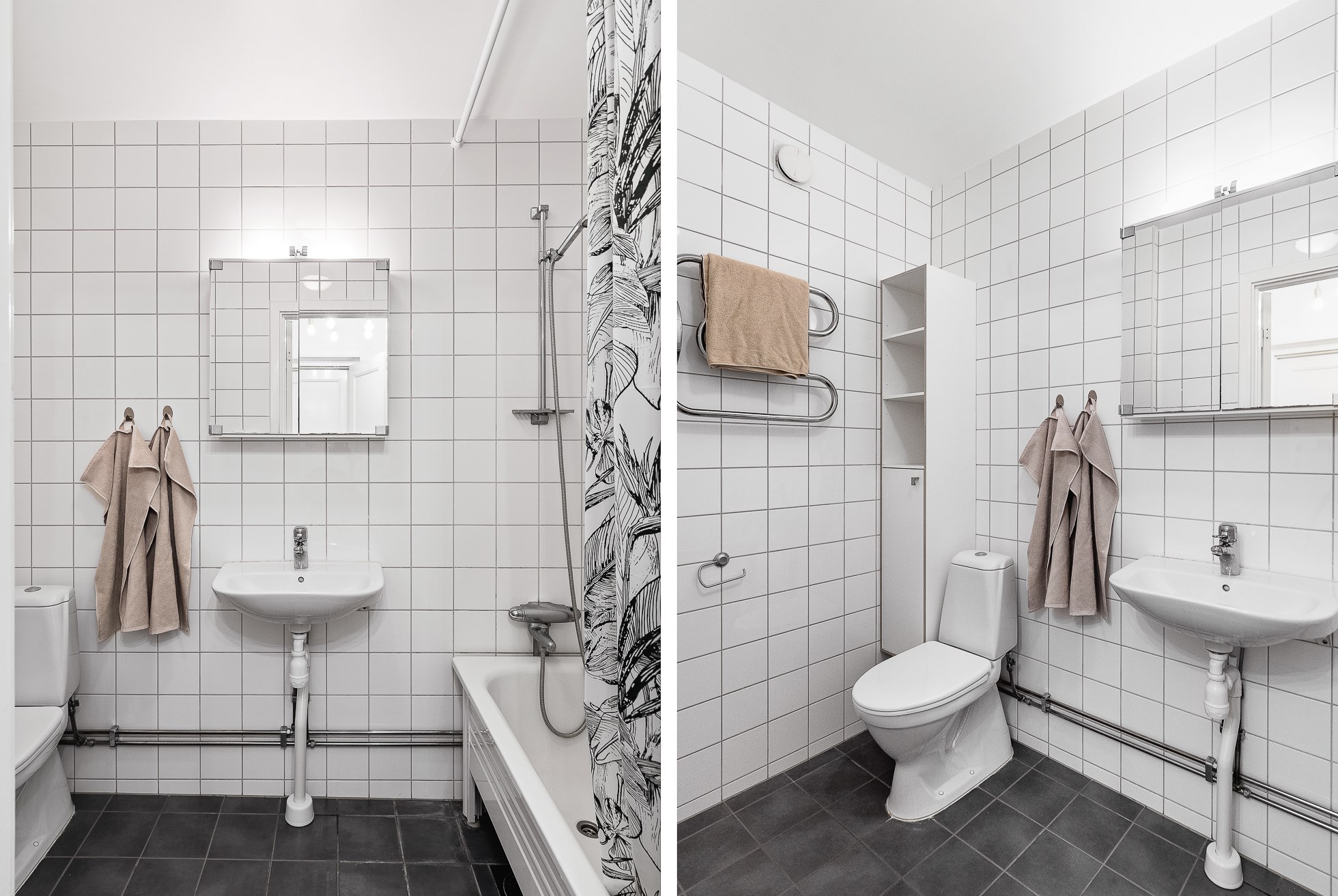 Fräscht badrum med grått klinker och ljust kaklade väggar. Utrustat med badkar, handfat, spegelskåp och WC.