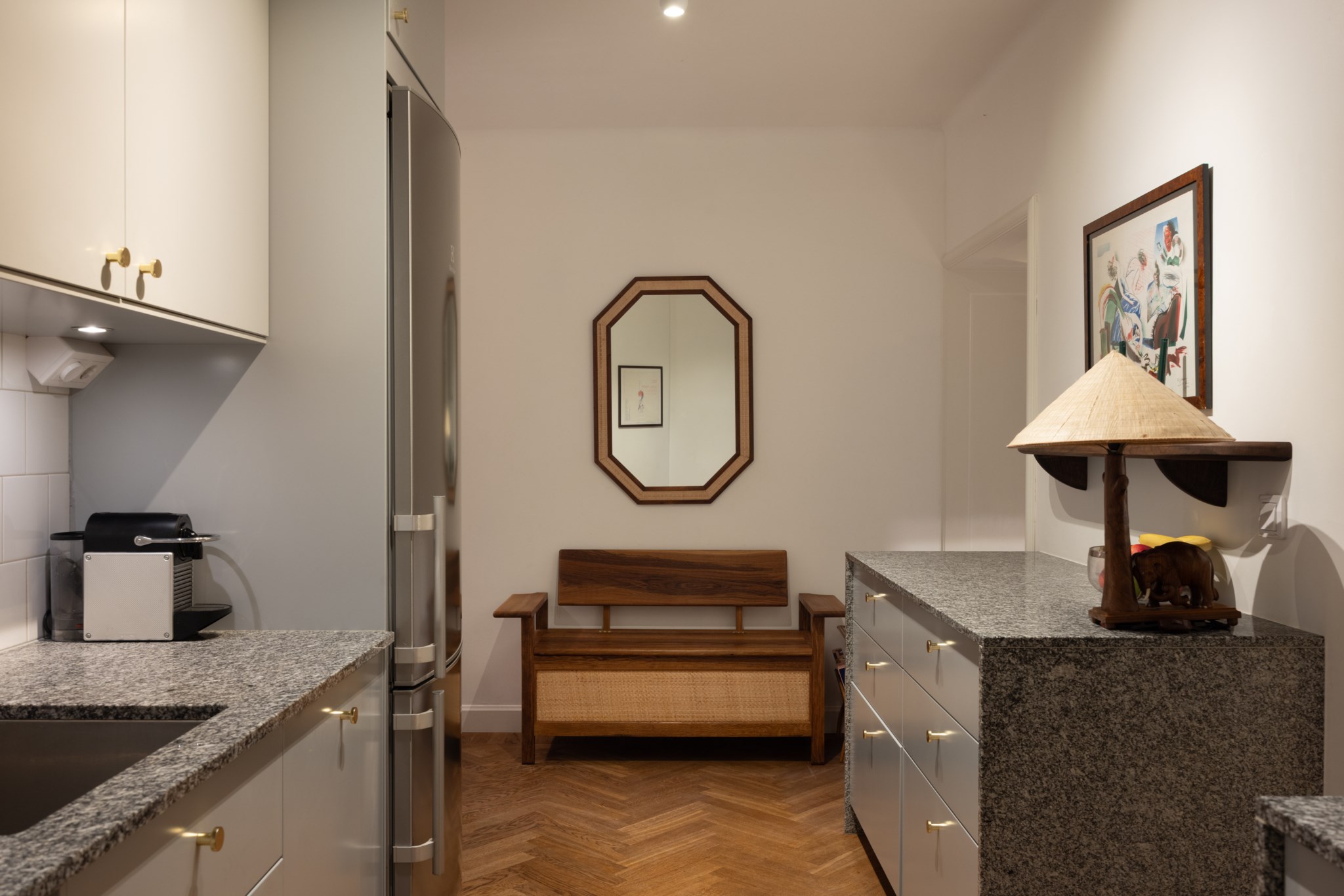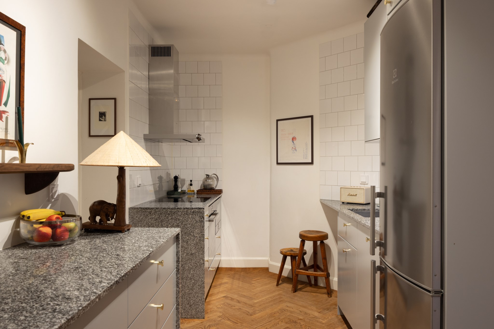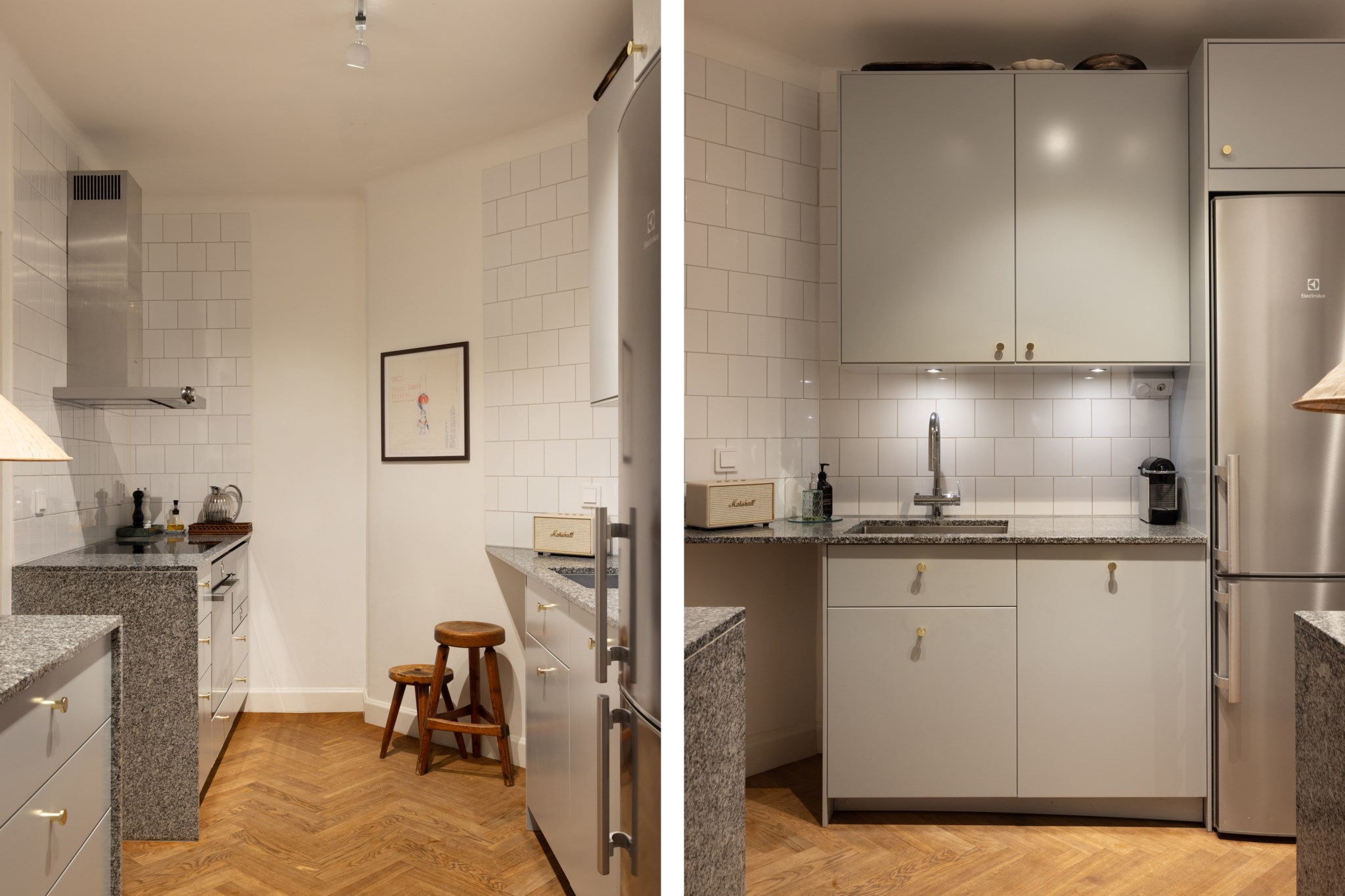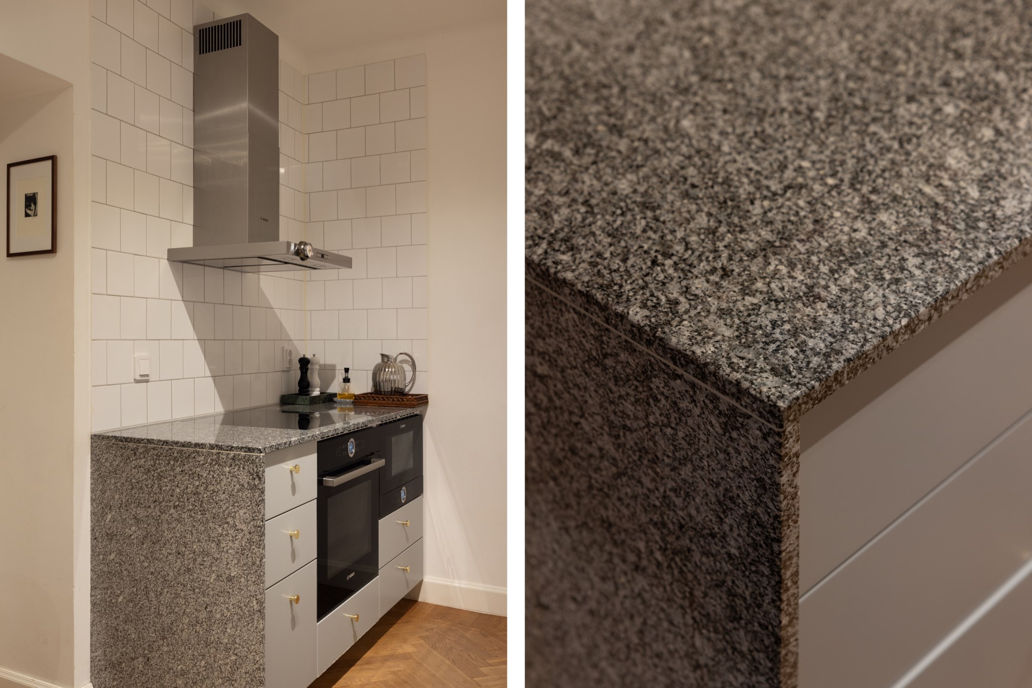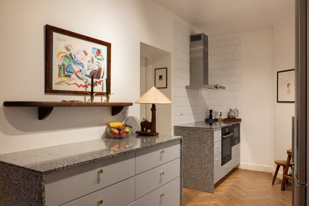 Kök med ljusa skåpluckor och gråmelerad bänkskiva. Köket är utrustat med induktionshäll, spis, ugn, mikro, kyl/frys och fläkt. De ljusa väggarna är klädda med vita kakelplattor. Det finns gott om arbetsytor och förvaringsmöjligheter i både över- och underskåp. Golvet är belagt med fiskben.
