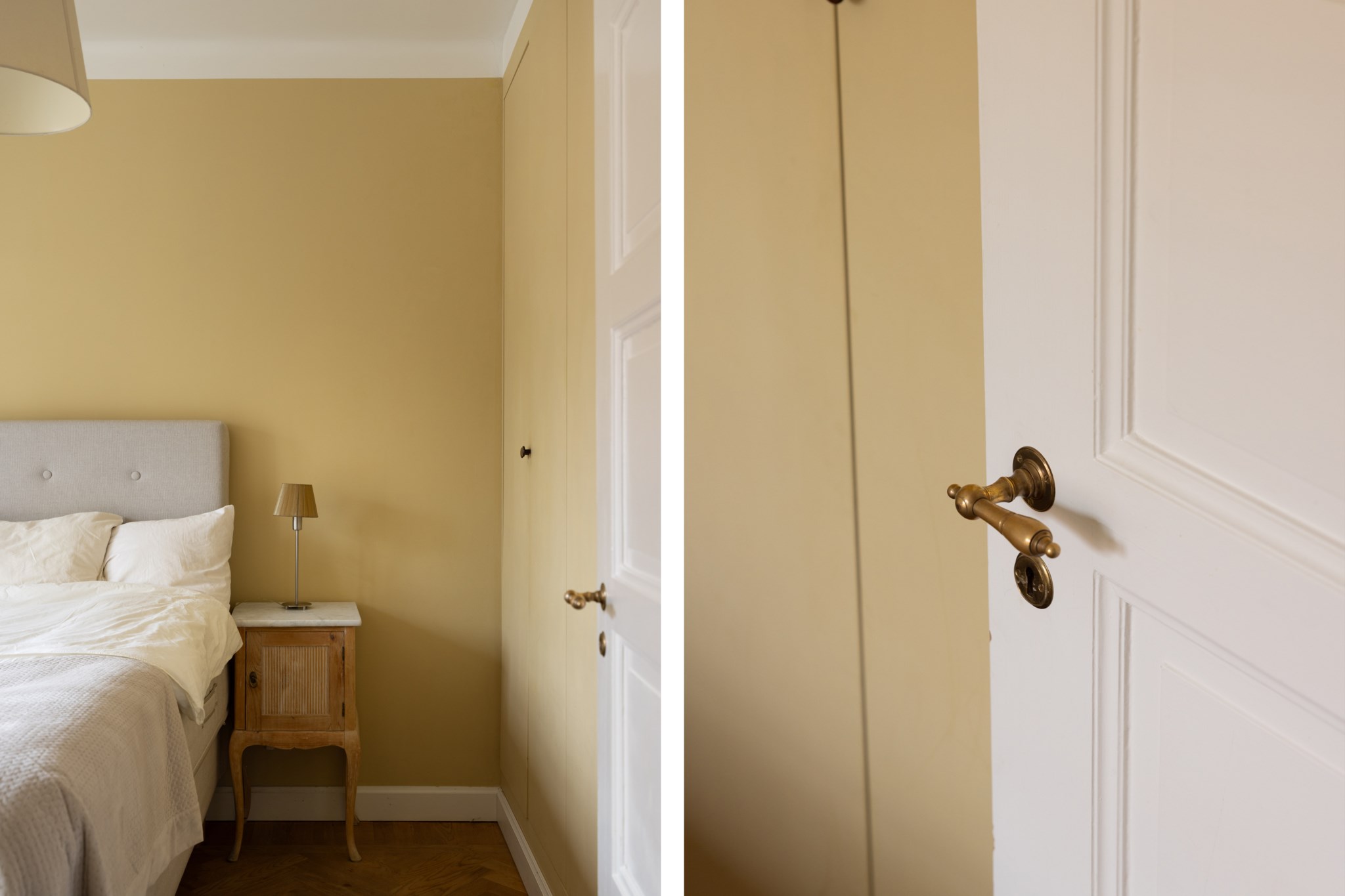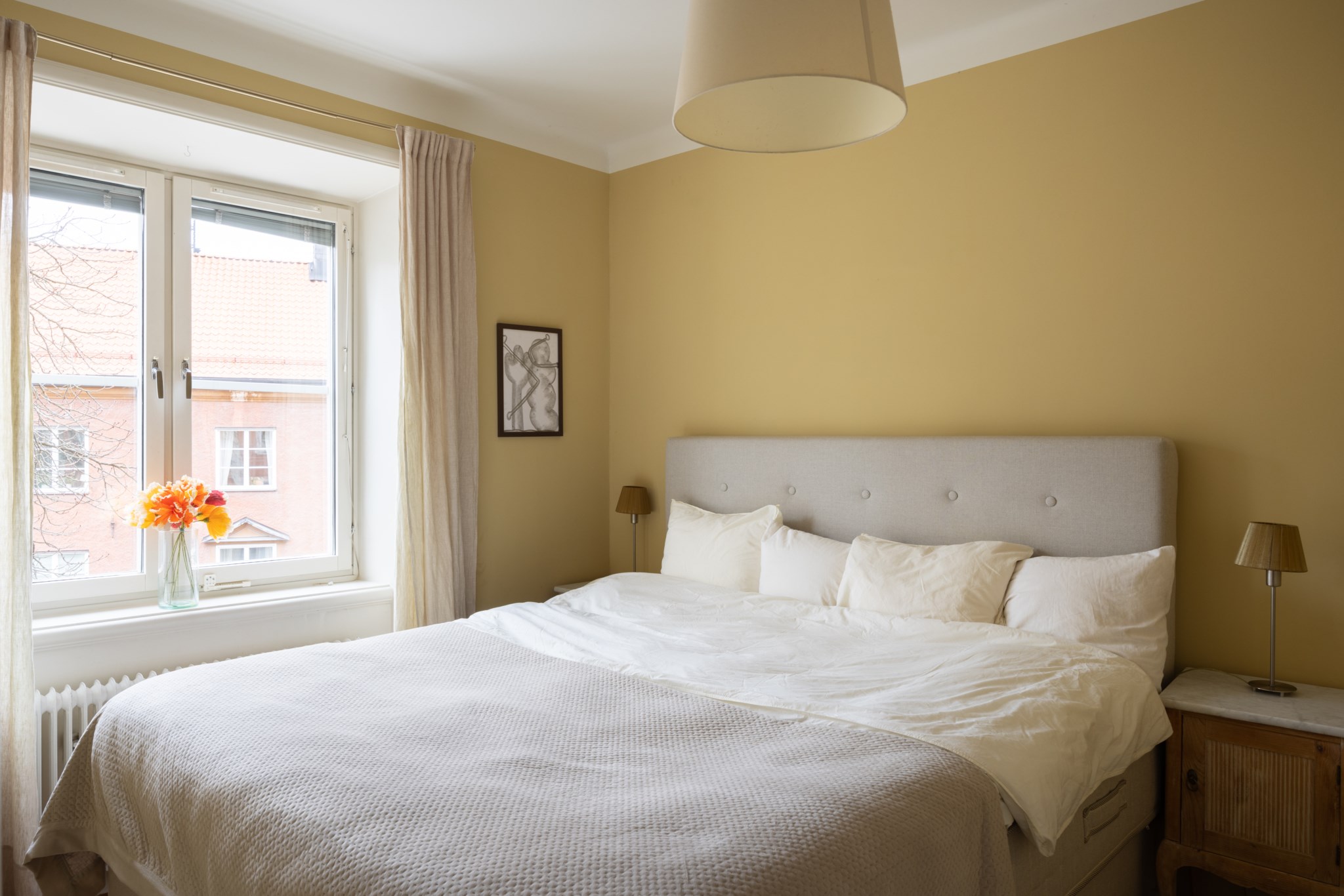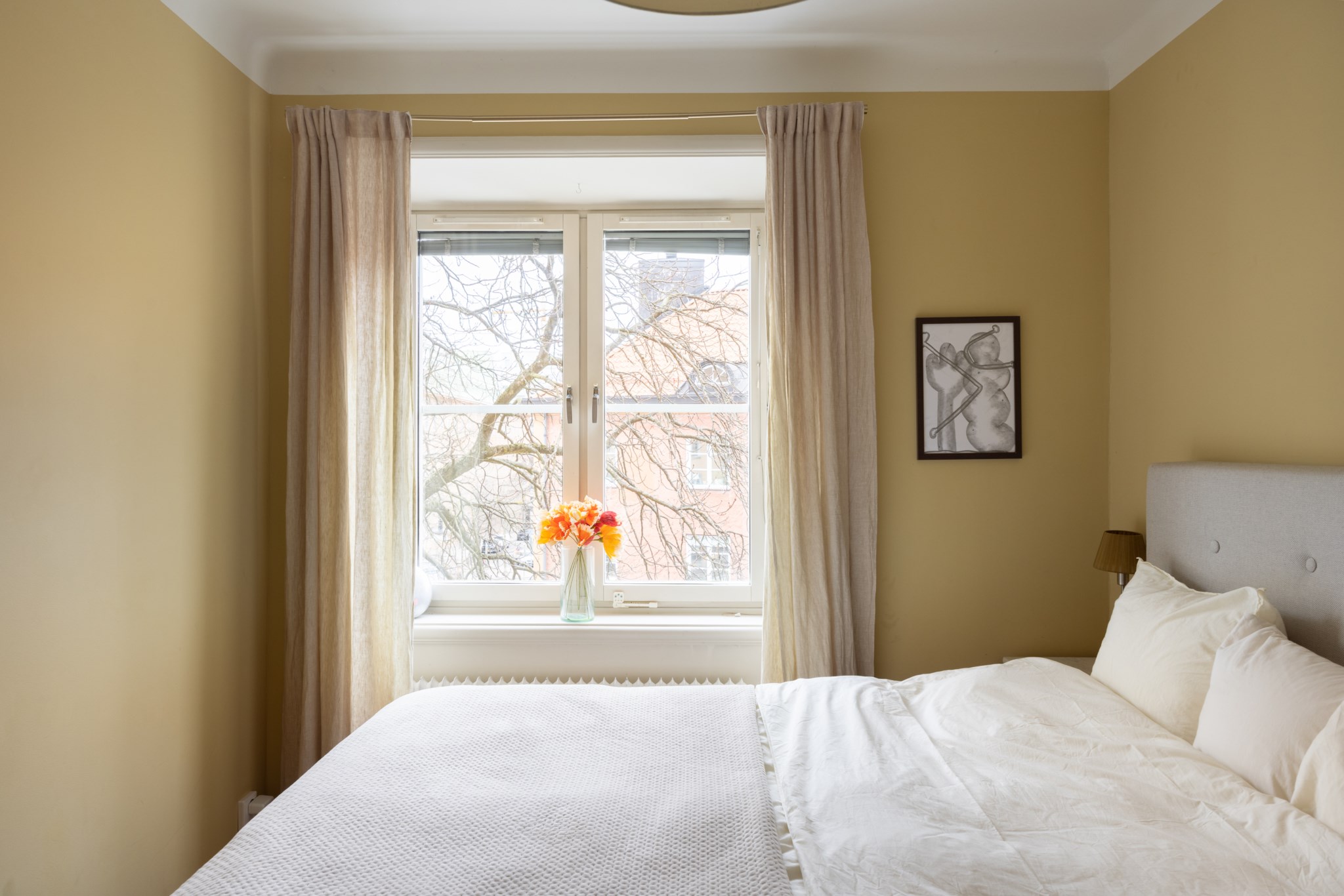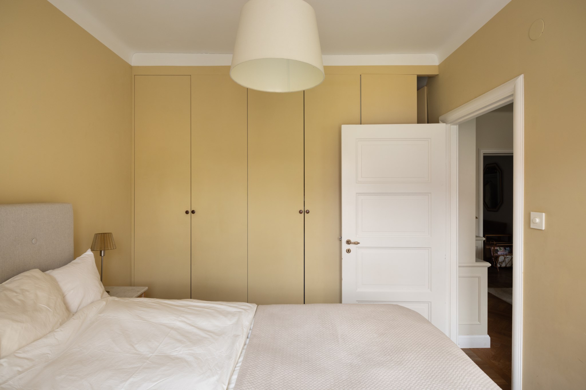 Lugnt och rogivande sovrum med väggar i en gul nyans. Här finns plats för säng och nattduksbord, och fönstret släpper in ett behagligt, naturligt ljus som ger rummet en trivsam känsla. Längs ena väggen finns inbyggda garderober som skapar praktisk förvaring.