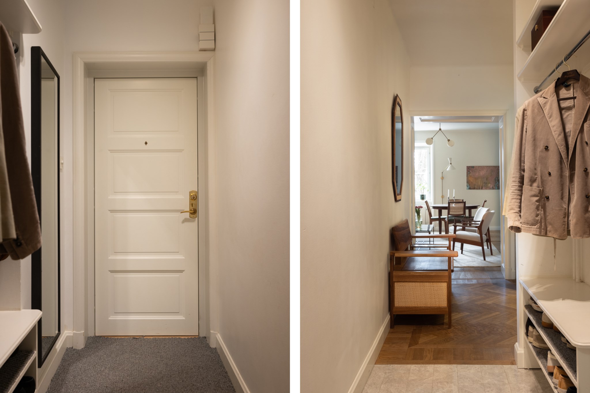 Ljus och välkomnande hall med plats för avhängning och annat önskat möblemang. Från hallen nås både vardagsrum och kök. Hallen pryds av ett ljust klinkergolv som är både praktiskt och stilrent, vilket övergår i ett vackert fiskbensgolv.
