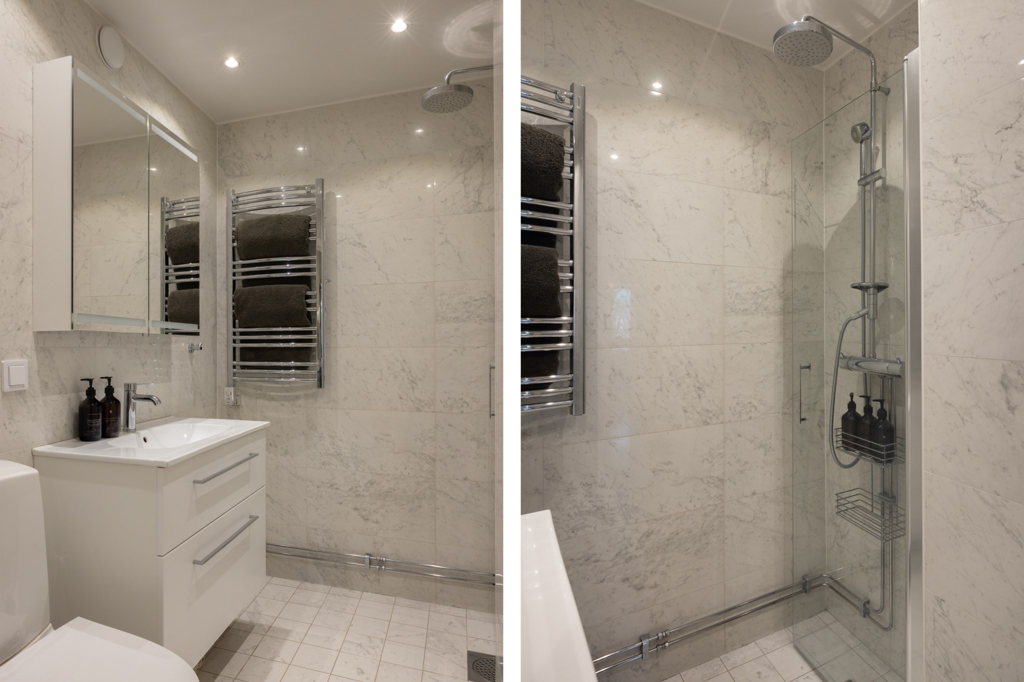 Ljust och fräscht helkaklat badrum med WC, handfat med kommod, spegelskåp och handdukstork. Duschhörna med takdusch och svängbar duschvägg.