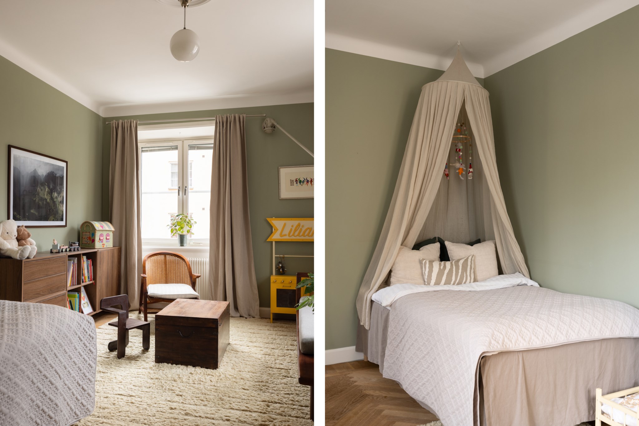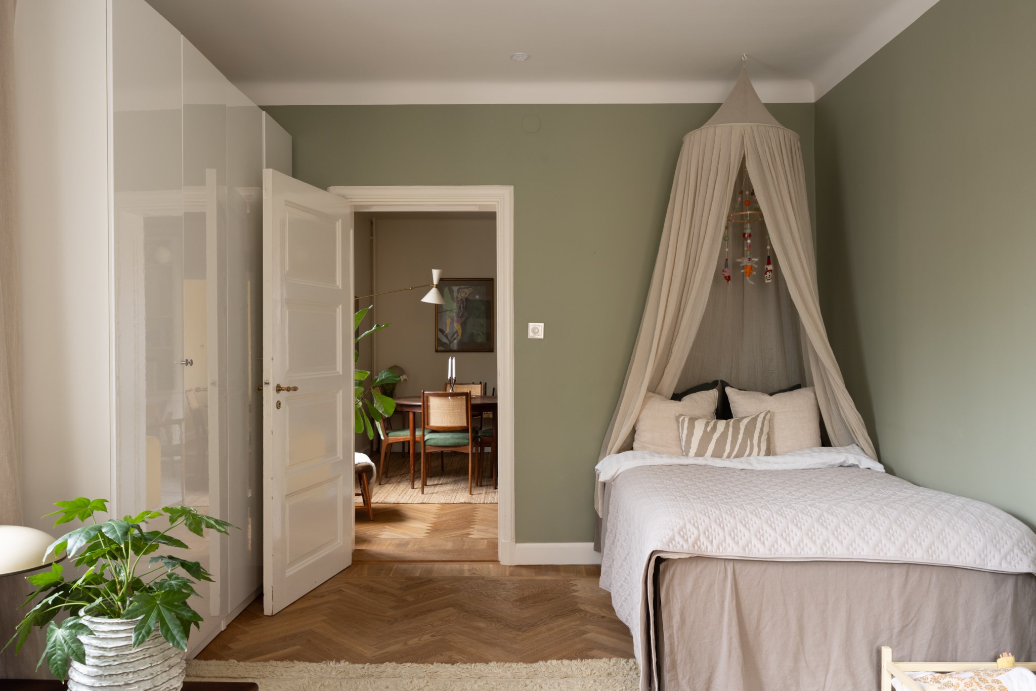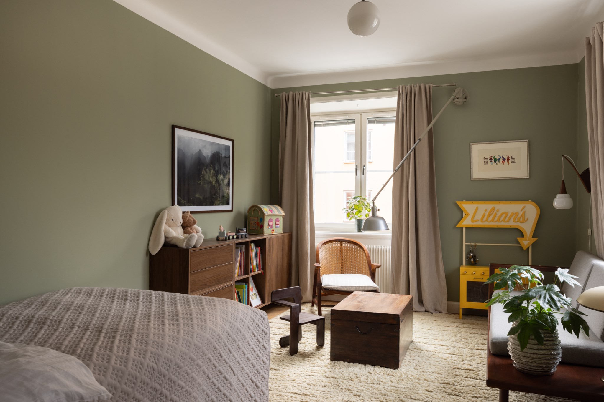 Lugnt och rogivande sovrum, alternativt arbetsrum, med väggar målade i en harmonisk grön nyans. Rummet erbjuder plats för både säng och övrig möblering efter behov, och fönstren släpper in ett behagligt, naturligt ljus som skapar en trivsam atmosfär.