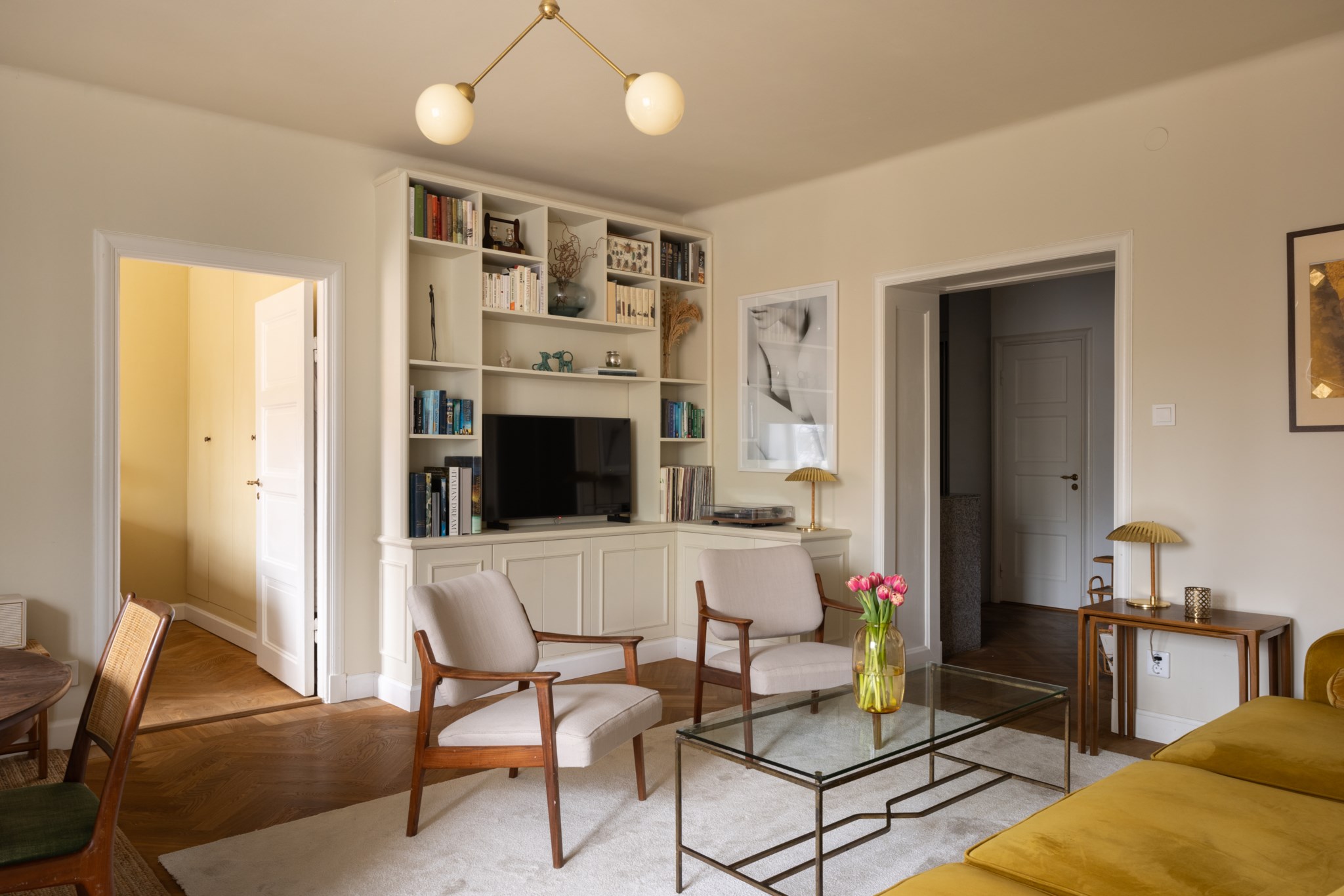 Socialt och inbjudande vardagsrum med harmonisk väggkulör och generöst ljusinsläpp från stora fönsterpartier. Här finns gott om plats för soffgrupp, matbord och andra möbler efter behov. Den inbyggda bokhyllan ger både smart förvaring och en perfekt möjlighet att sätta din personliga prägel på rummet.