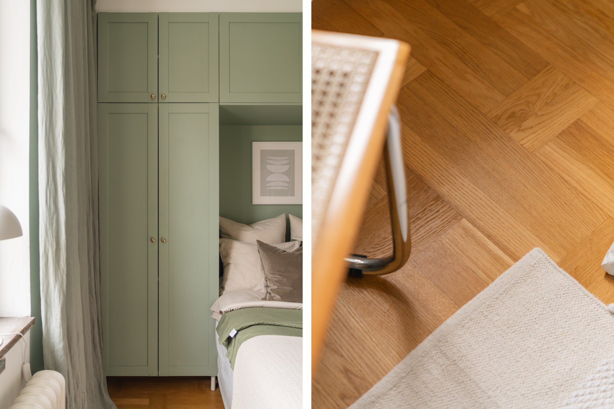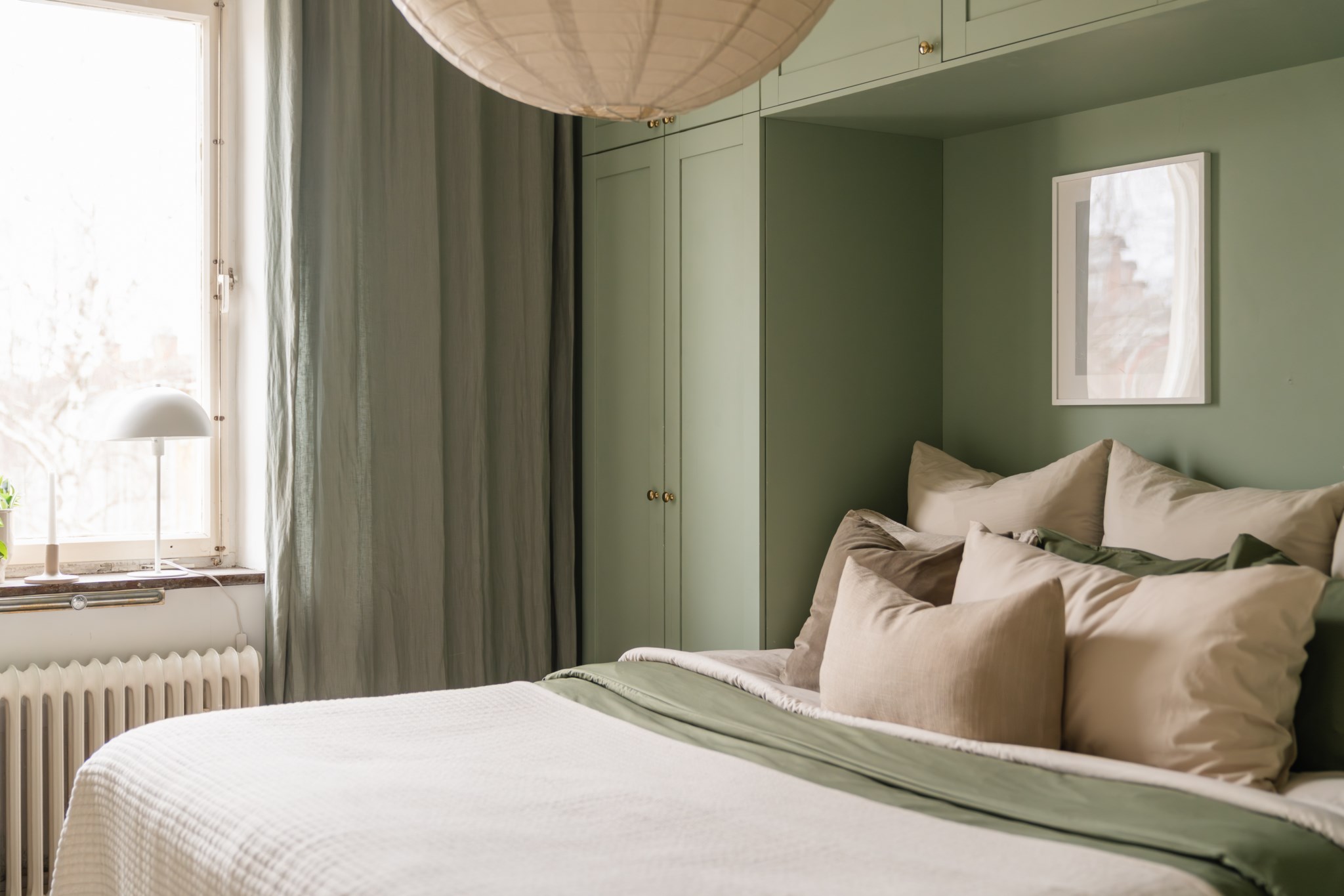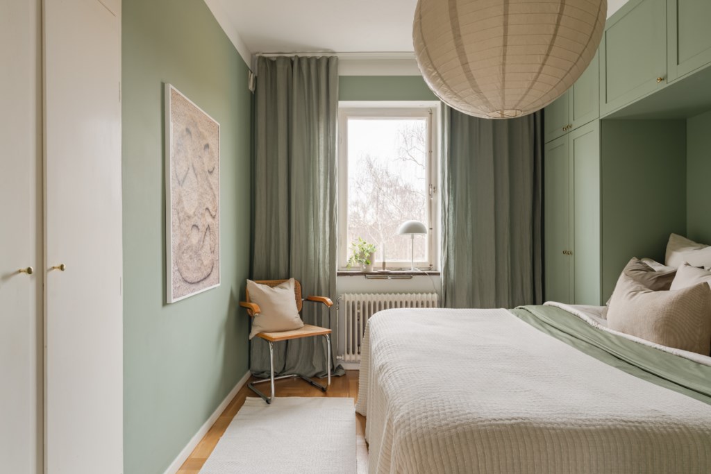 Stort sovrum med plats för dubbelsäng och annat möblemang efter smak och behov. Gott om plats för förvaring via platsbyggda garderober. Ett härligt ljusinsläpp tar sig in via fönster. Tidlösa ytskikt bestående av ljusa väggar i en grön nyans och ljust golv.