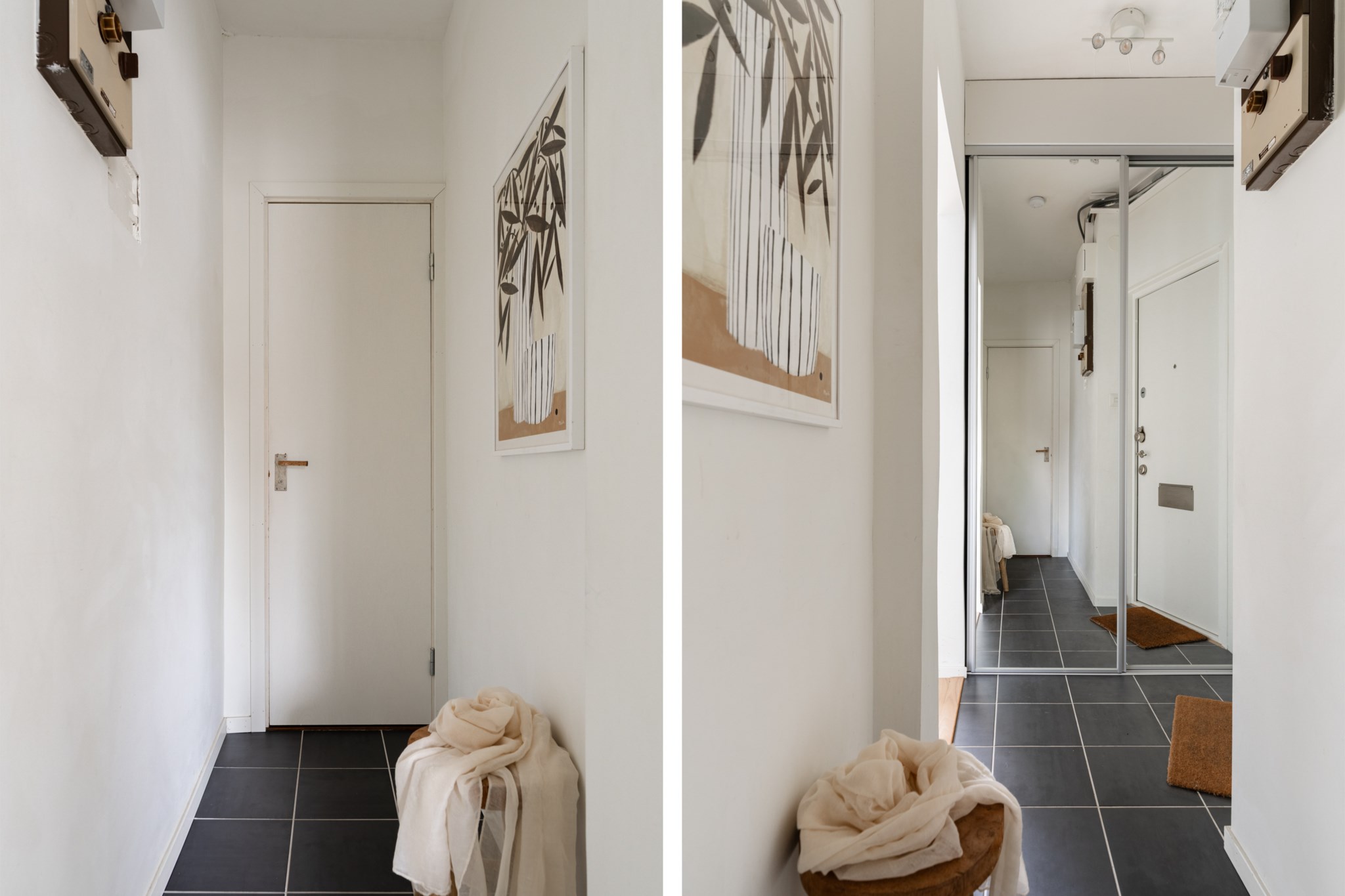 Välkomnande hall med plats för avhängning, skoställ samt mindre avlastningsmöblemang efter smak och behov. Gott om plats för förvaring via intilliggande garderober. Tidlösa ytskikt bestående av ljusa väggar och mörkt klinker.