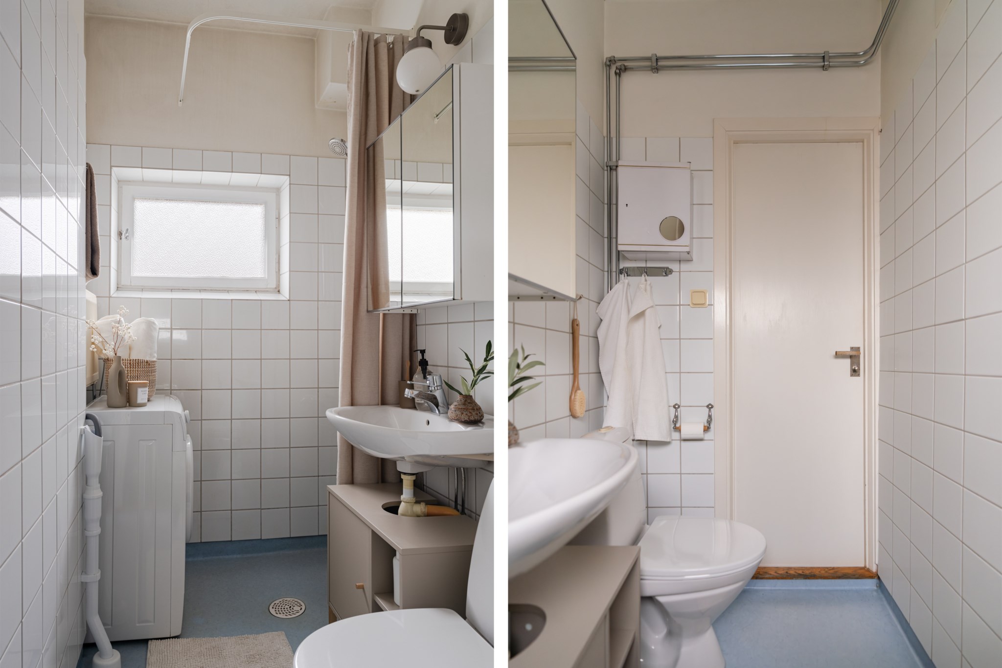 Rymligt badrum med kakel i vitt och linoleummatta i en blå nyans. Badrummet är utrustat med WC, handfat ovan kommod, spegelskåp, samt dusch. Extra bekvämligheter genom en tvättmaskin.