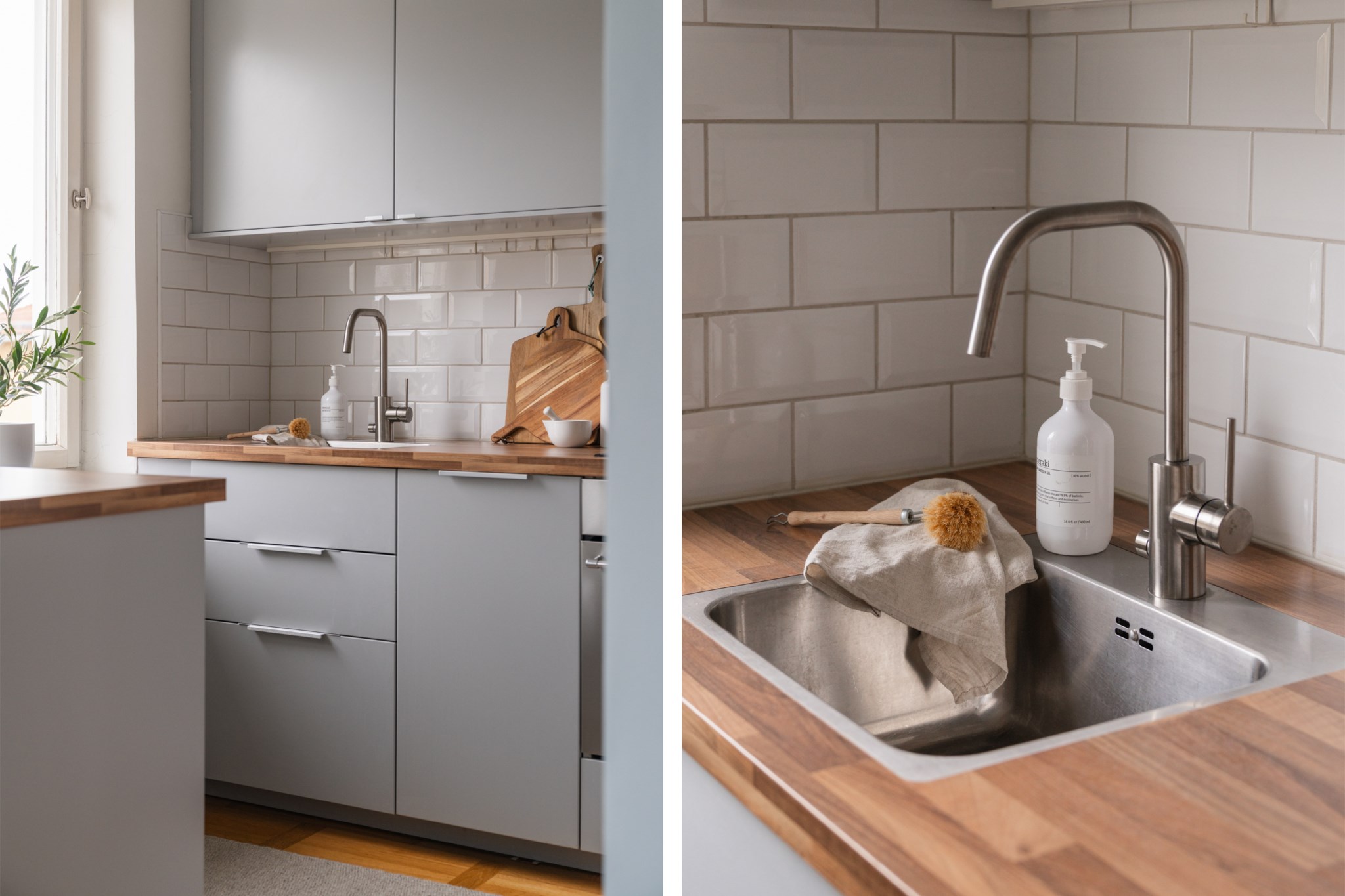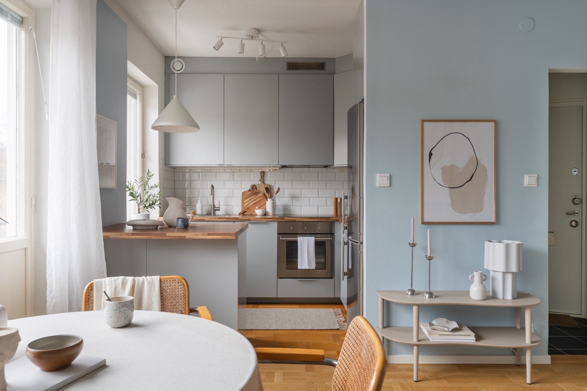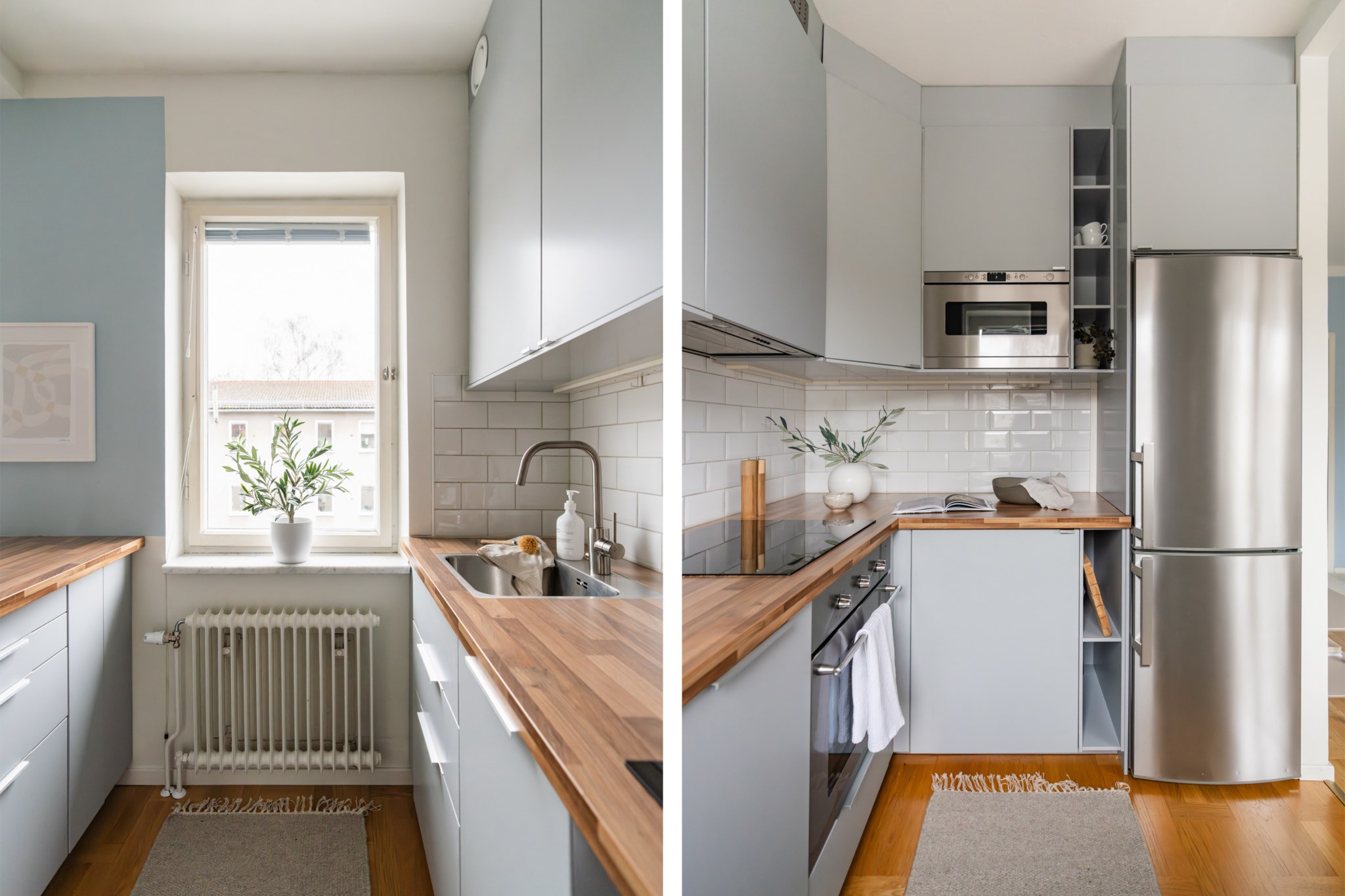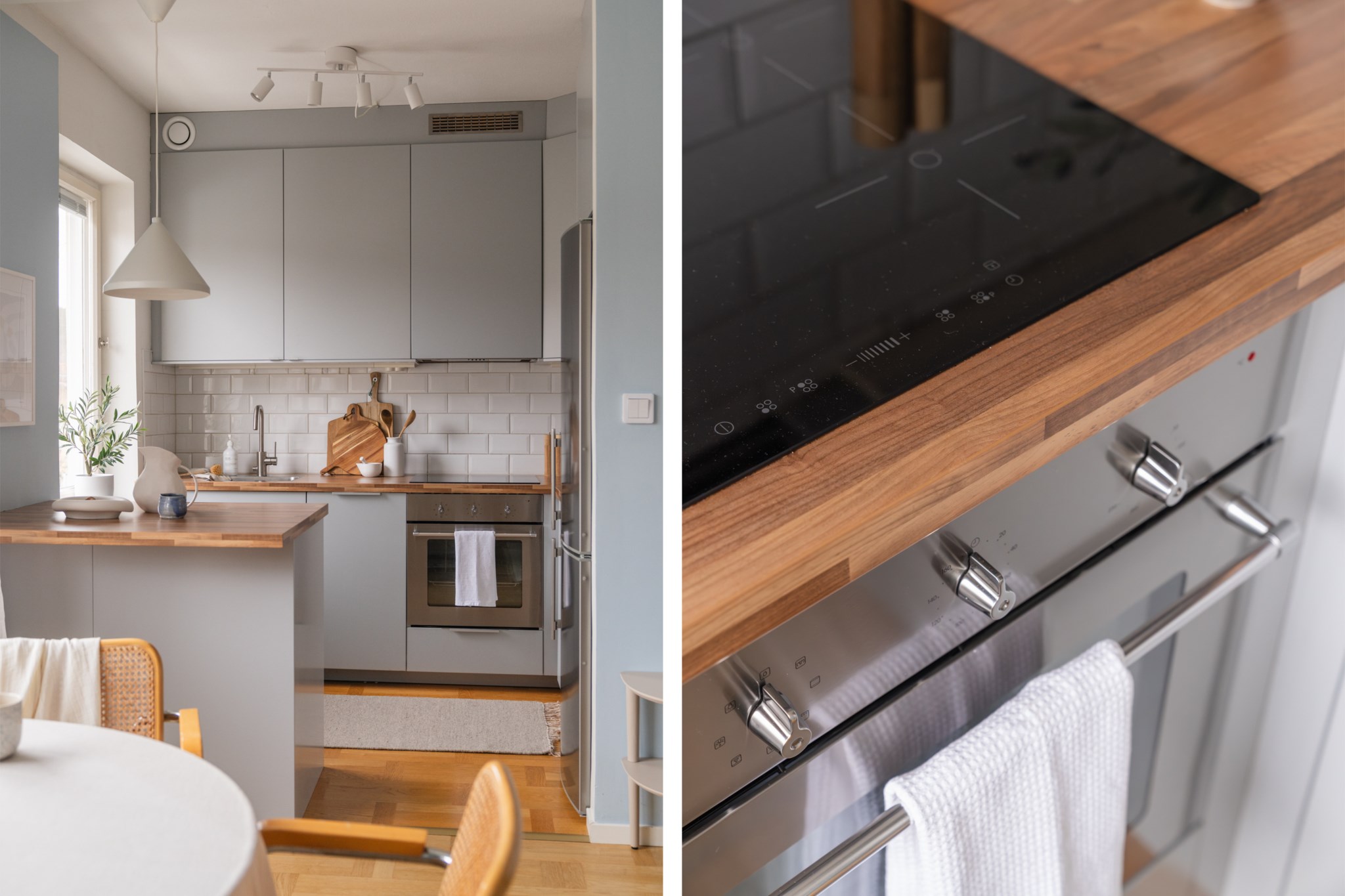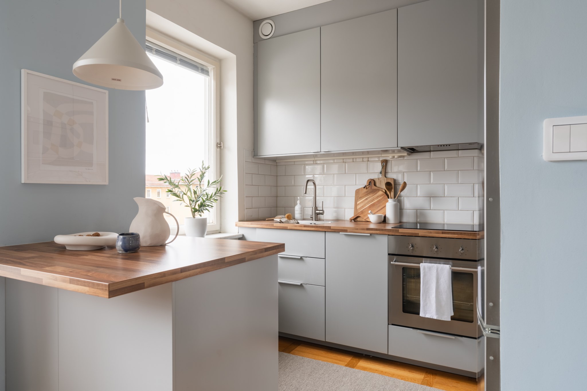 Modernt kök med smakfulla materialval bestående av köksluckor i en grå nyans och bänkskiva i trä med stänkskydd ovan i vitt. Den maskinella utrustningen består av diskho, induktionshäll, kolfilterfläkt, ugn, micro, diskmaskin samt kyl och frys. Tidlösa ytskikt bestående av ljusa väggar i en blå nyans och ljust golv.