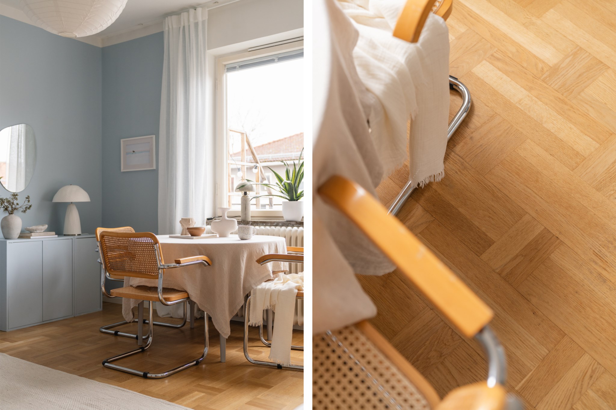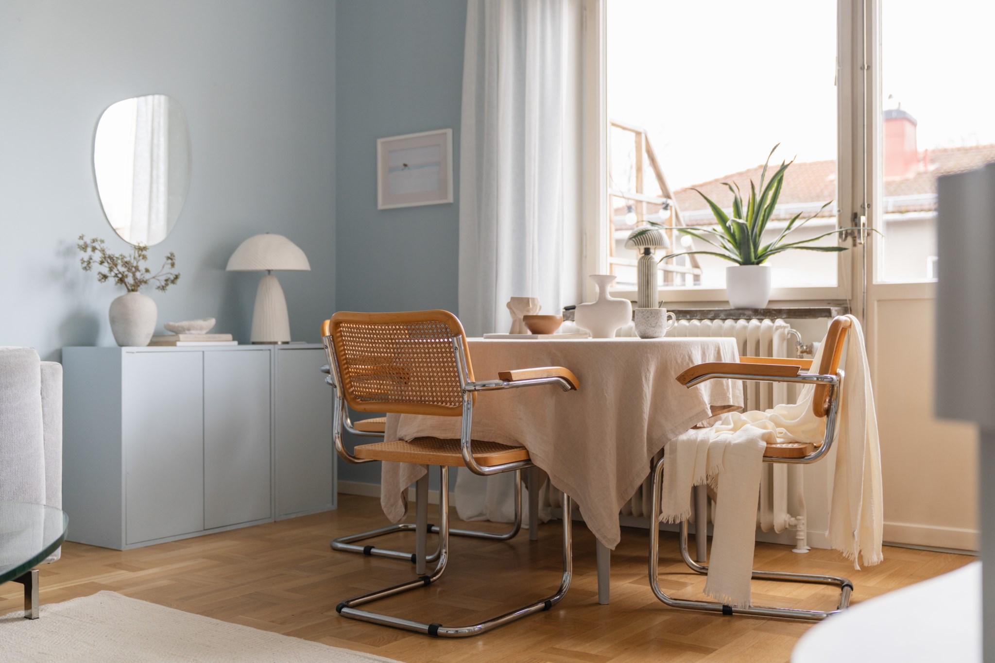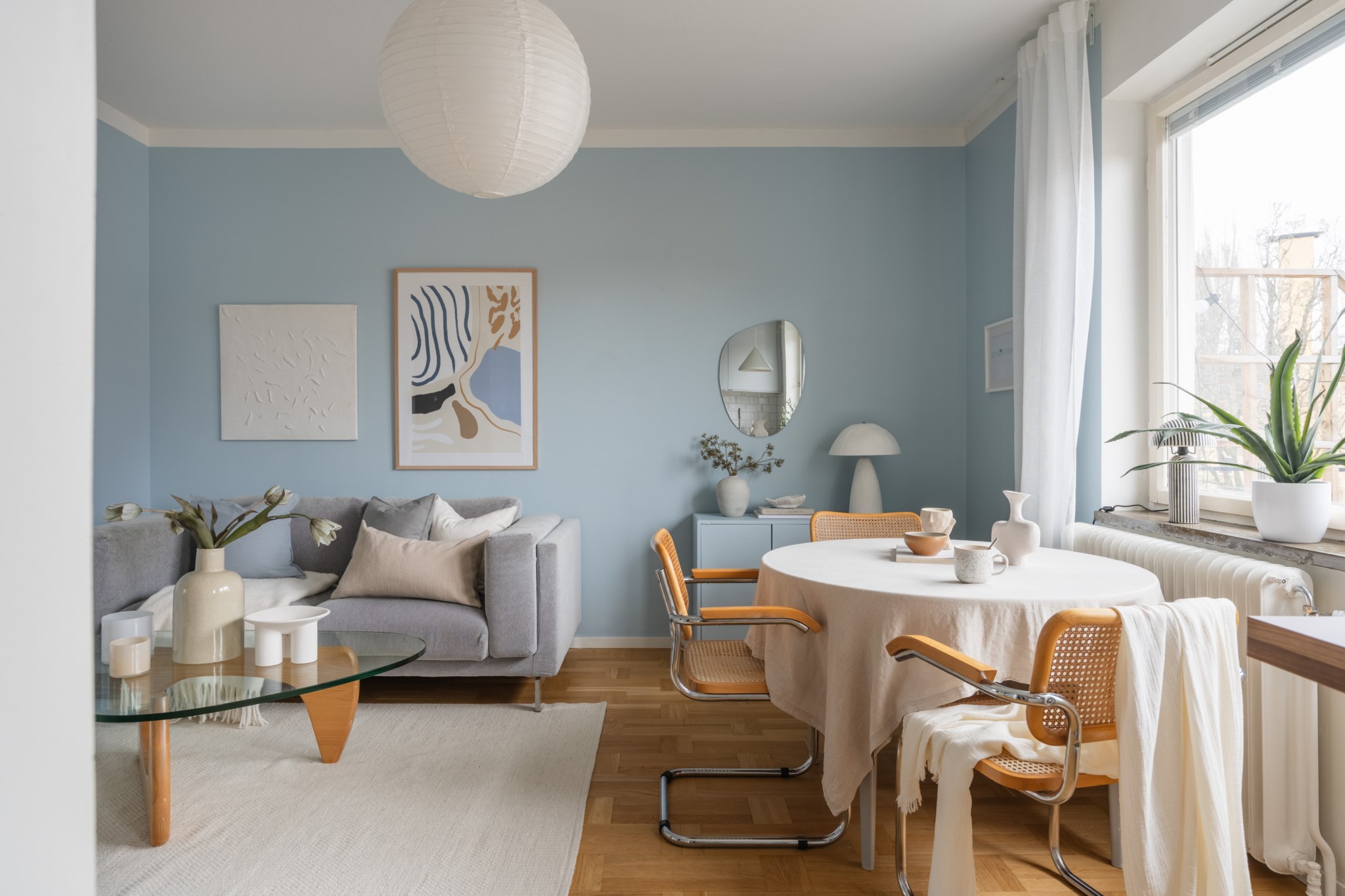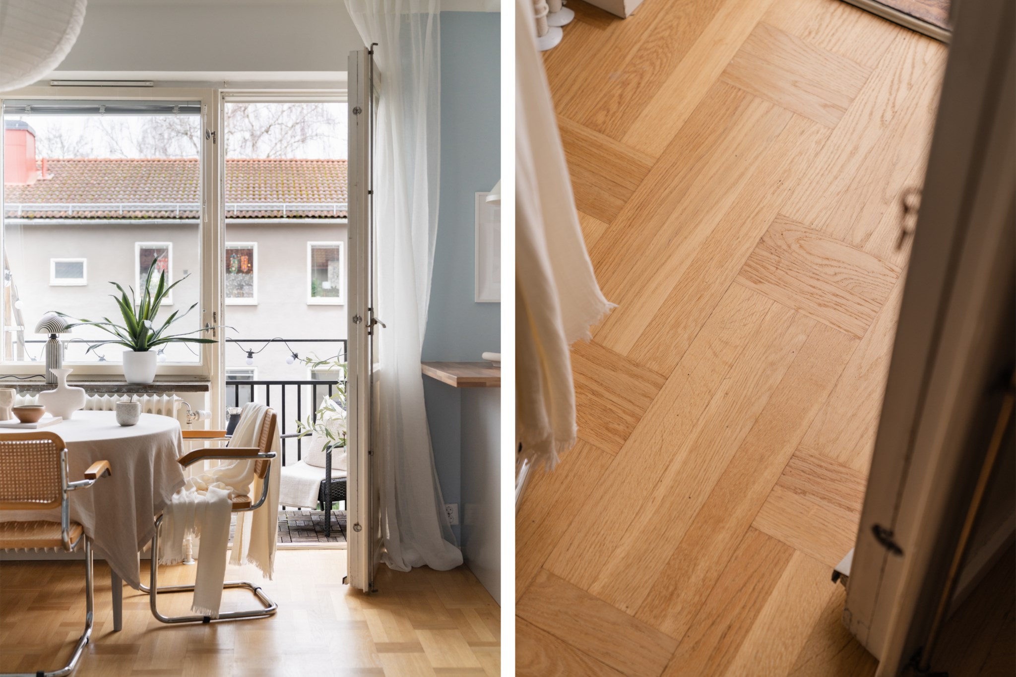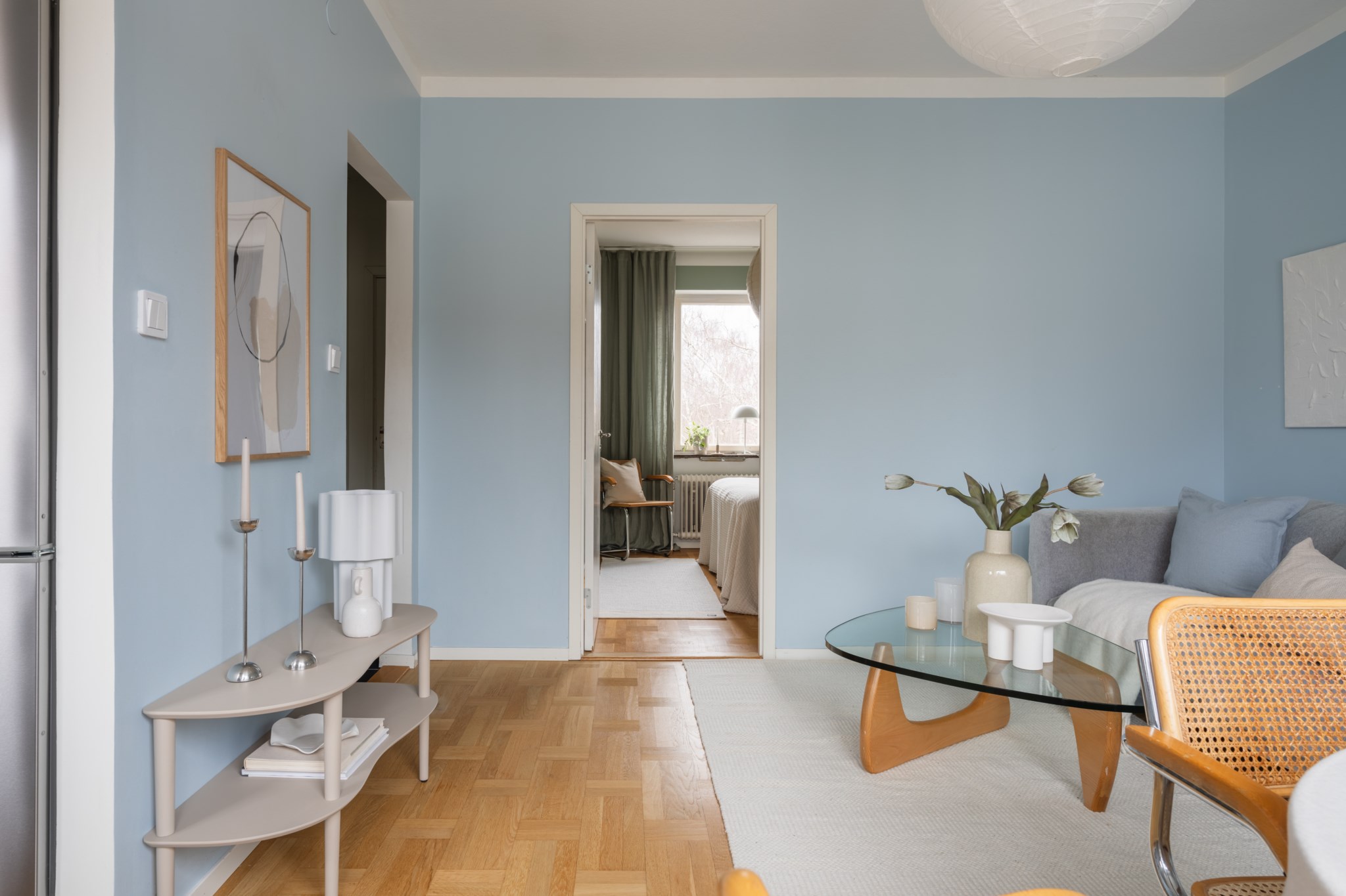 Bostaden erbjuder ett luftigt vardagsrum med generöst ljusinsläpp från stora fönsterpartier och plats för både soffgrupp och matbord. Härifrån nås balkongen som blir en naturlig förlängning av vardagsrummet under årets varmare månader – en härlig plats för morgonkaffet eller kvällssolen.