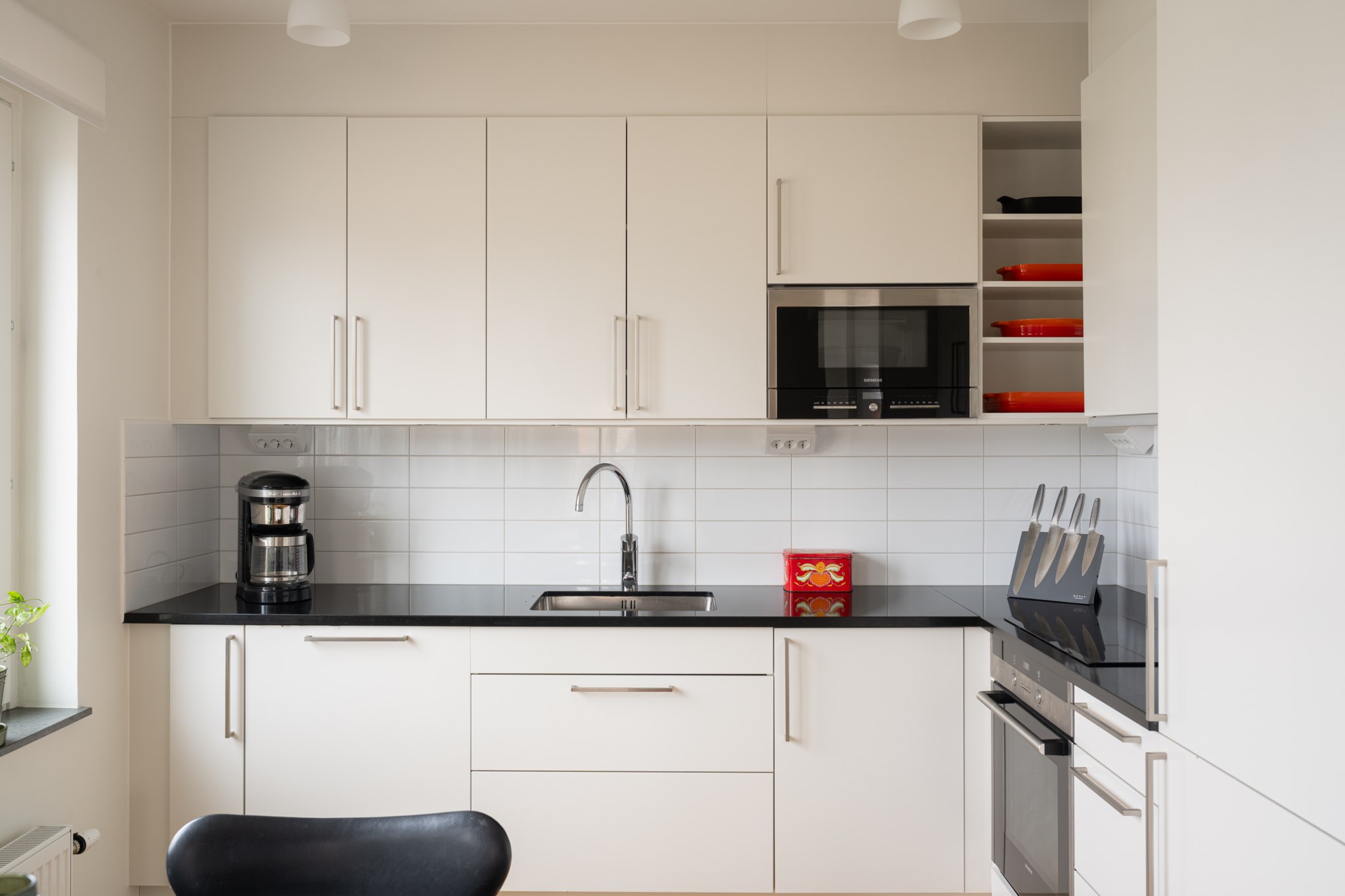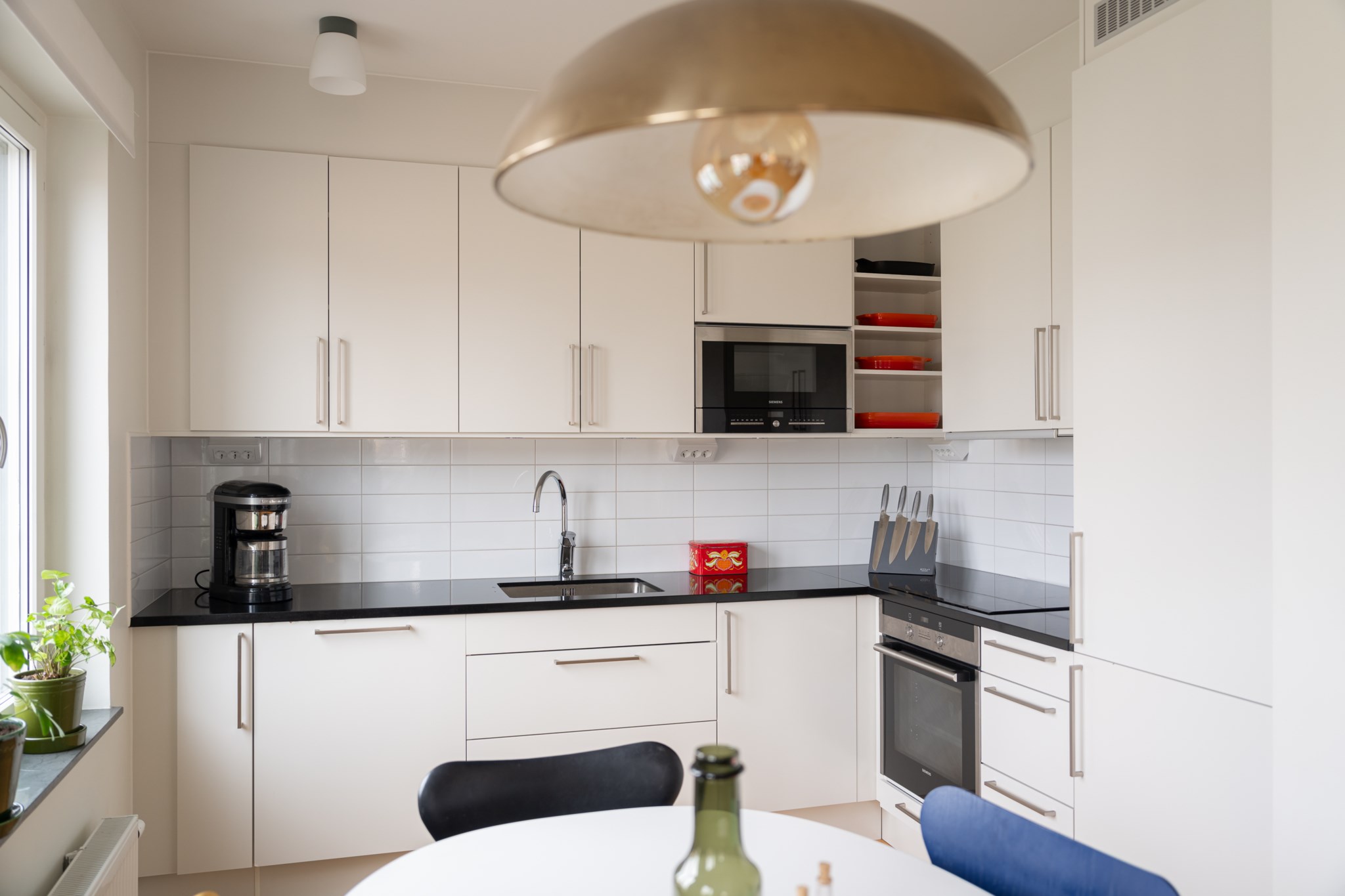 Modernt kök med smakfulla materialval bestående av ljusa köksluckor och mörk bänkskiva med stänkskydd ovan i vitt. Den maskinella utrustningen består av diskho, spis, ugn, köksfläkt, micro, diskmaskin samt kyl och frys. Här möts du av ett härligt ljusinsläpp via stora fönsterpartier och här finns även plats för en matgrupp. Tidlösa ytskikt bestående av ljusa väggar och ljust golv.
