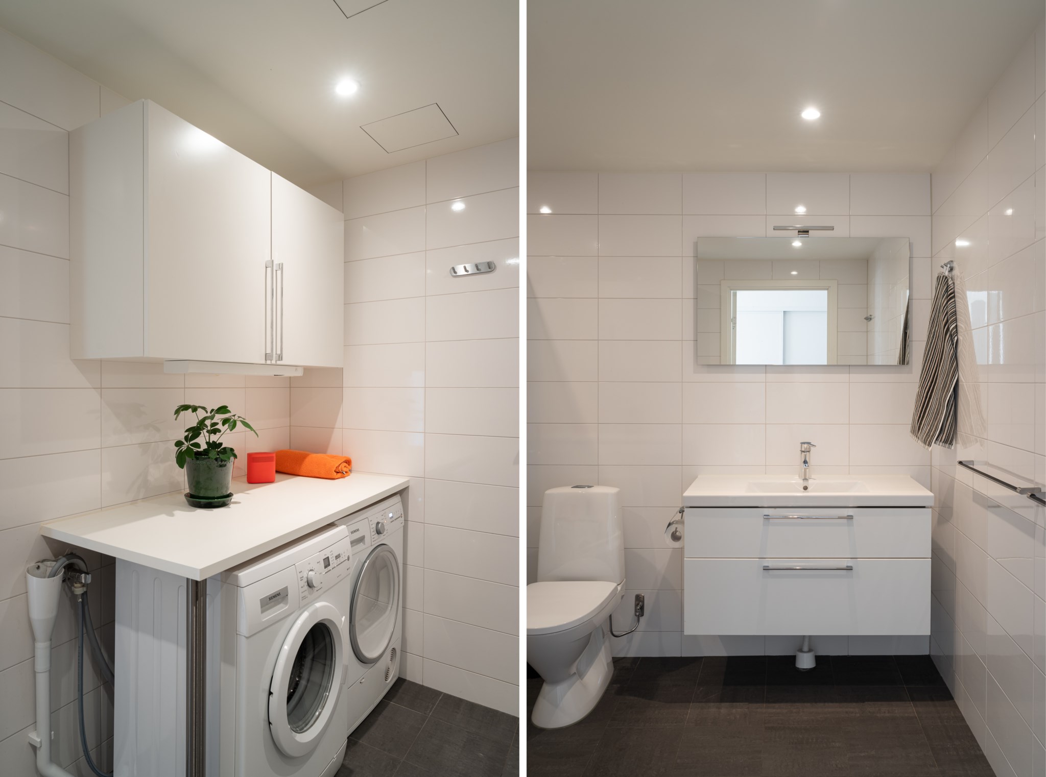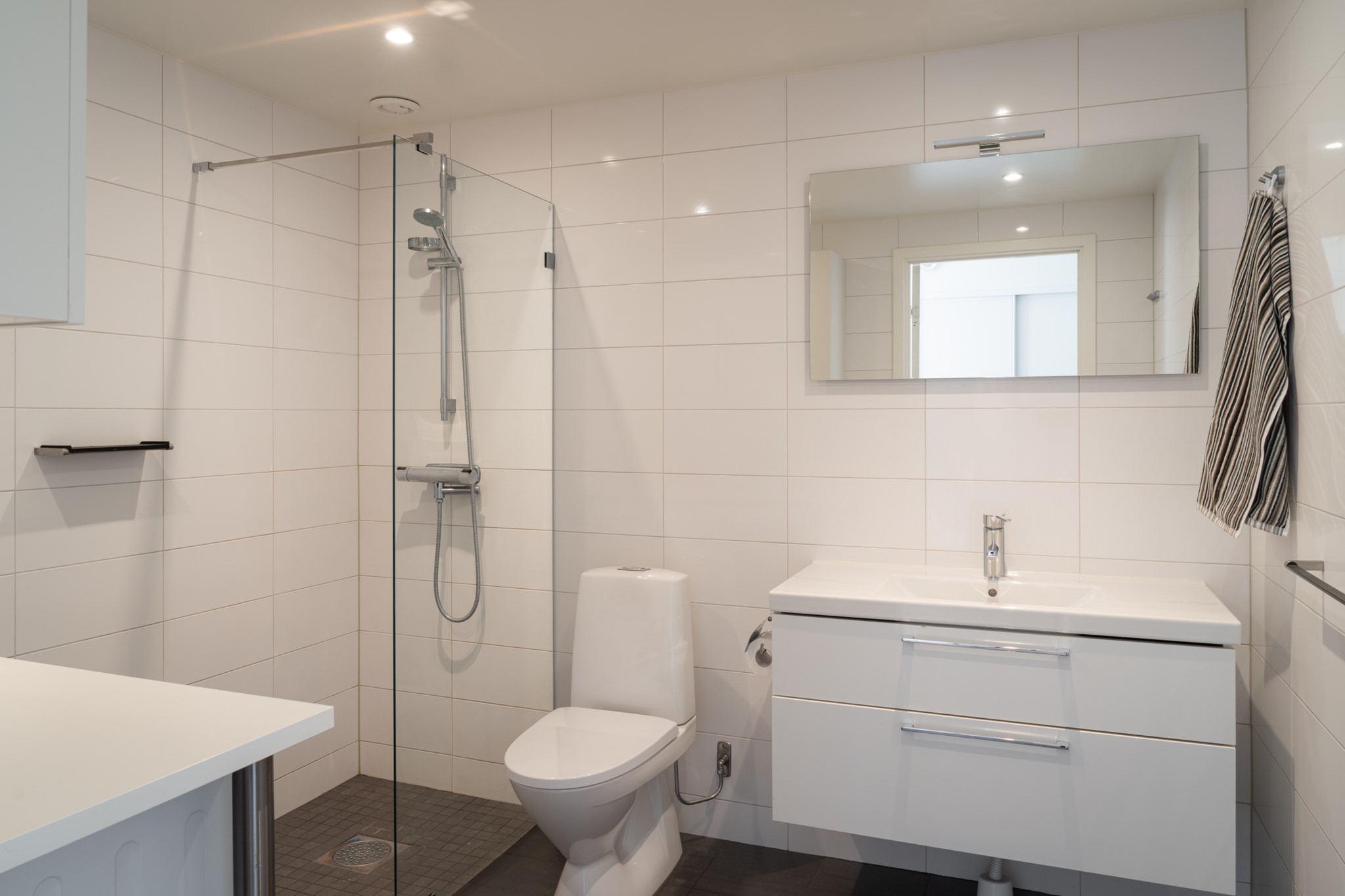 Rymligt badrum med kakel i vitt och klinker i grått. Badrummet är utrustat med WC, handdukstork, handfat ovan kommod, spegel med belysning, samt dusch med glasvägg. Extra bekvämligheter genom en tvätt och torktumlare med en arbetsbänk ovan.