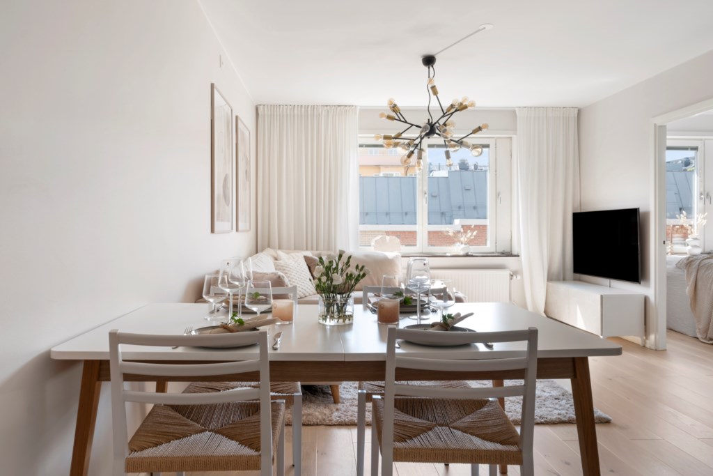 Luftigt vardagsrum med tidlösa ytskikt bestående av ljusa väggar och ljust golv. I vardagsrummet inryms matgrupp, soffa, soffbord, TV-möbel samt annat möblemang efter smak och behov. Här möts du av ett härligt ljusinsläpp via stora fönster.