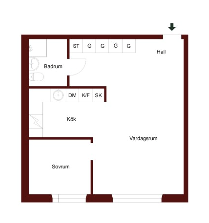 Modernt kök med smakfulla materialval bestående av vita köksluckor och ljus bänkskiva med stänkskydd ovan. Den maskinella utrustningen består av diskho, spis, ugn, köksfläkt, micro, diskmaskin samt kyl och frys. Ett härligt ljusinsläpp tar sig in via ett stort fönster in till sovrummet. Tidlösa ytskikt bestående av ljusa väggar och ljust trägolv.