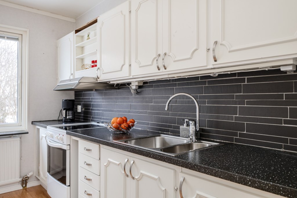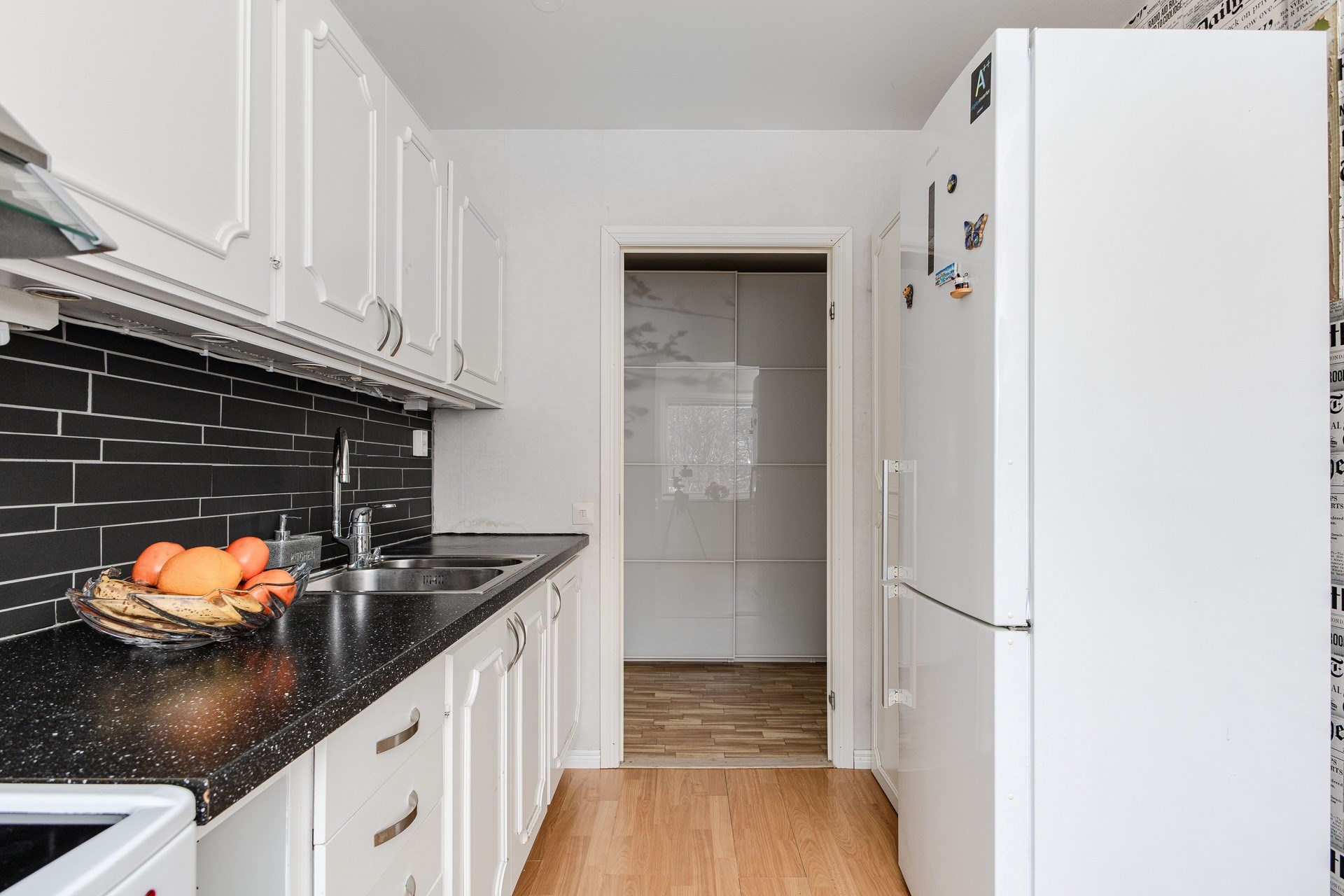 Köket är stilrent och rymligt med gott om förvaringsmöjligheter och plats för matbord, perfekt för både vardag och middagar. Badrummet är fräscht och funktionellt, och den välkomnande hallen erbjuder goda förvaringslösningar i garderober.