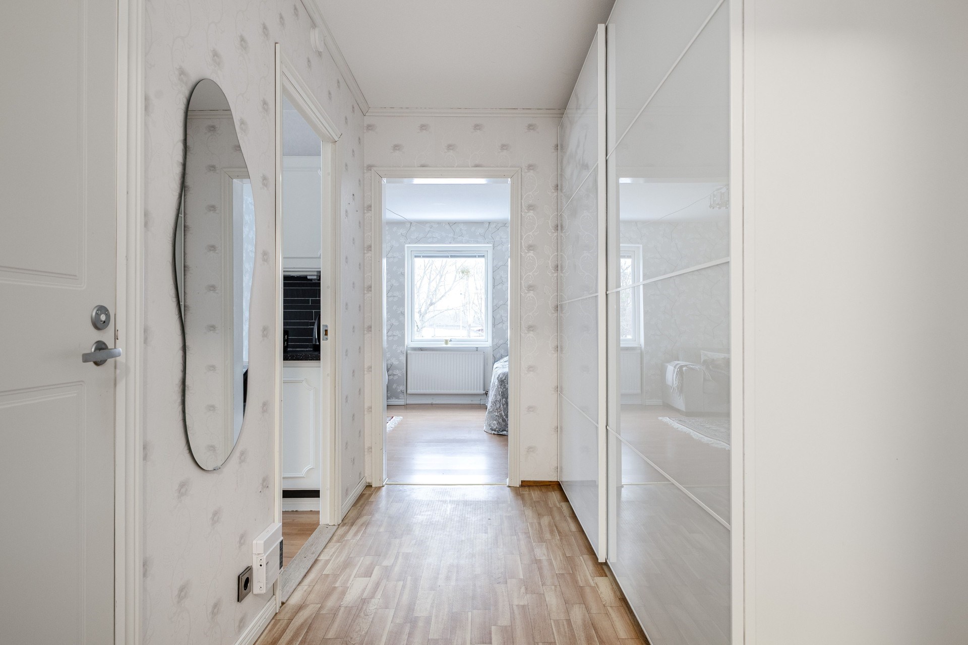 Välkomnande hall med plats för ytterkläder och skor. Stor skjutdörrsgarderob med gott om förvaringsutrymme.
