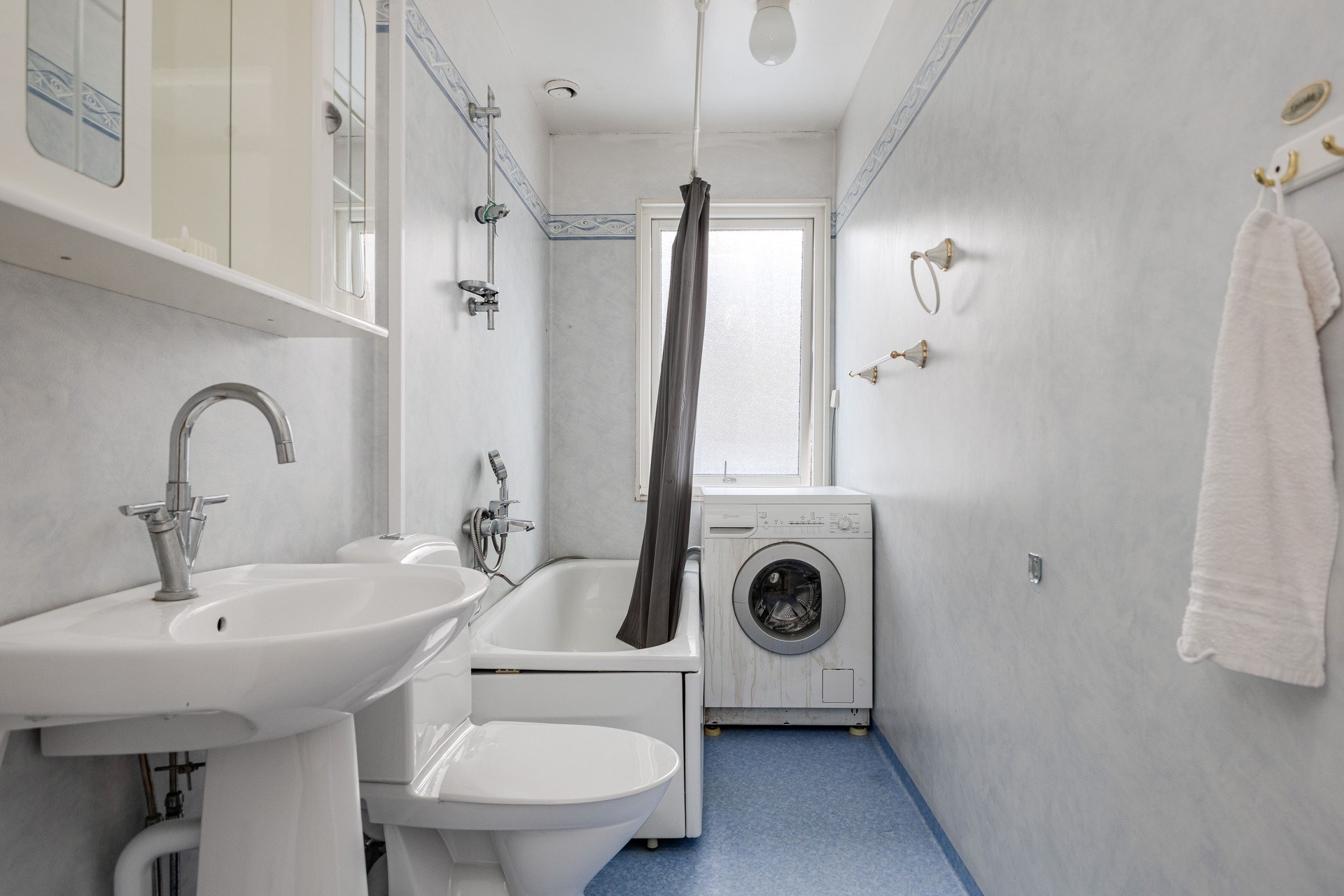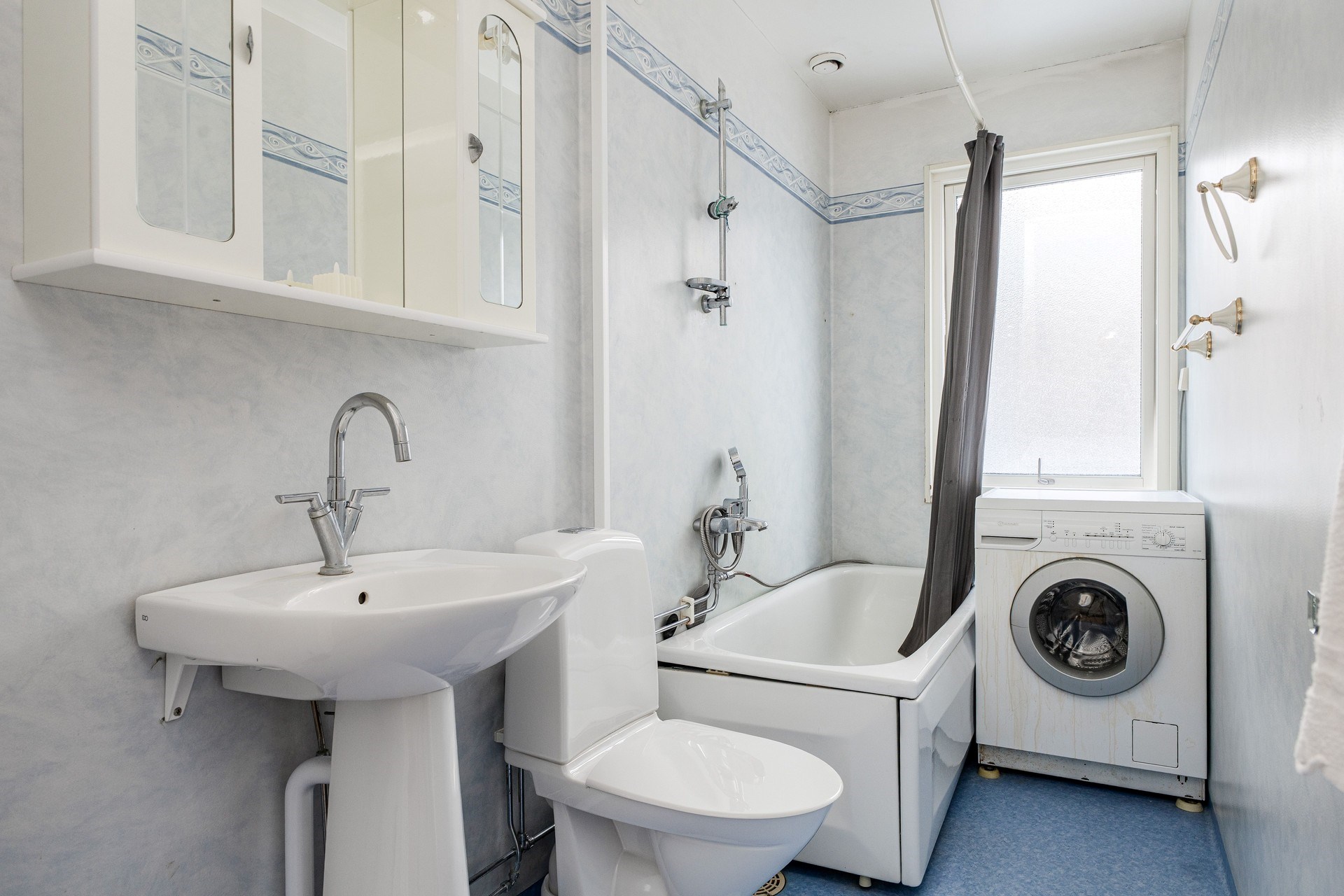 Badrum med våtrumstapet och våtrumsmatta. Handfat, spegelskåp, WC, badkar och tvättmaskin.