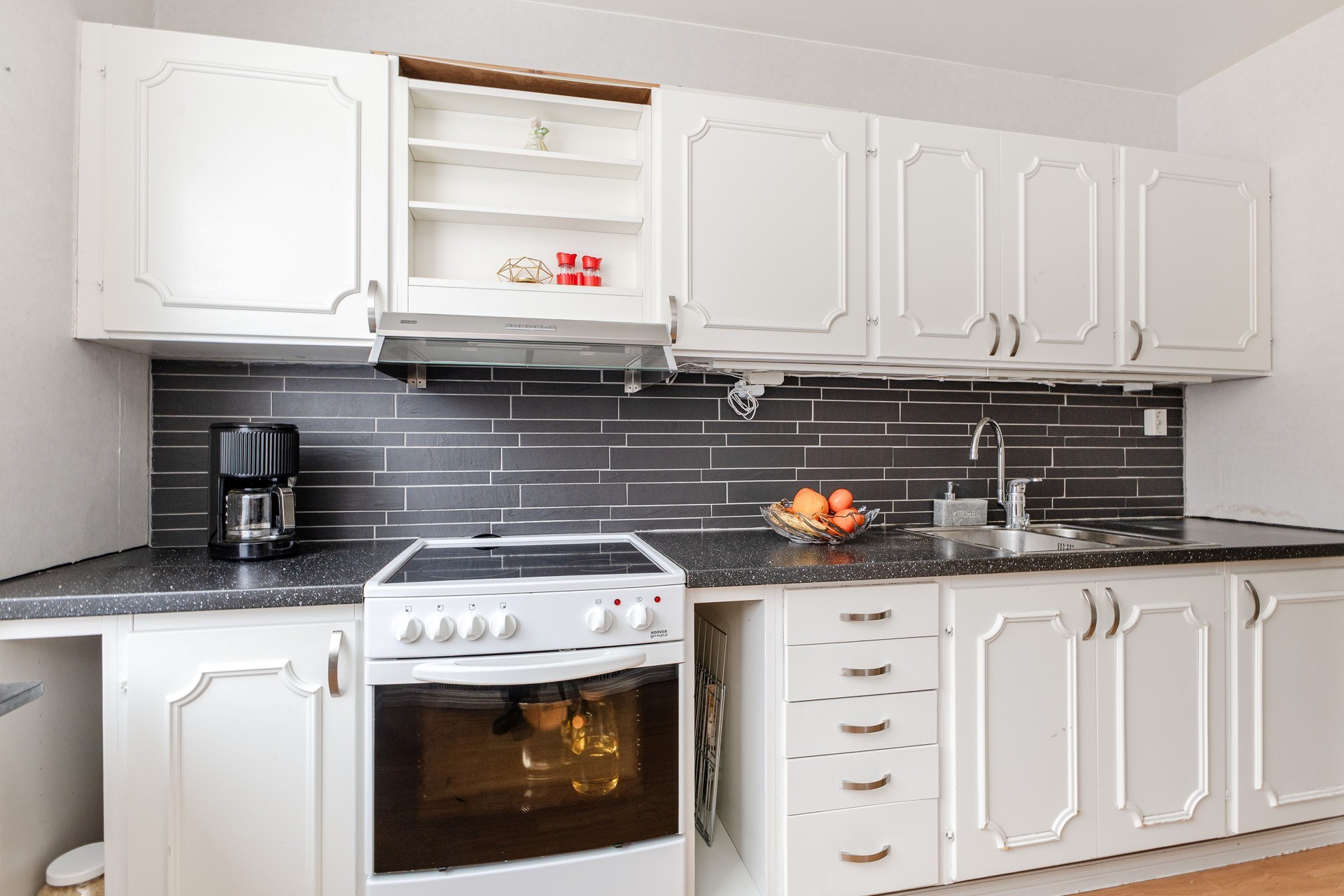 Lättarbetat kök med gott om arbetsyta, förvaring bakom ljusa skåpluckor och ljus från fönsterparti. Spis/ugn, kyl/frys och utrymme för matplats.