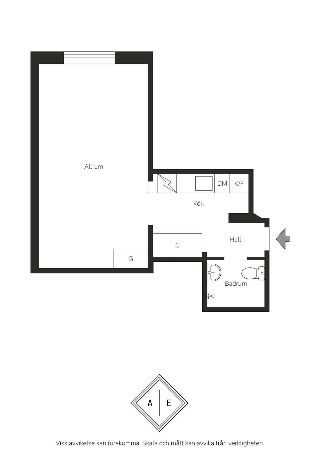 Luftigt allrum med tidlösa ytskikt bestående av ljusa väggar i en beige nyans och ljus fiskbensparkett. I allrummet inryms säng, matgrupp, soffa, soffbord, TV-möbel samt annat möblemang efter smak och behov. Här möts du av ett härligt ljusinsläpp via ett stort spröjsat fönster.