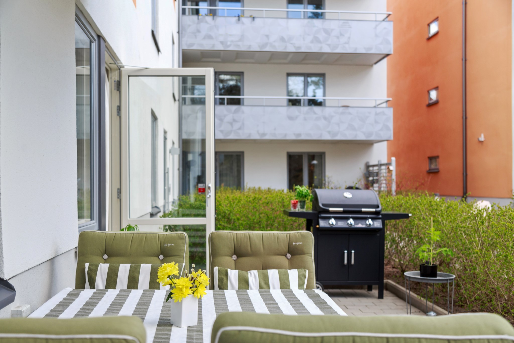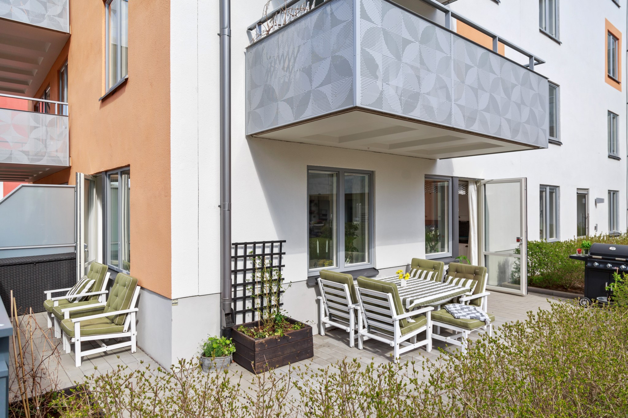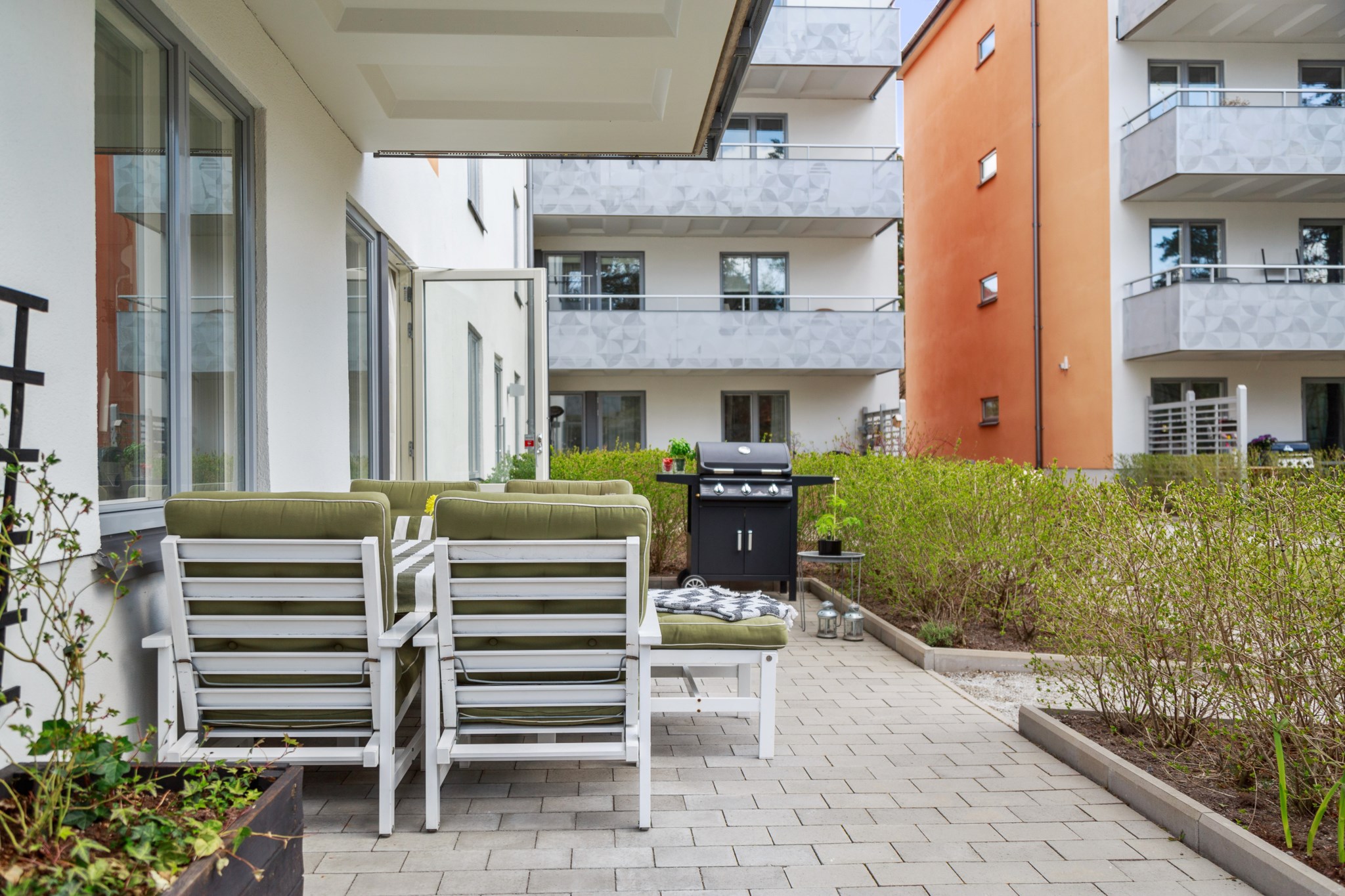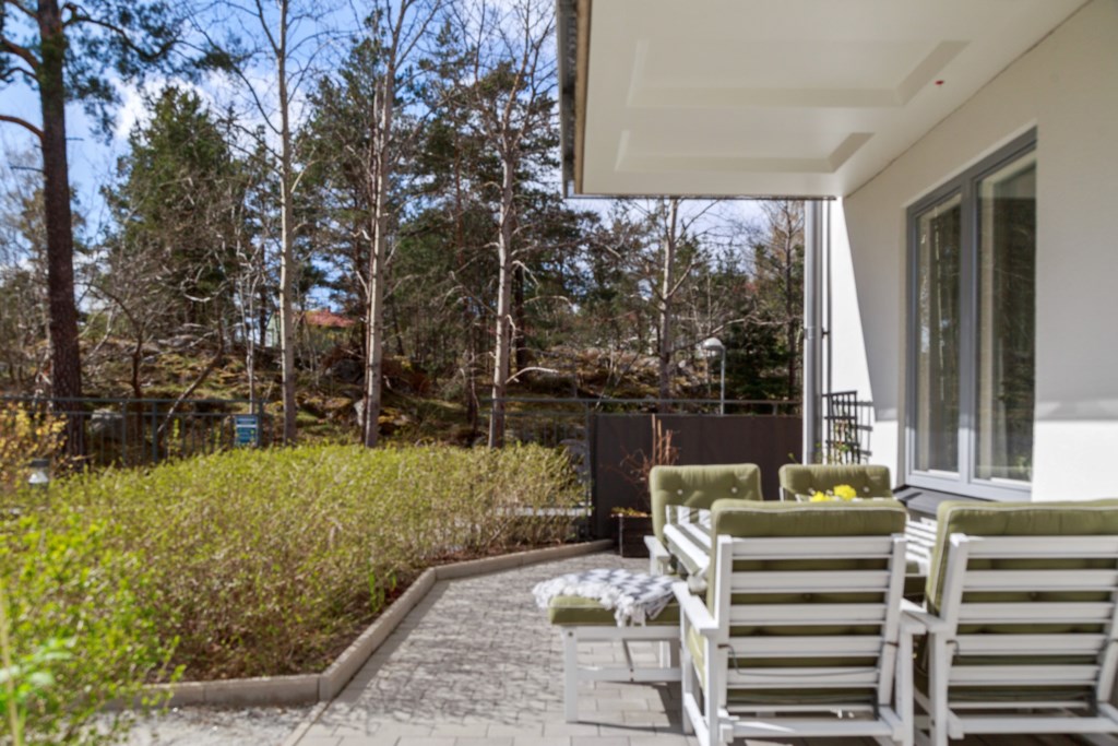 UTEPLATS | Kliv ut till bostadens fantastiska uteplats om totalt 30kvm stenlagd i två vinklar som ligger i bästa solläge! Här behöver du inte välja mellan loungegrupp och cafégrupp - här får du plats för båda och lite till. Med sol hela dagen under sommaren kommer du vilja spendera många timmar här ute. Med utgång från både vardagsrum och kök kan du enkelt förbereda ingredienserna i köket och grilla på uteplatsen som man tillåts använda gasolgrill på!