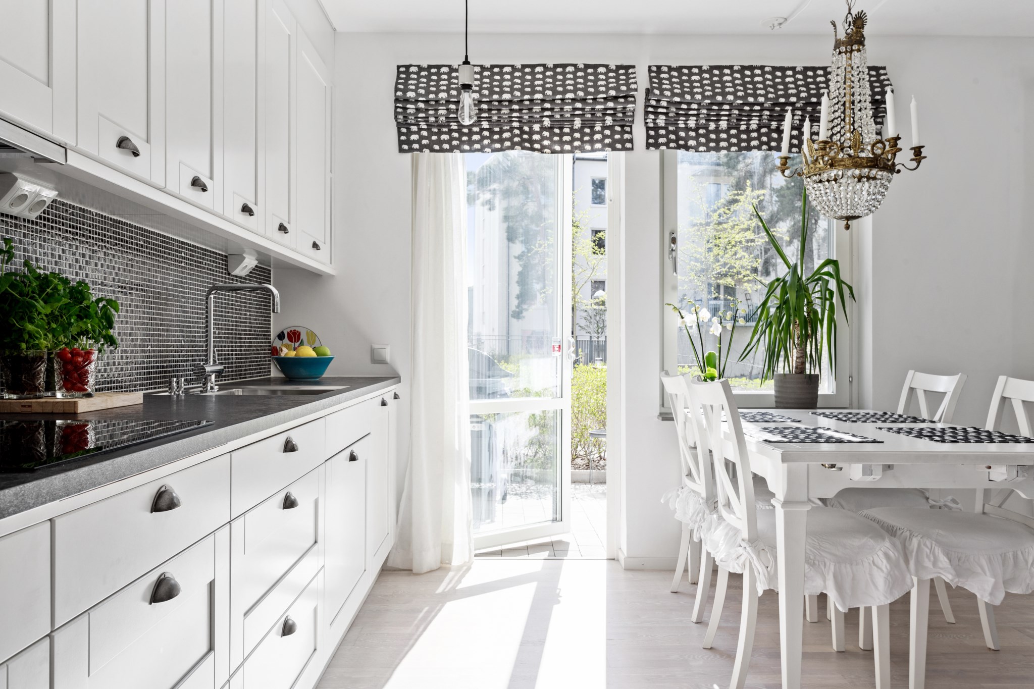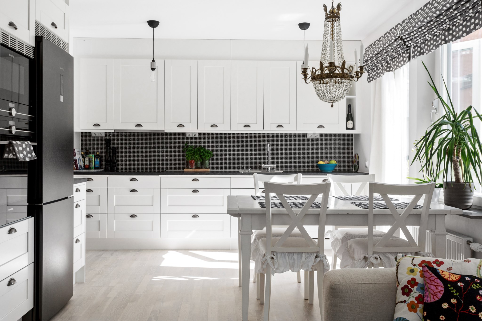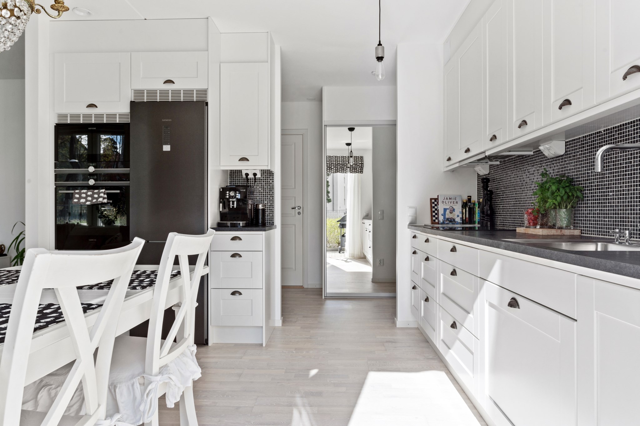 KÖK | Stort fullutrustat kök i vita och svarta kontraster från Vedum och maskinell utrustning från kvalitetsmärket Siemens. Här finns ugn, mikrovågsugn, häll, fläkt, integrerad diskmaskin samt kyl/frys. Den optimala planlösningen gör att du har gott om arbetsyta samtidigt som det finns plats för matsalsgrupp för 4-6 personer intill fönstret.
